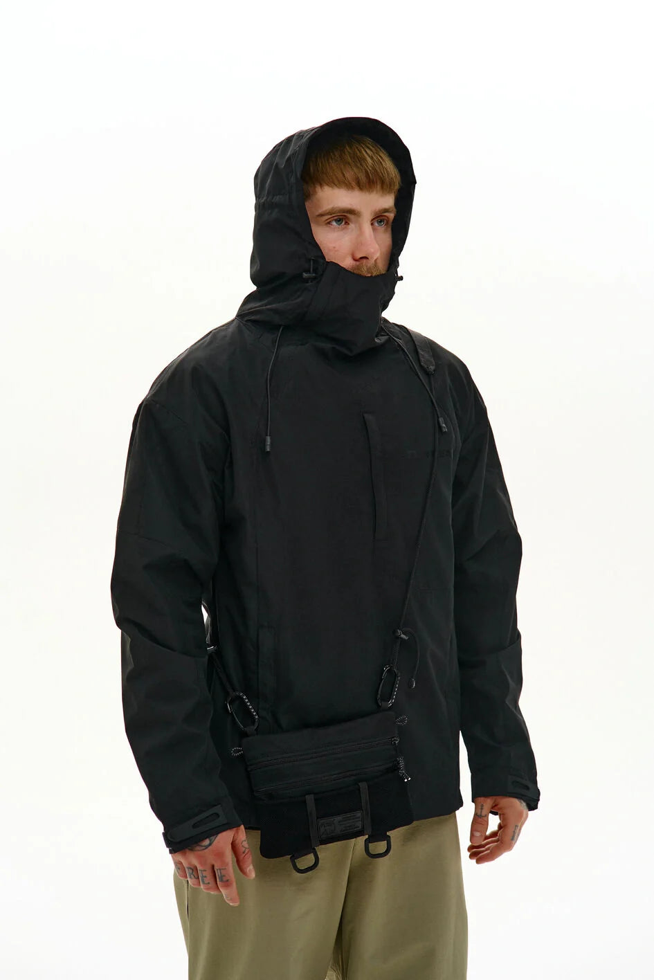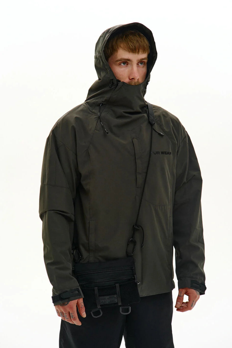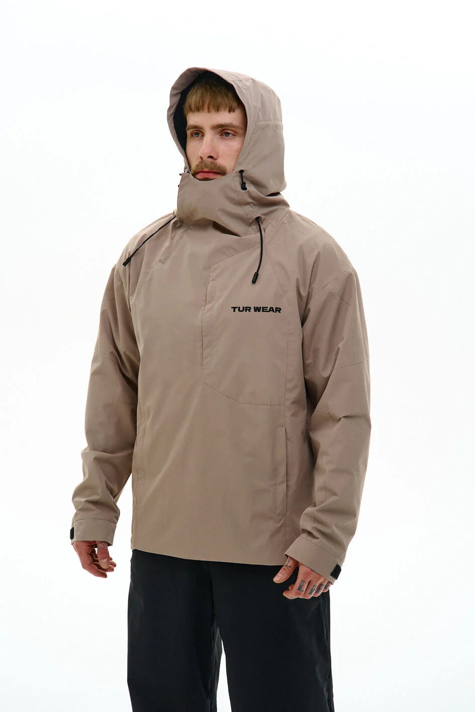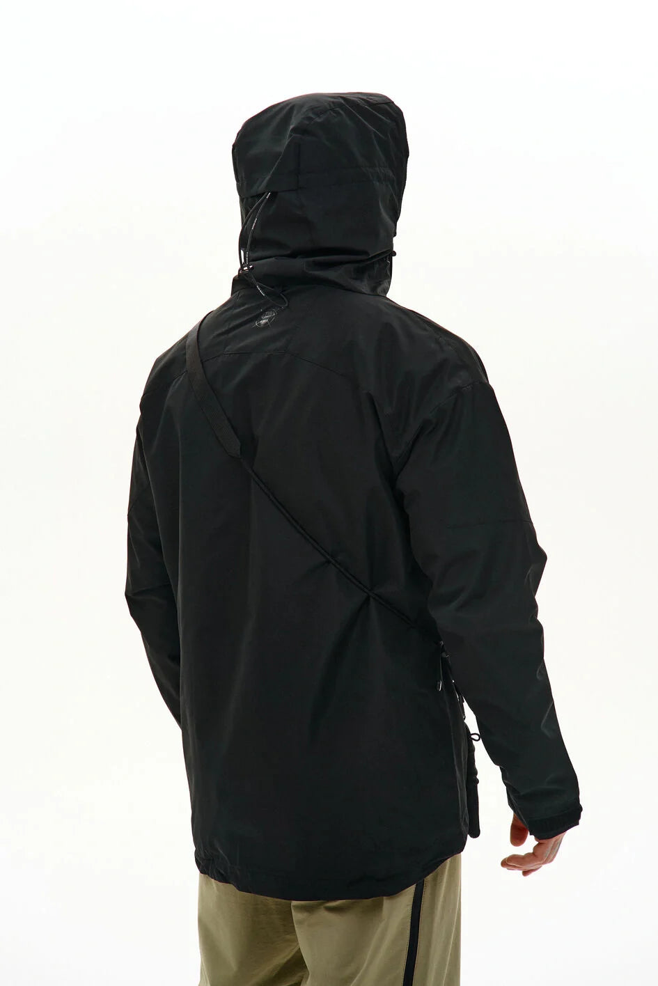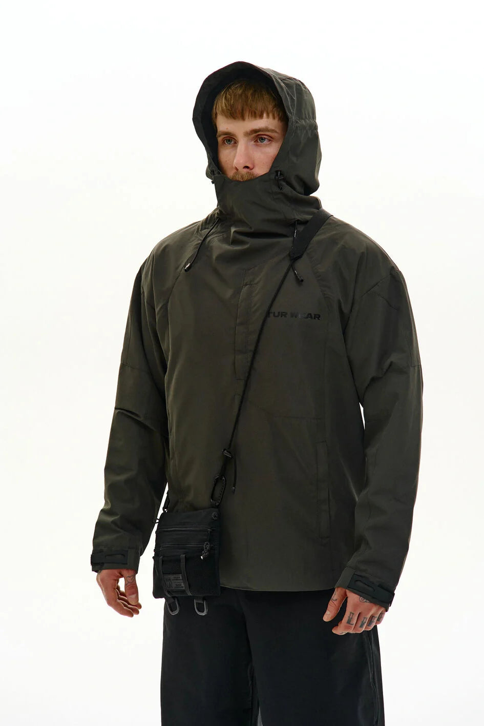 Asymmetrical-cut anorak made of membrane raincoat fabric. Lightweight, comfortable lining. Anatomical sleeves, hook-and-loop cuffs, hood with visor. Asymmetrical zipper on the right side. Chest pocket and kangaroo pocket — both with zippers. Adjustable hood (vertically and horizontally). Drawcord at the hem to regulate width.