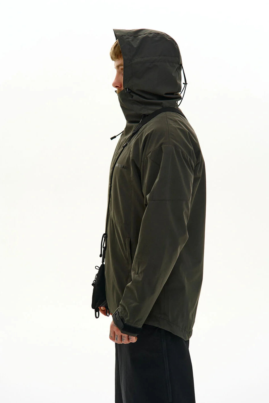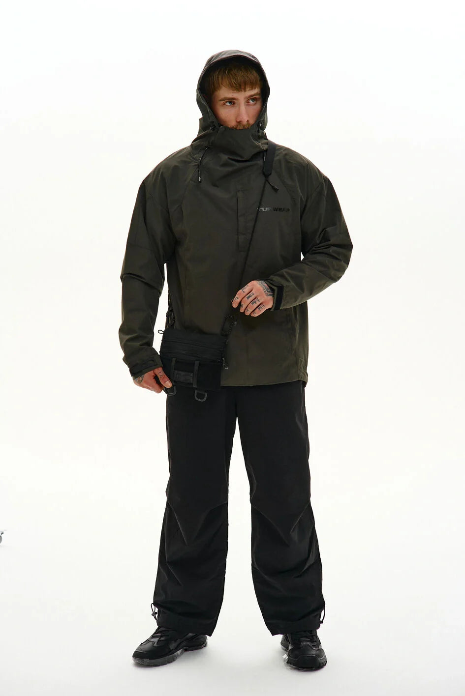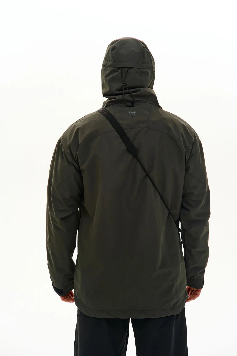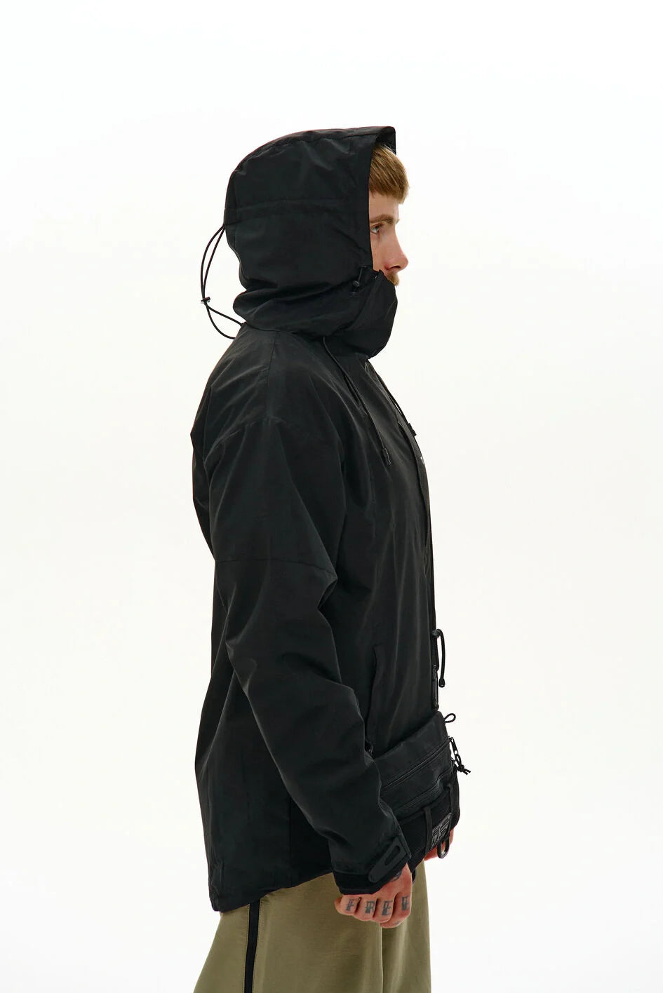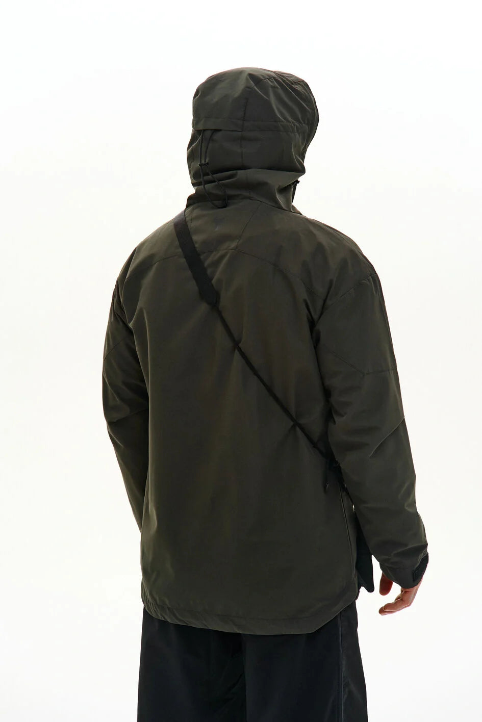 Asymmetrical-cut anorak made of membrane raincoat fabric. Lightweight, comfortable lining. Anatomical sleeves, hook-and-loop cuffs, hood with visor. Asymmetrical zipper on the right side. Chest pocket and kangaroo pocket — both with zippers. Adjustable hood (vertically and horizontally). Drawcord at the hem to regulate width.