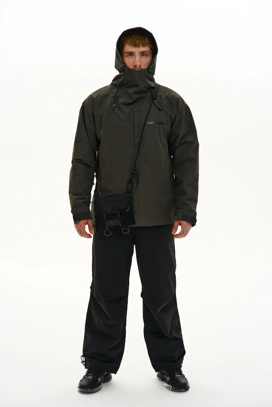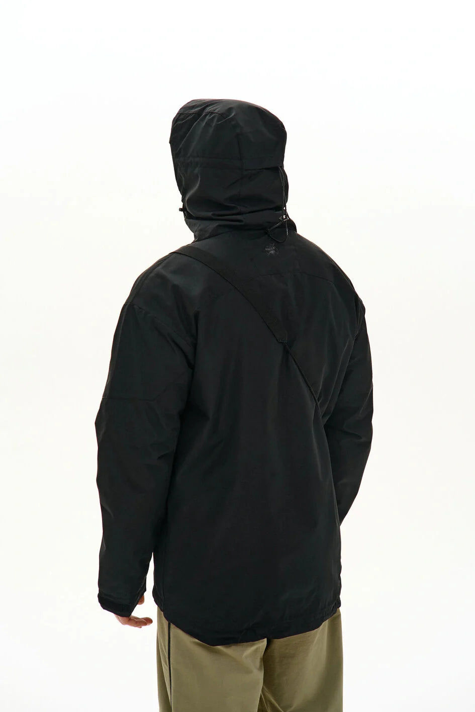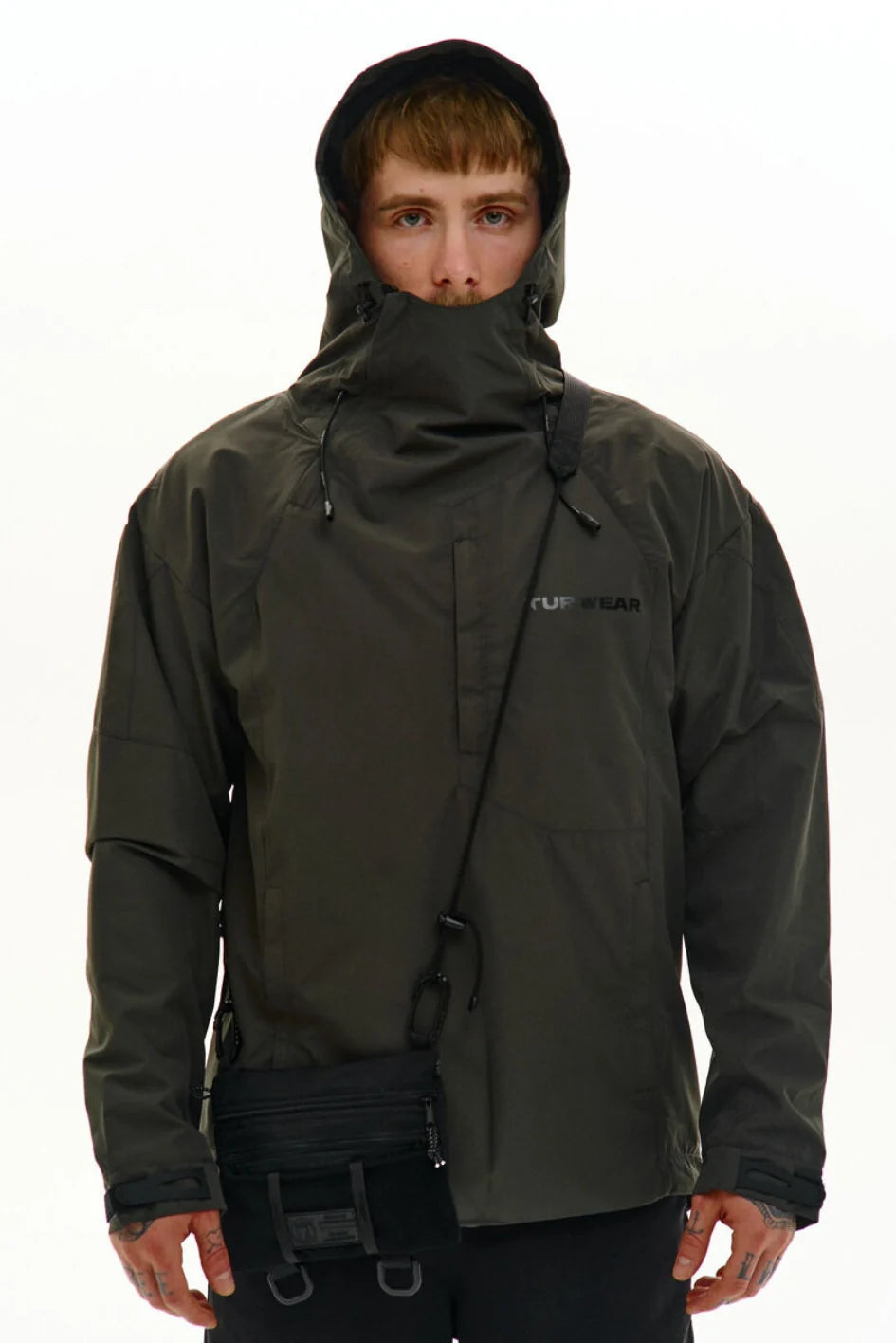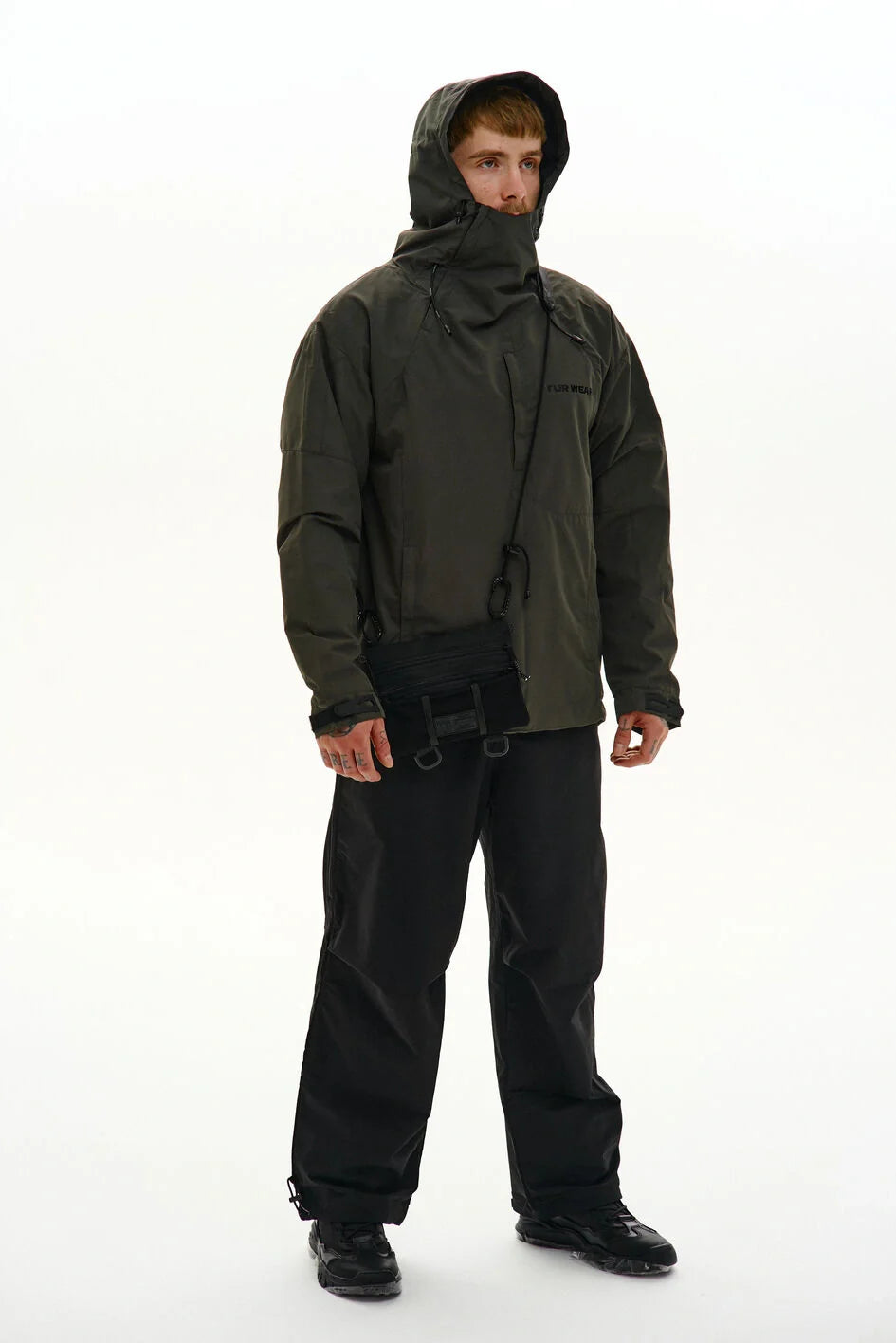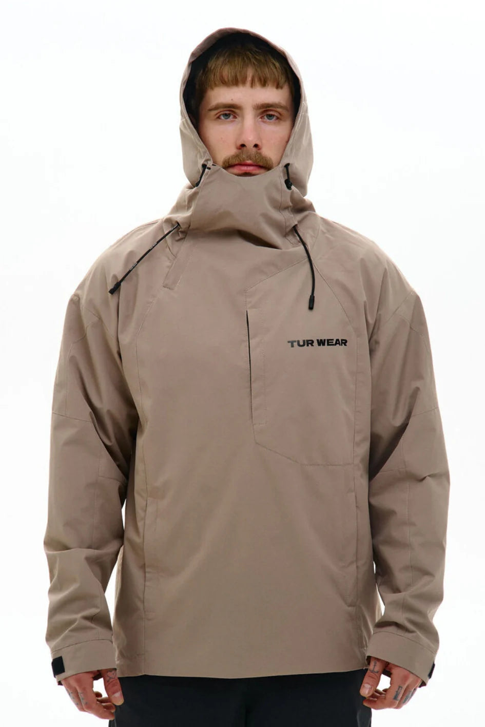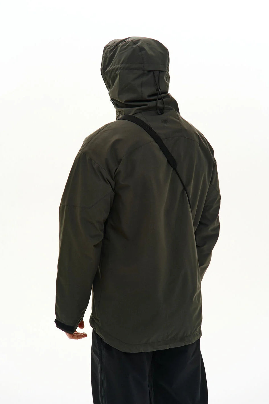 Asymmetrical-cut anorak made of membrane raincoat fabric. Lightweight, comfortable lining. Anatomical sleeves, hook-and-loop cuffs, hood with visor. Asymmetrical zipper on the right side. Chest pocket and kangaroo pocket — both with zippers. Adjustable hood (vertically and horizontally). Drawcord at the hem to regulate width.