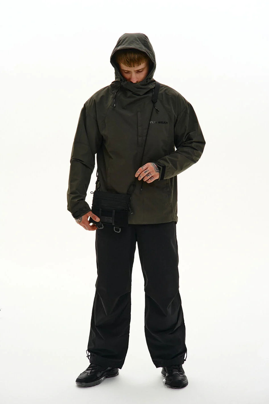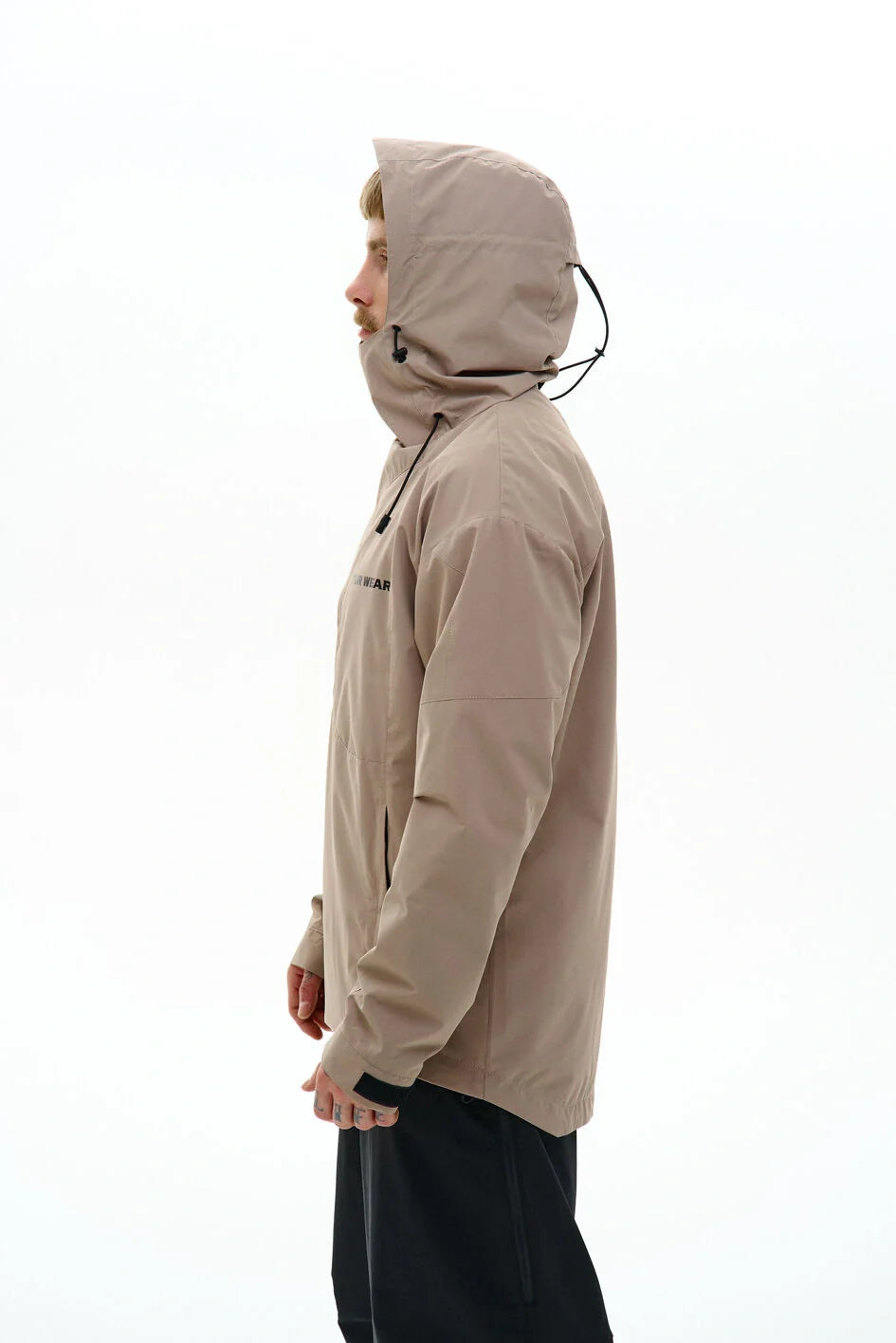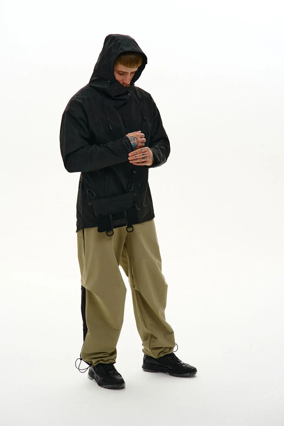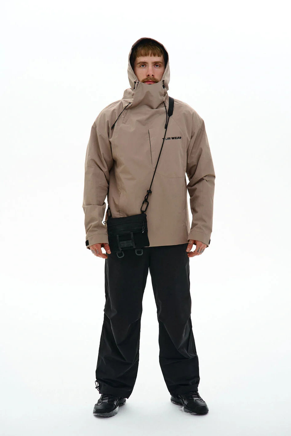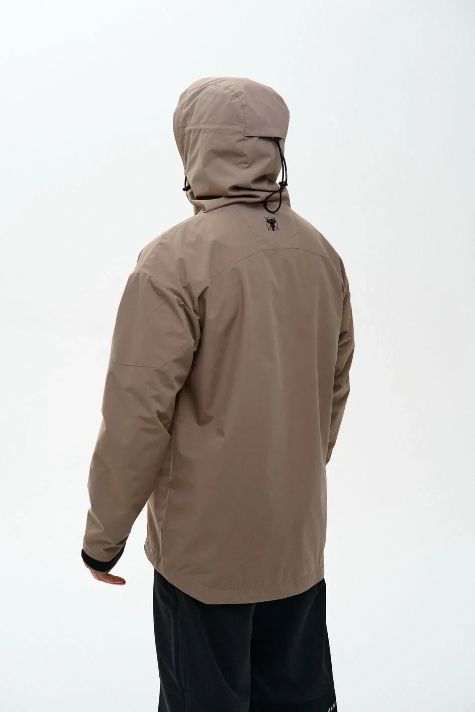 Asymmetrical-cut anorak made of membrane raincoat fabric. Lightweight, comfortable lining. Anatomical sleeves, hook-and-loop cuffs, hood with visor. Asymmetrical zipper on the right side. Chest pocket and kangaroo pocket — both with zippers. Adjustable hood (vertically and horizontally). Drawcord at the hem to regulate width.