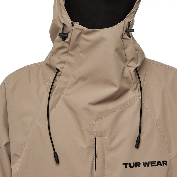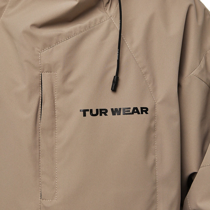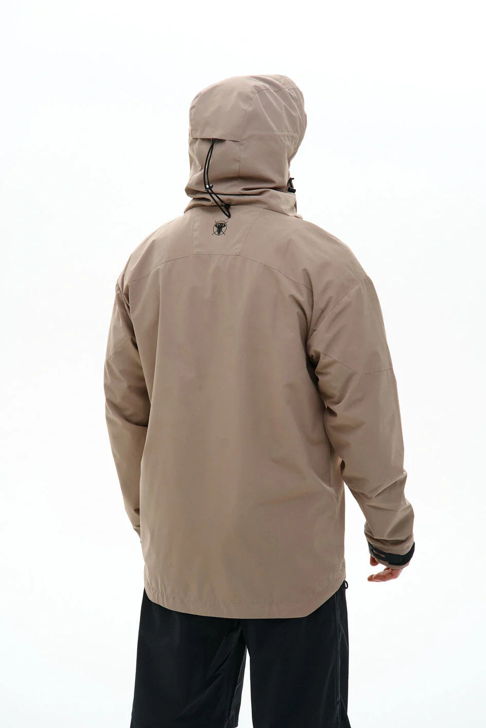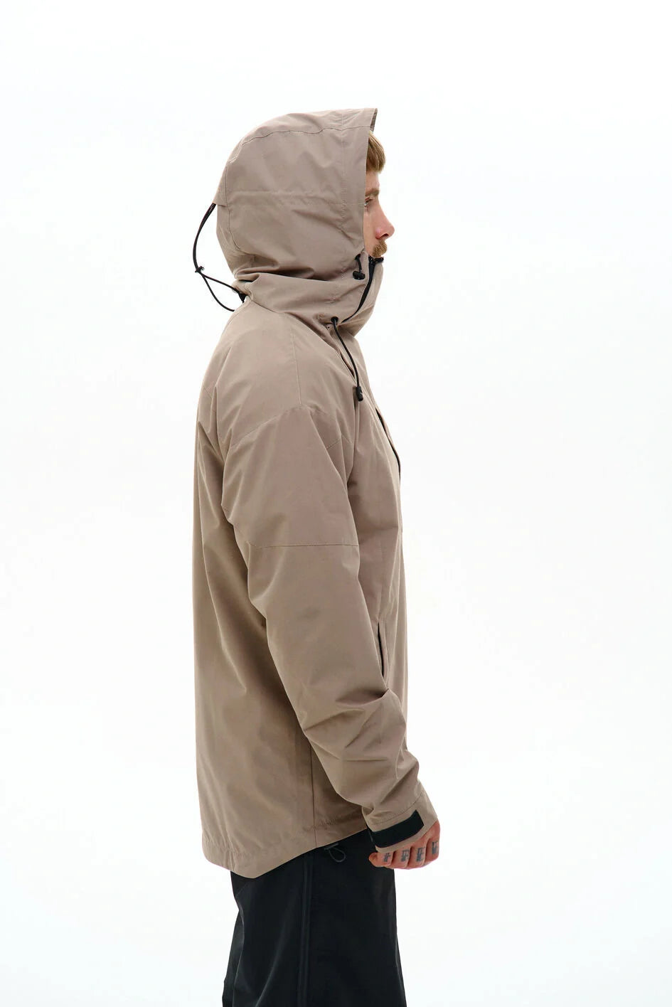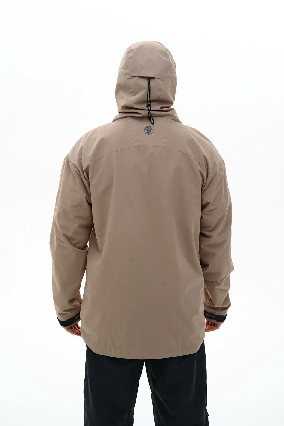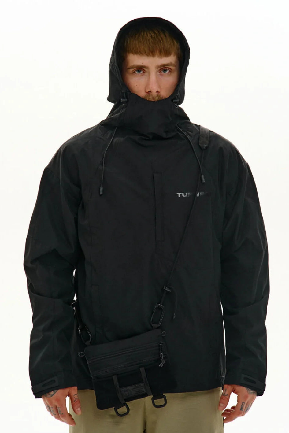 Asymmetrical-cut anorak made of membrane raincoat fabric. Lightweight, comfortable lining. Anatomical sleeves, hook-and-loop cuffs, hood with visor. Asymmetrical zipper on the right side. Chest pocket and kangaroo pocket — both with zippers. Adjustable hood (vertically and horizontally). Drawcord at the hem to regulate width.
