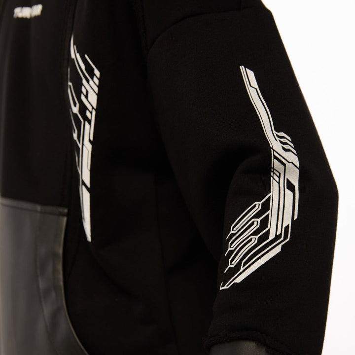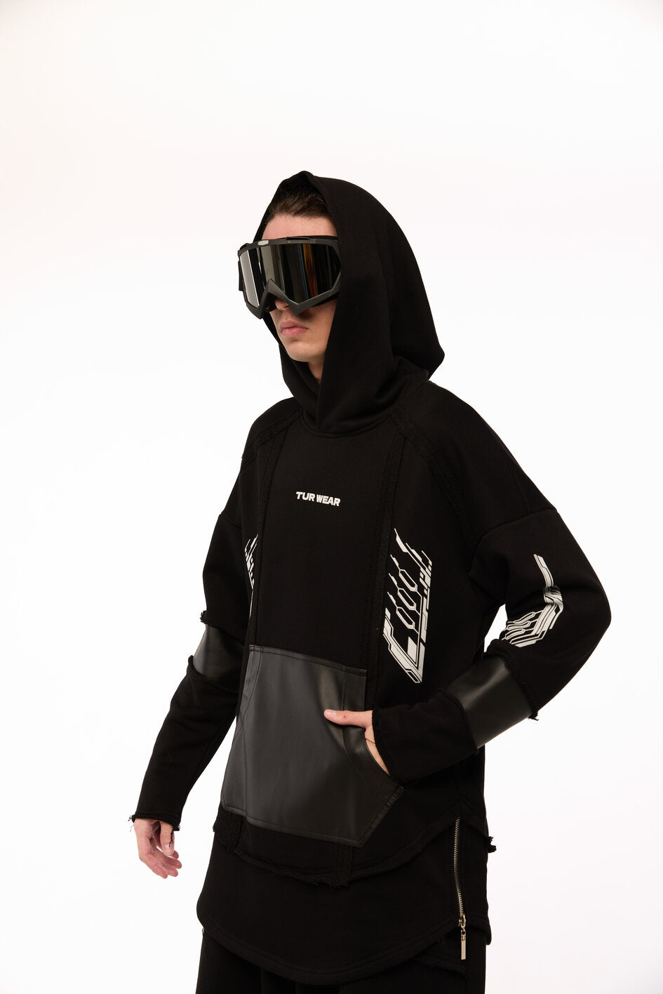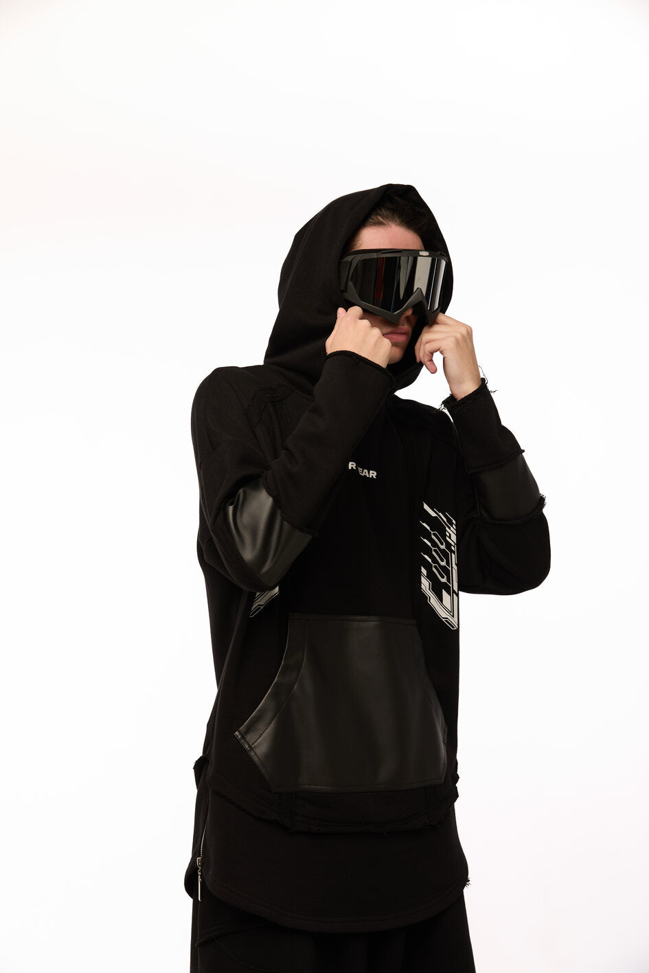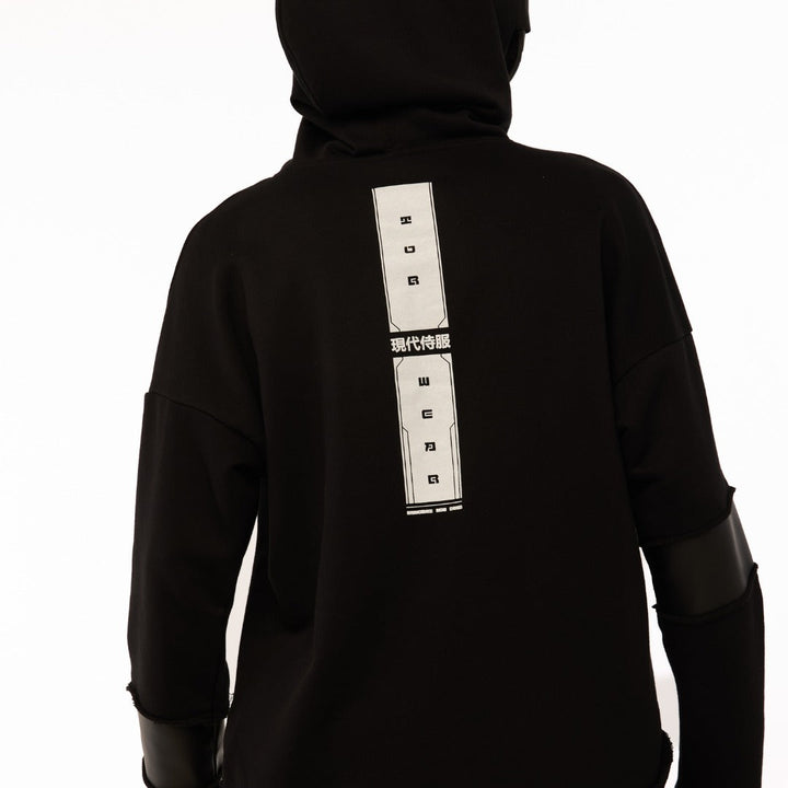 An oversized hoodie with decorative seams, raw edges, and a layered construction — for those who choose rebellion as their style. The patch pocket and artificial leather inserts on the sleeves add an edgy accent. The double-layered bottom: the upper layer has raw edges, while the lower layer is hemmed with slits, into which metal zippers are sewn. Five white prints: on the front, back, and sleeves — a visual manifesto of strength. The oversized hood has a reference to a mantle silhouette, as if preparing for transformation. Street, cyber, and the spirit of the samurai — all in one garment.
