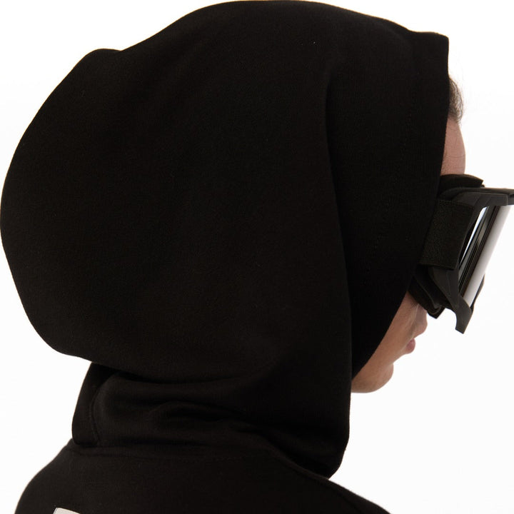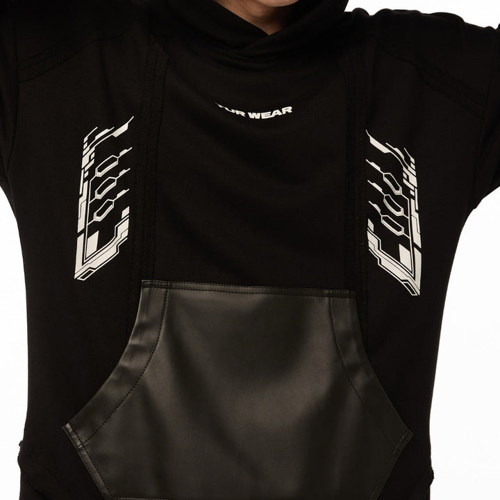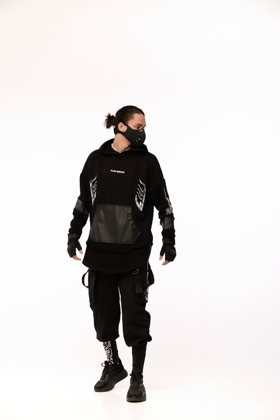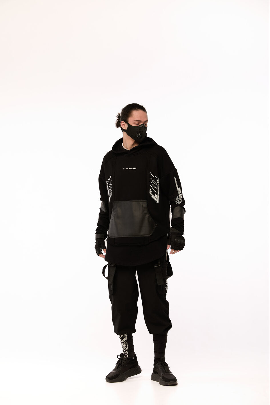 An oversized hoodie with decorative seams, raw edges, and a layered construction — for those who choose rebellion as their style. The patch pocket and artificial leather inserts on the sleeves add an edgy accent. The double-layered bottom: the upper layer has raw edges, while the lower layer is hemmed with slits, into which metal zippers are sewn. Five white prints: on the front, back, and sleeves — a visual manifesto of strength. The oversized hood has a reference to a mantle silhouette, as if preparing for transformation. Street, cyber, and the spirit of the samurai — all in one garment.