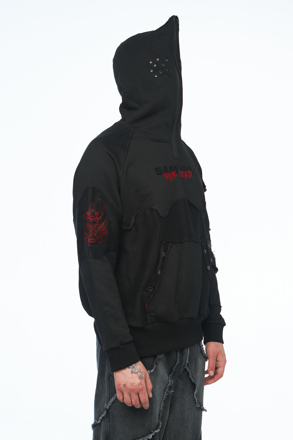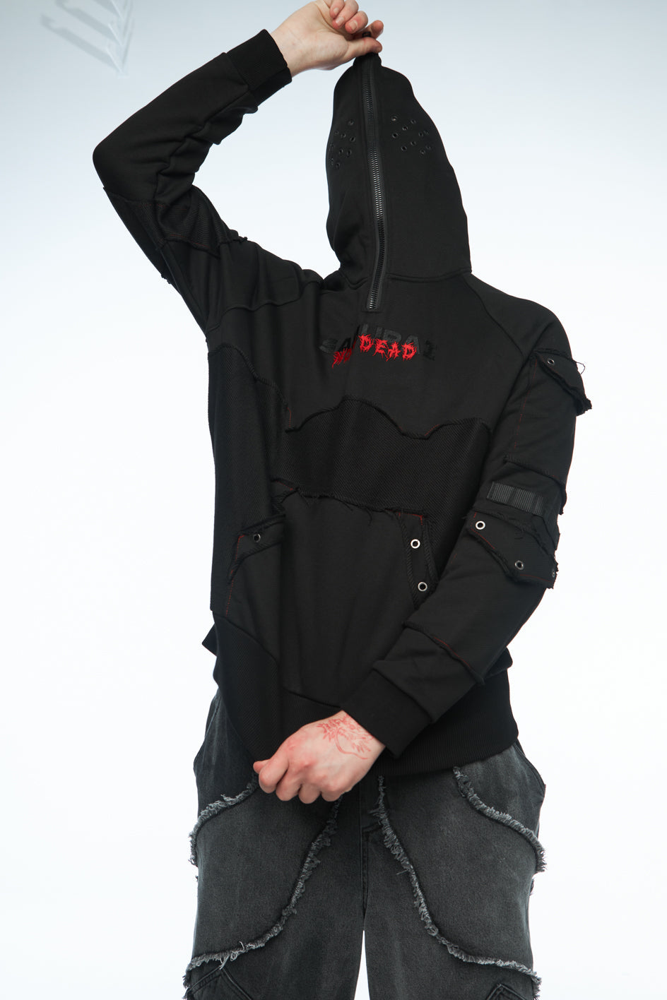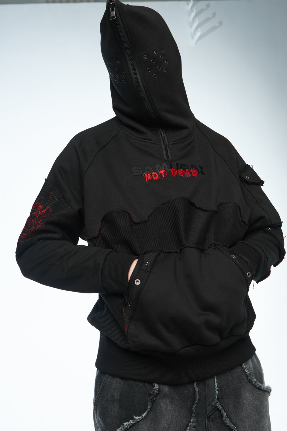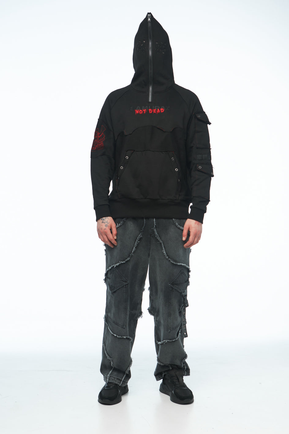 A hoodie made from dense cotton with an oversized fit — an explosion of textures, details, and a rebellious vibe. Metal eyelets, straps, raw edges, patch pockets, and red embroidery create a silhouette that speaks louder than words. The zipper runs along the neckline and transforms into the hood, turning the hoodie into a true survival mask for urban jungles. "SAMURAI NOT DEAD" is not just a slogan, but a state of mind.