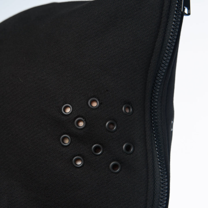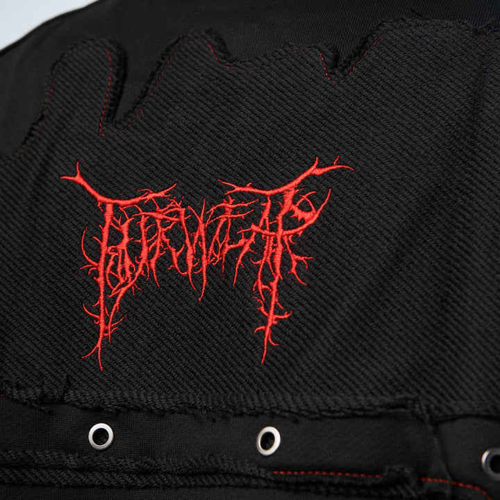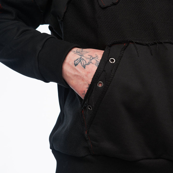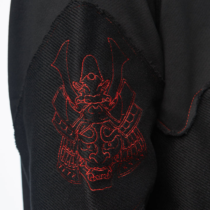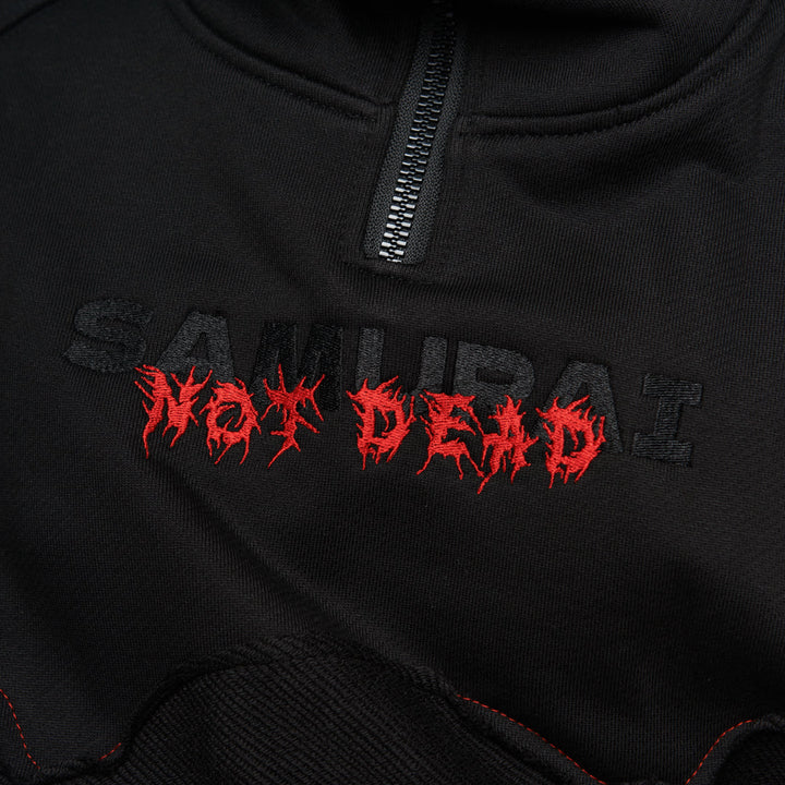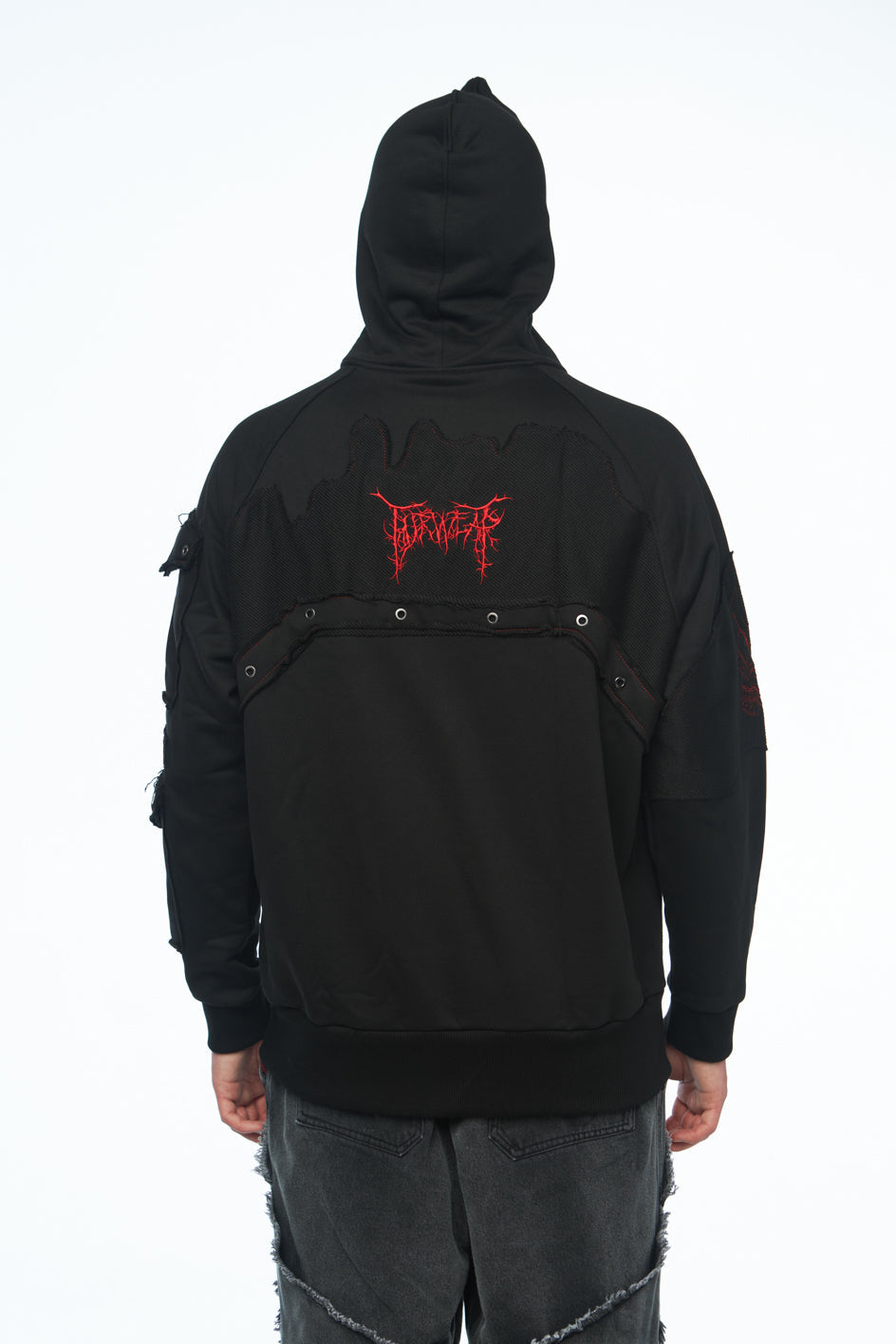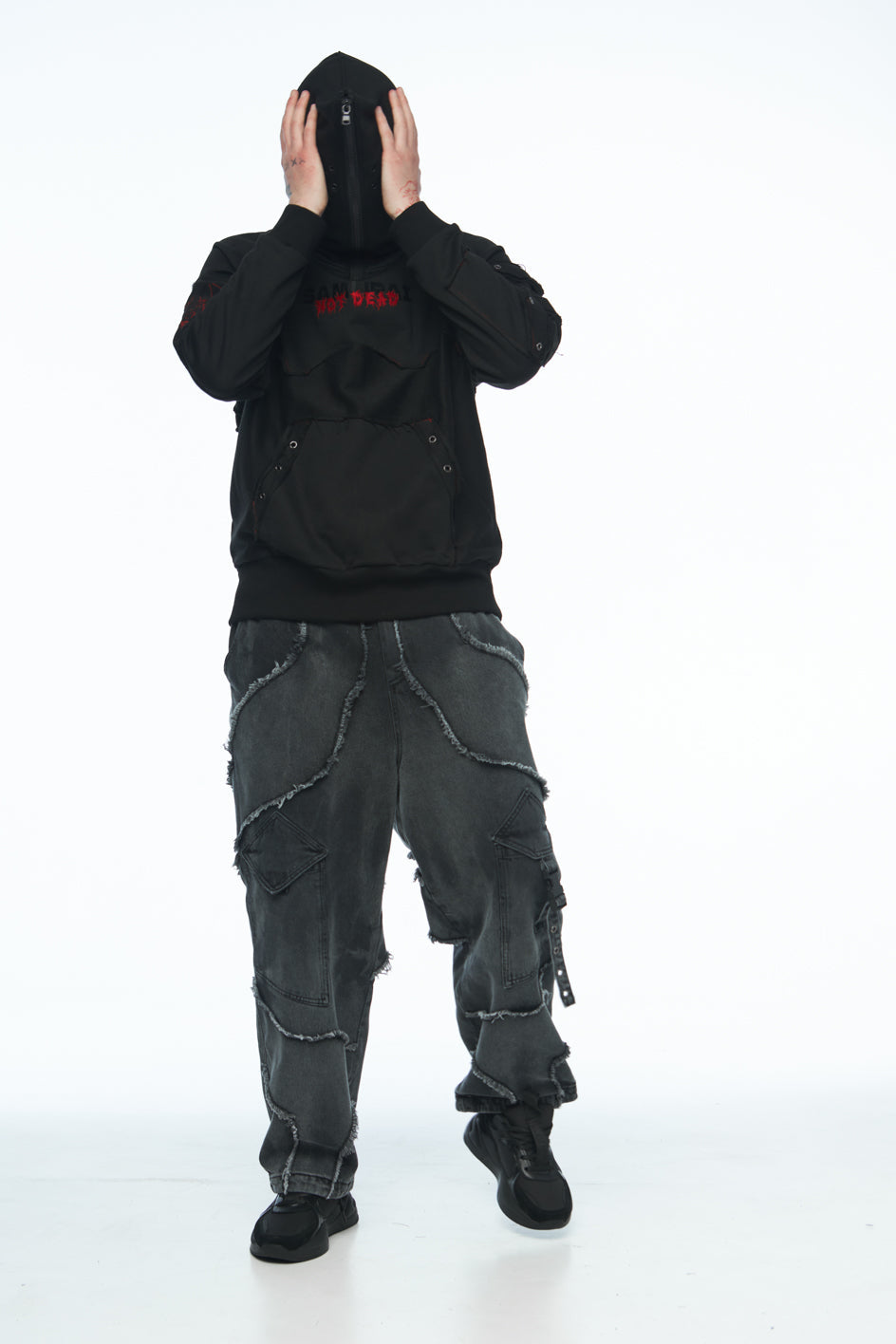A hoodie made from dense cotton with an oversized fit — an explosion of textures, details, and a rebellious vibe. Metal eyelets, straps, raw edges, patch pockets, and red embroidery create a silhouette that speaks louder than words. The zipper runs along the neckline and transforms into the hood, turning the hoodie into a true survival mask for urban jungles. "SAMURAI NOT DEAD" is not just a slogan, but a state of mind.