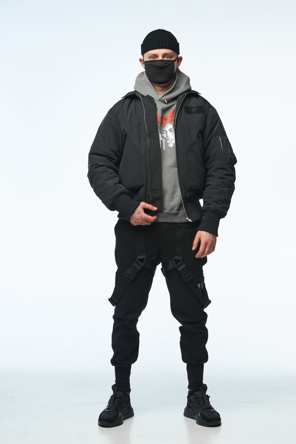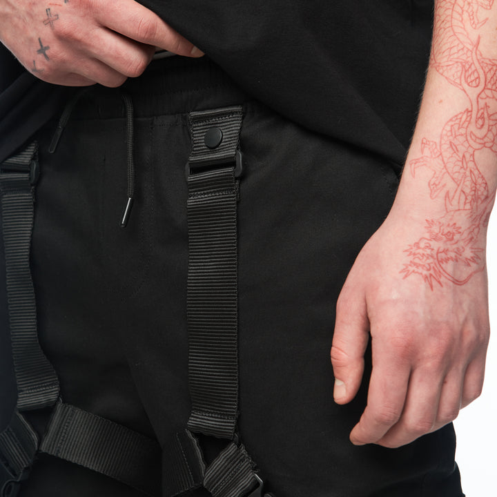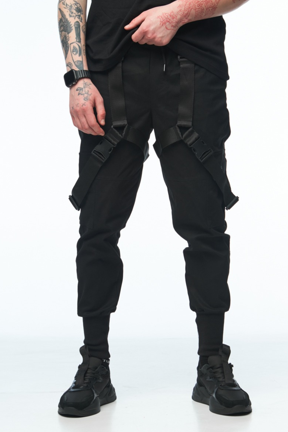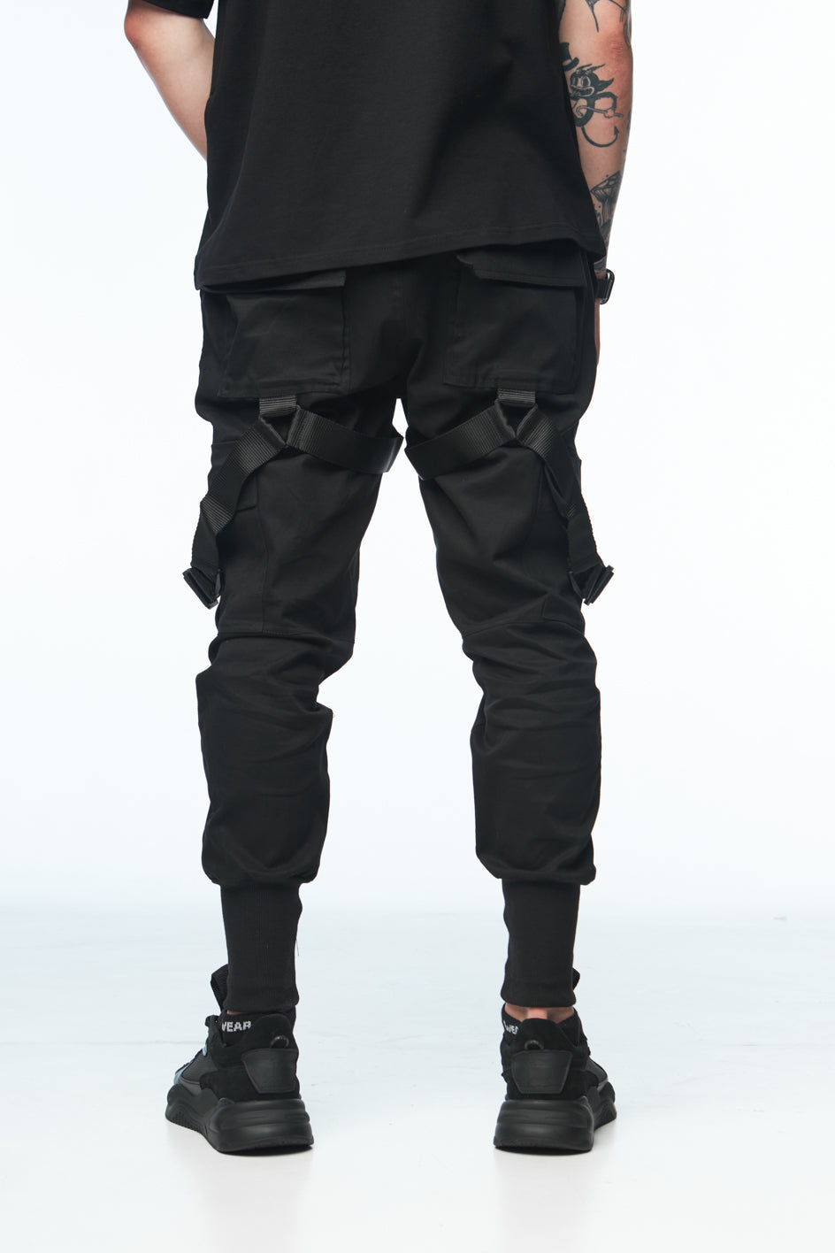 Decorative straps sewn from the waistband to the back pockets add a rugged silhouette and reference tactical aesthetics — perfect for navigating the concrete jungle.