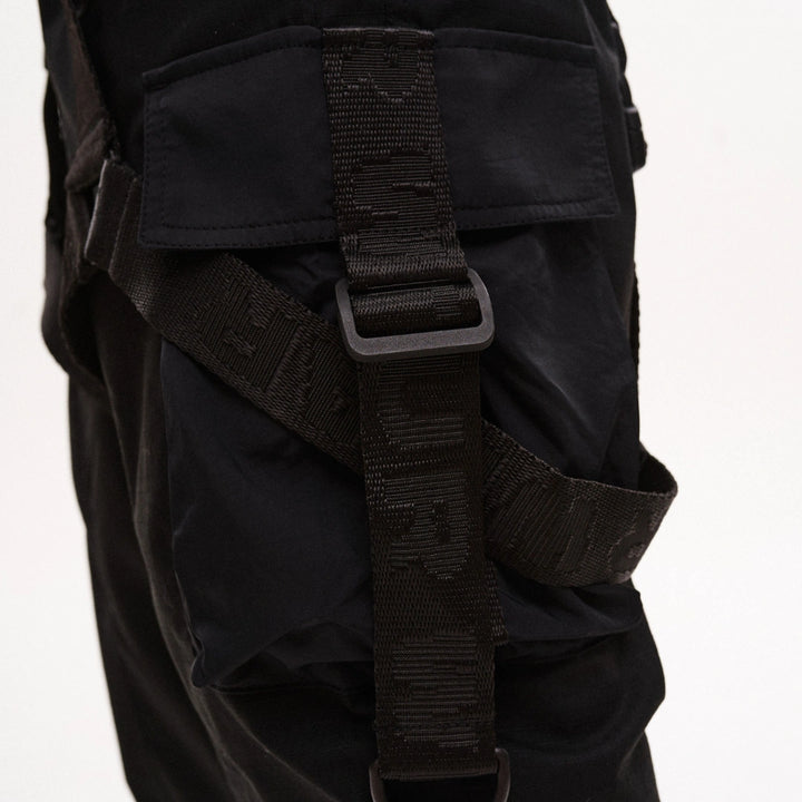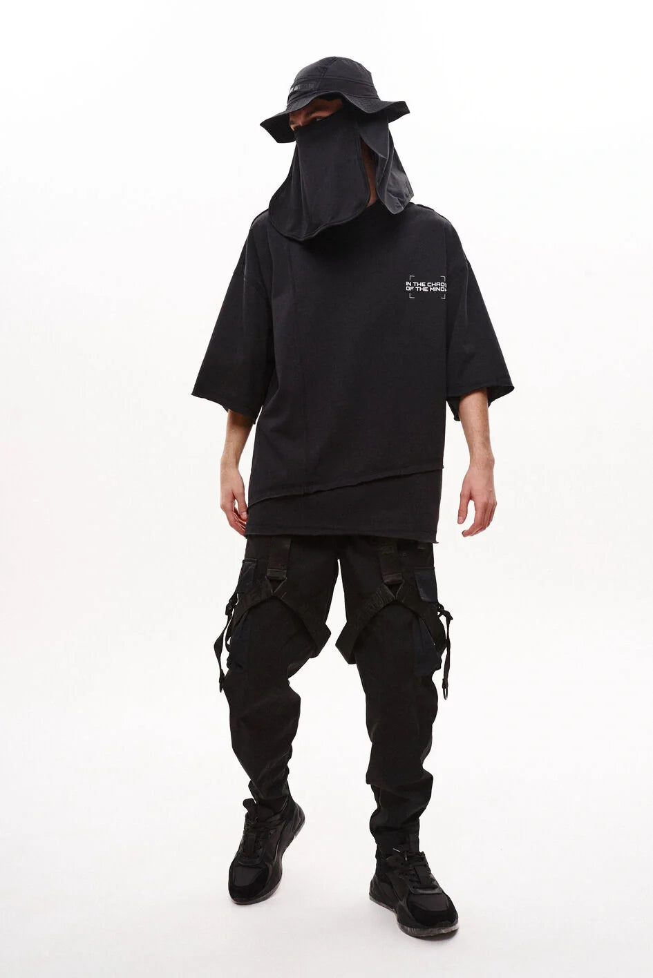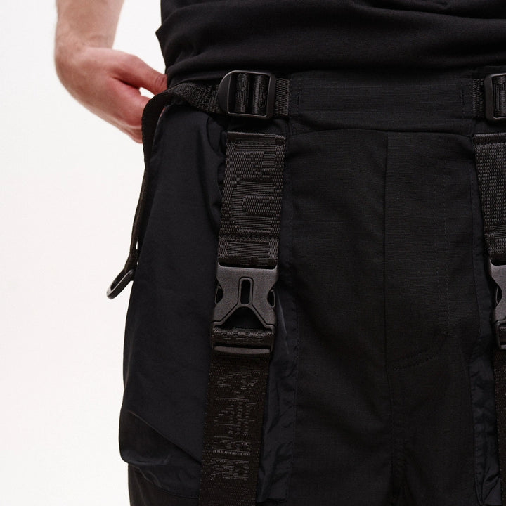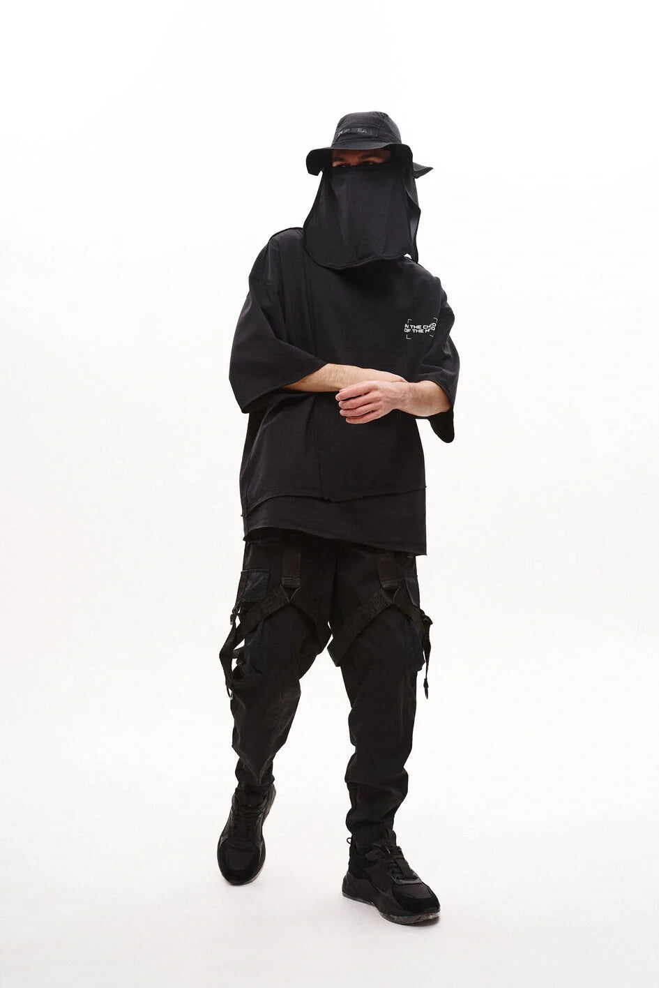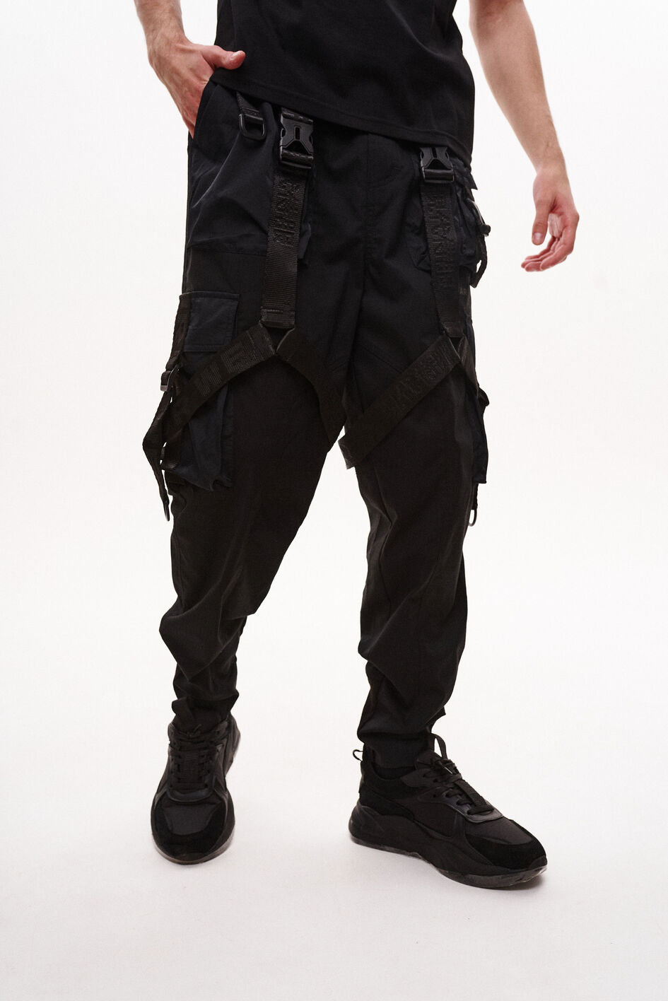 Loose-fit cargo pants for those who value freedom of movement and control over every detail. Seven functional pockets, including a mini patch pocket with a flap — ample space even for chaos. Removable straps with buckles add a technical vibe and allow the look to be transformed. The waistband features elastic with an integrated belt and dual adjustment. Ribbed cuffs at the back of the leg openings ensure a snug fit and sharp silhouette. The fly is functional, just like you.