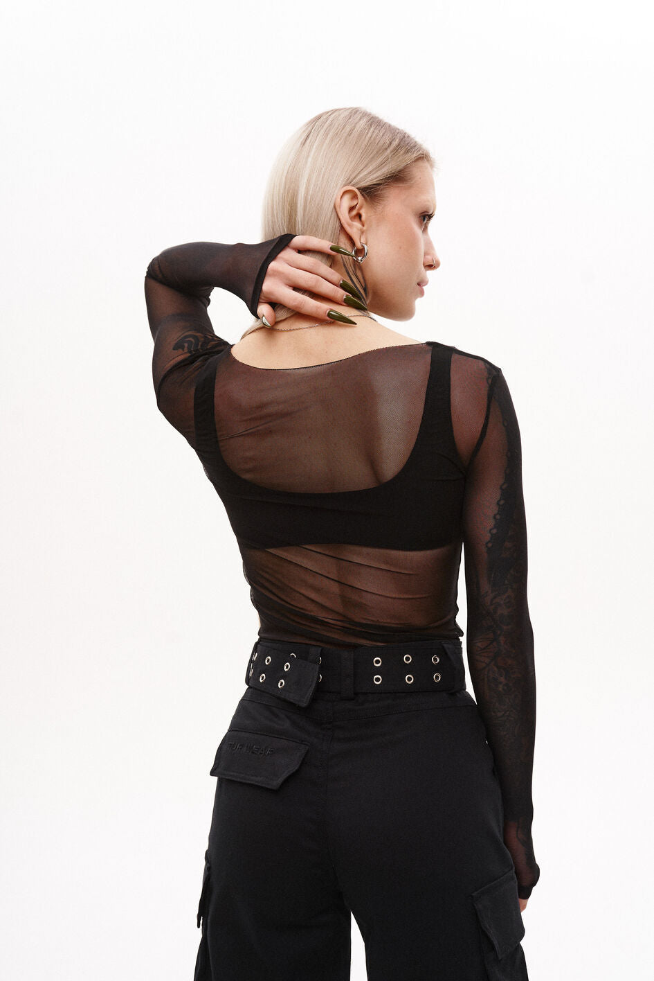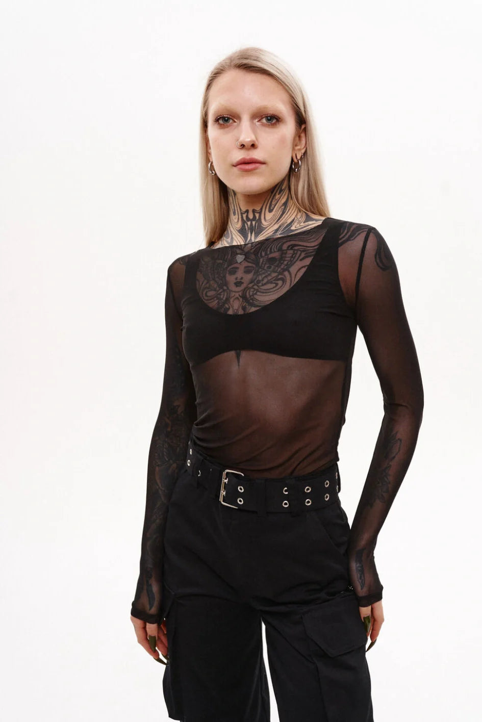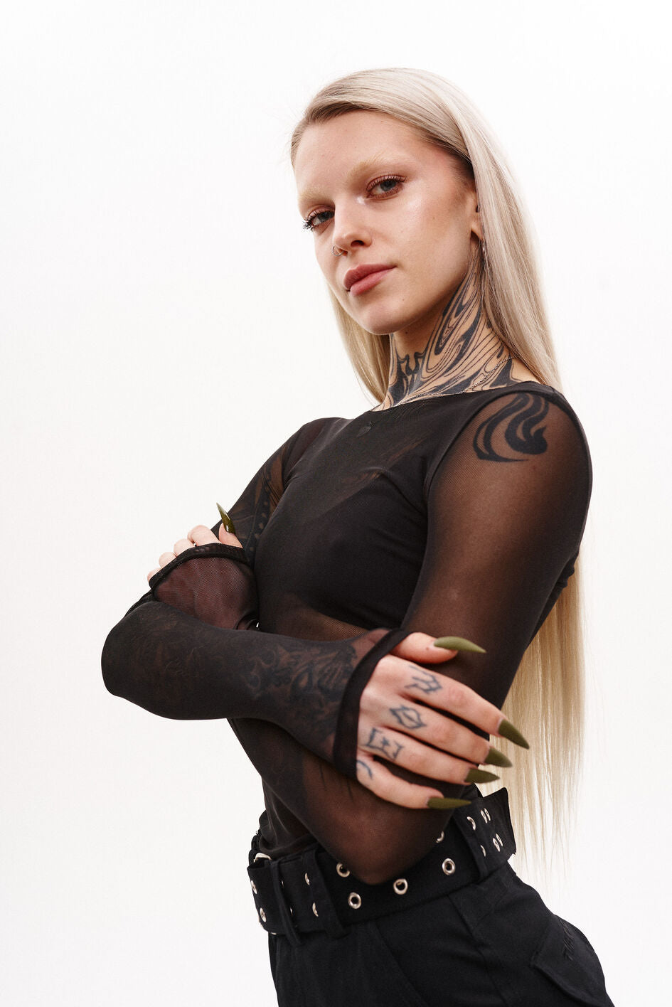 Key model features: Basic-fit longsleeve made of high-quality semi-transparent mesh. The hem of the sleeves and the bottom are finished with a coverstitch. The neckline is left raw. Fits the body perfectly, highlighting the silhouette. Combines well with both sporty and basic outfits.
