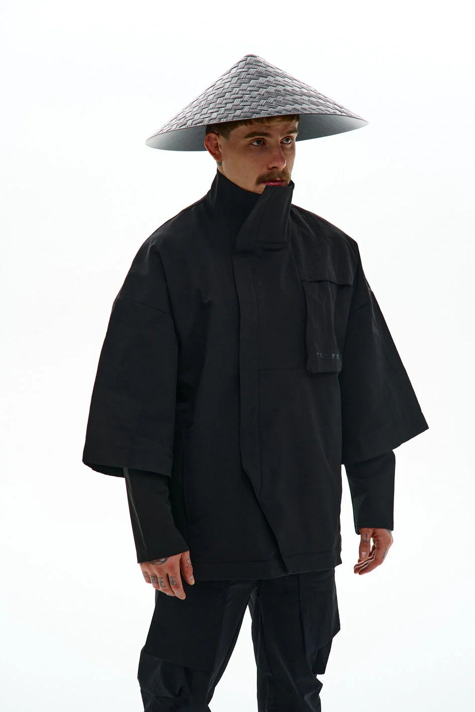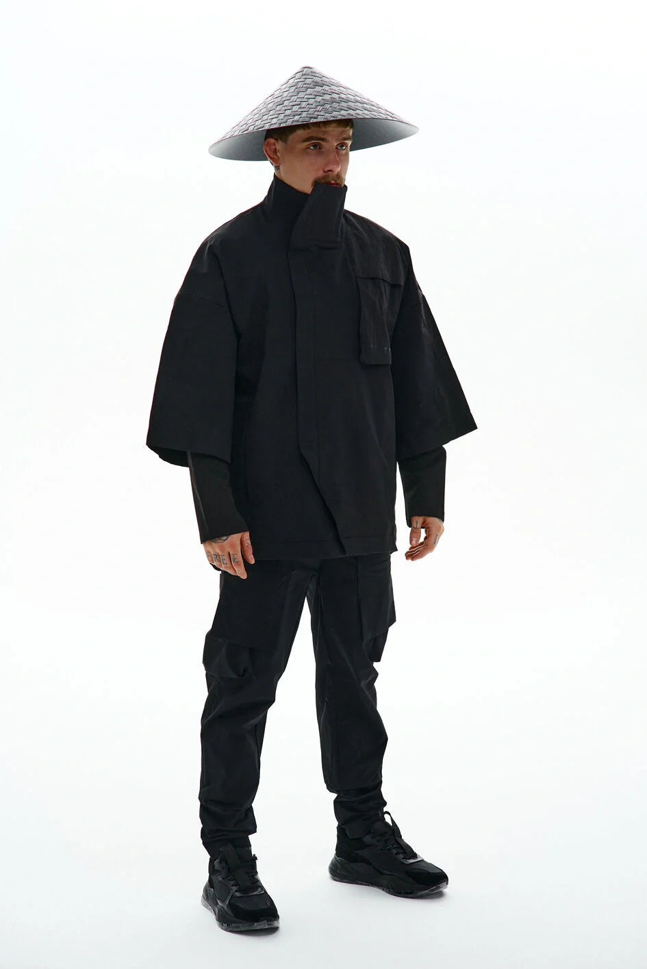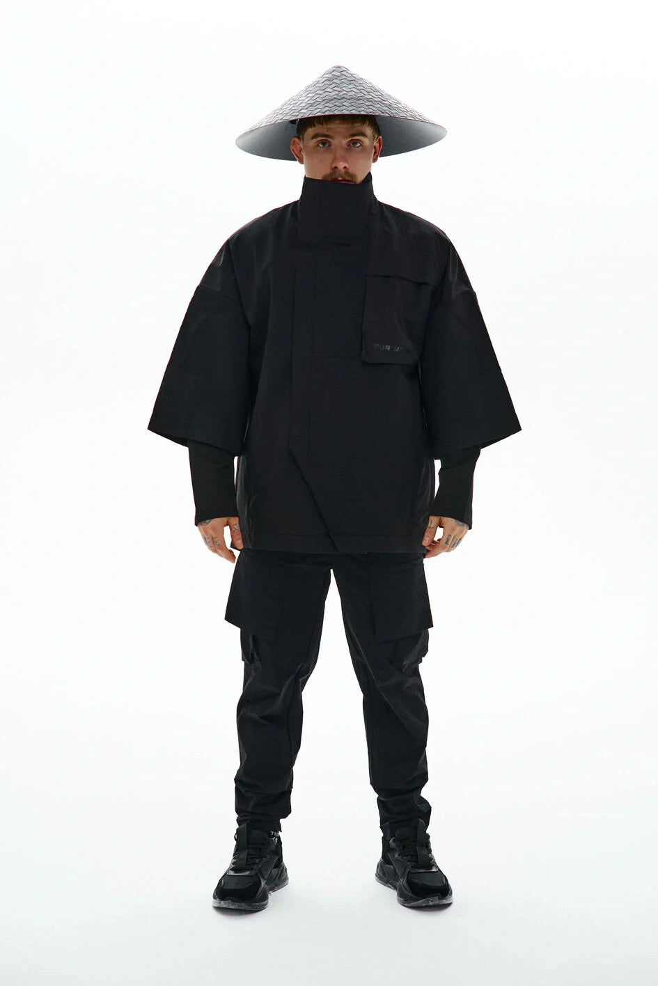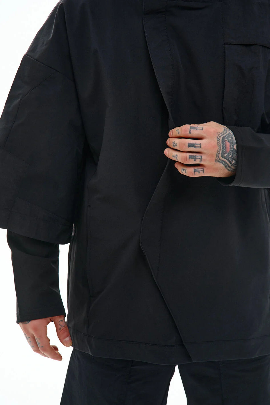 Kimono with a high stand-up collar and an asymmetrical cut. The left side features a voluminous crinkled pocket with a flap. Two additional pockets are placed in the side seams. The closure is secured with magnetic buttons for convenience. The garment also includes crinkled fabric inserts that add a textural accent. The complex cut and oversized fit create a stylish and comfortable look.