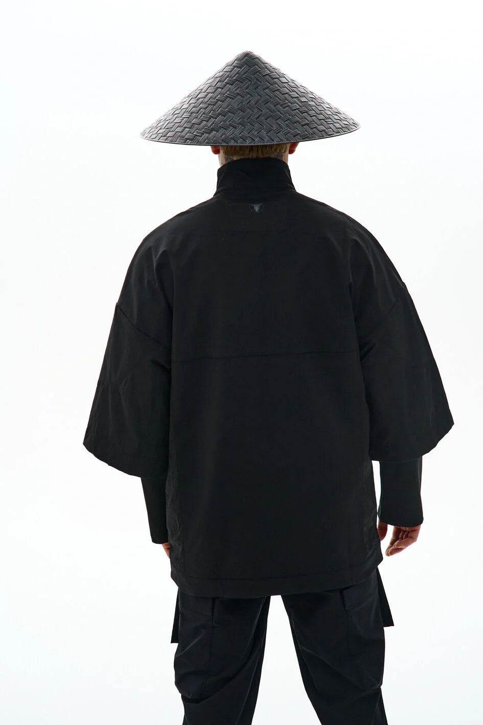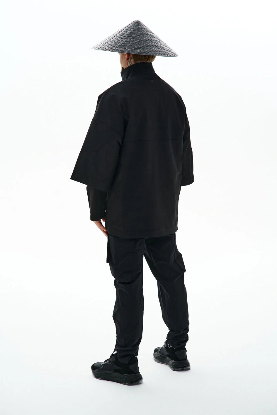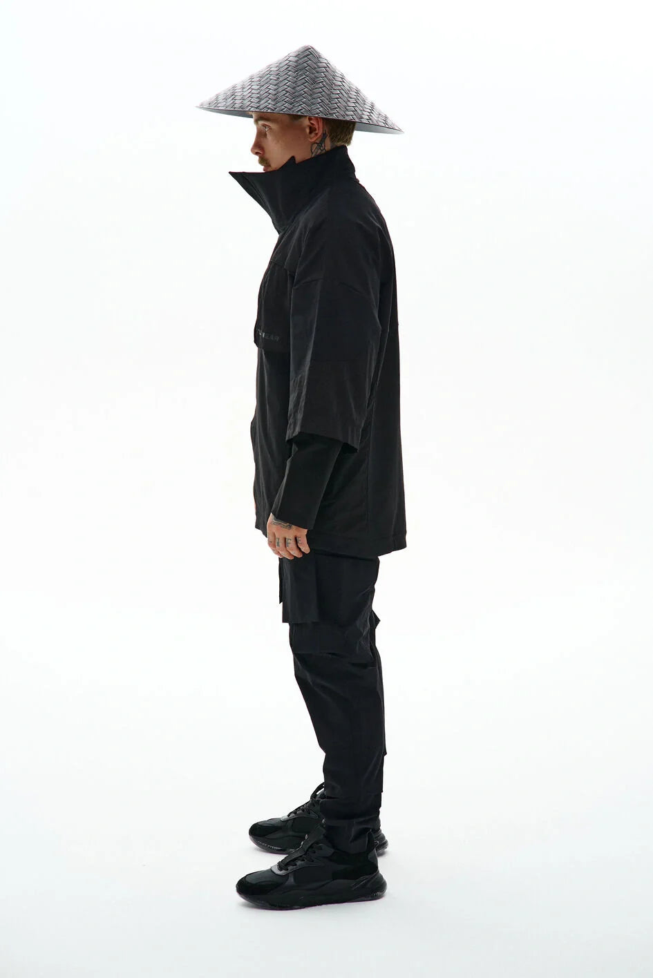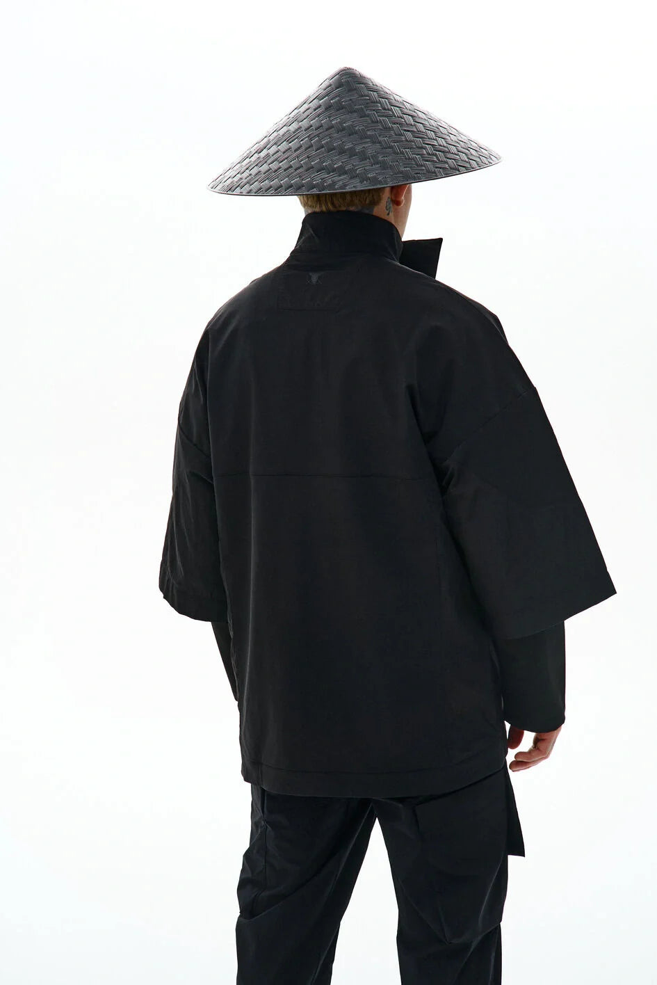 Kimono with a high stand-up collar and an asymmetrical cut. The left side features a voluminous crinkled pocket with a flap. Two additional pockets are placed in the side seams. The closure is secured with magnetic buttons for convenience. The garment also includes crinkled fabric inserts that add a textural accent. The complex cut and oversized fit create a stylish and comfortable look.