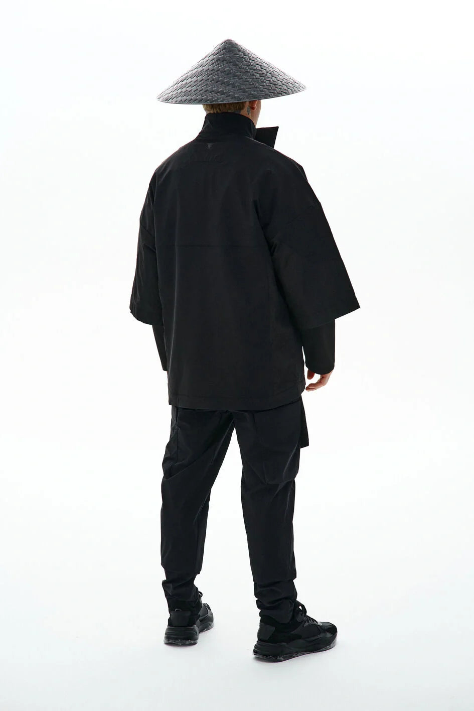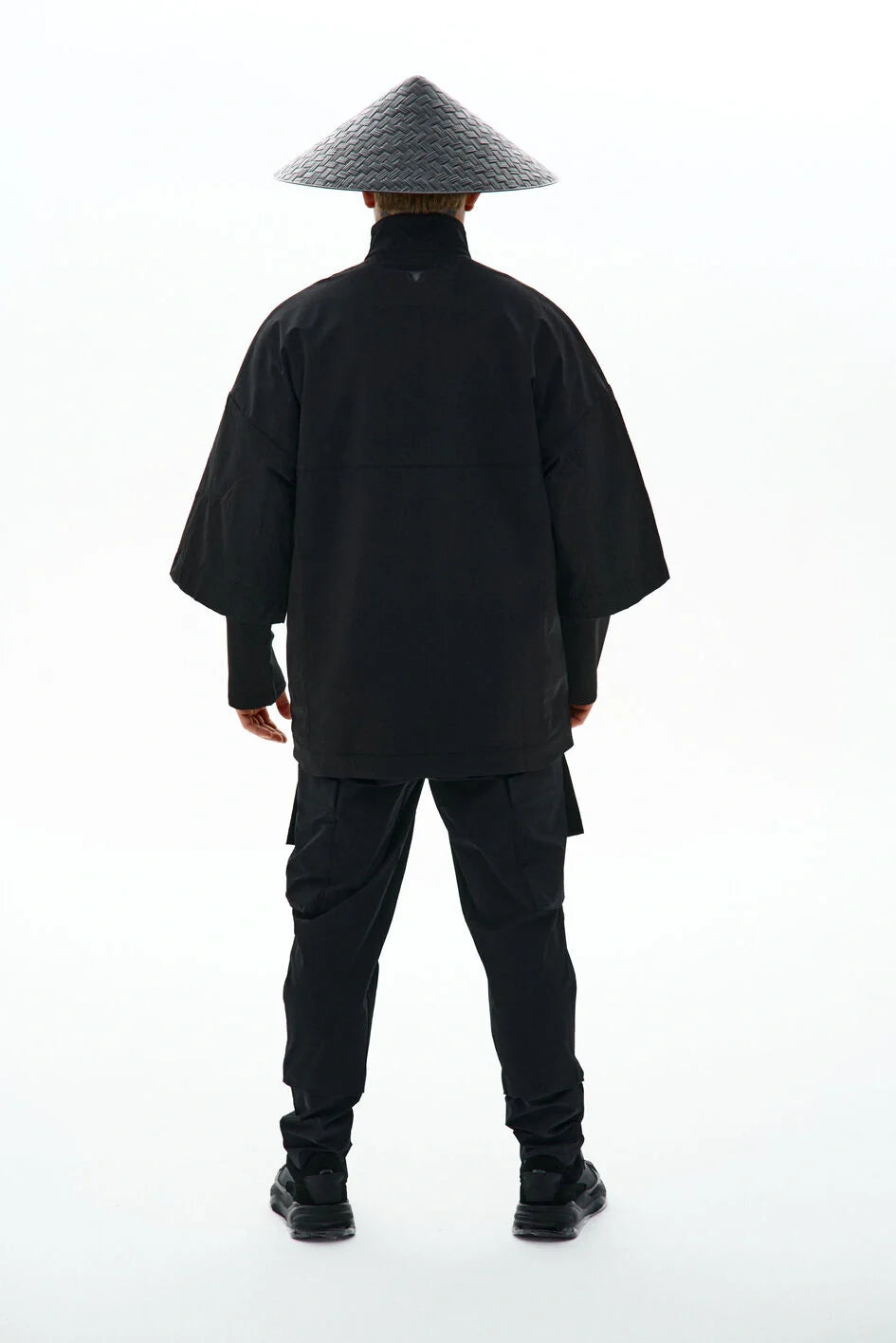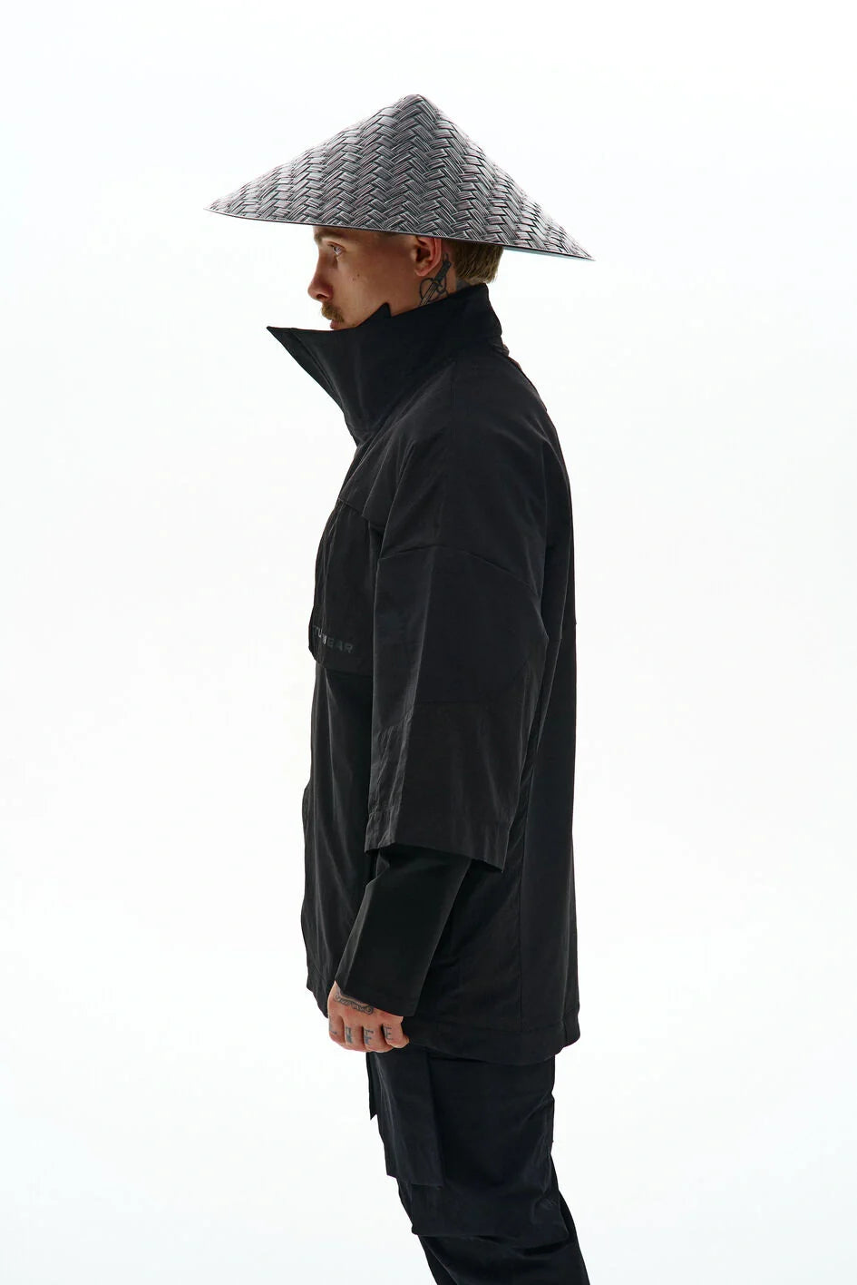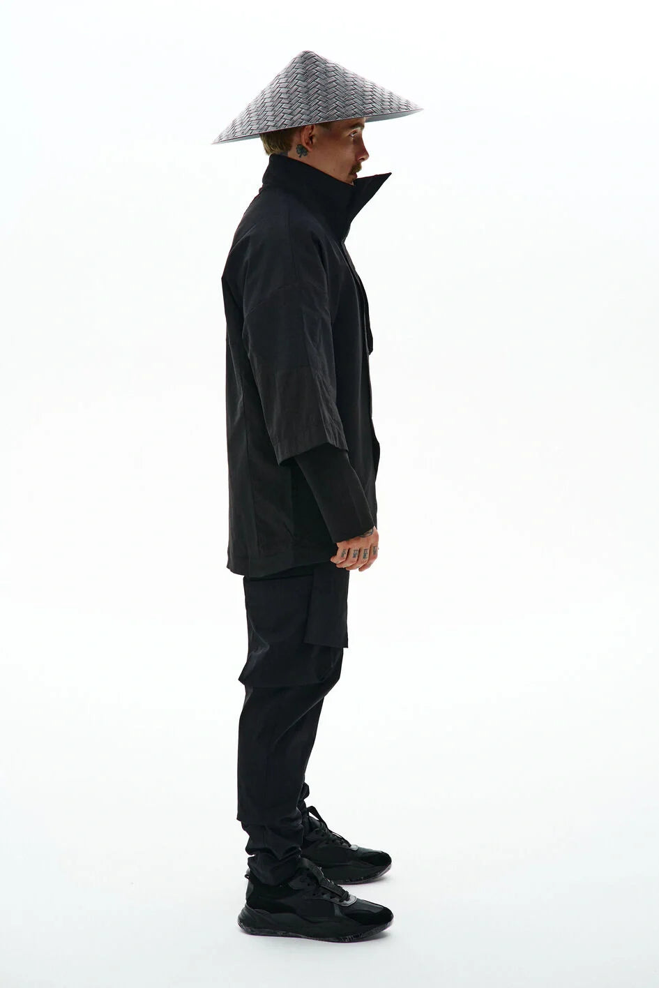 Kimono with a high stand-up collar and an asymmetrical cut. The left side features a voluminous crinkled pocket with a flap. Two additional pockets are placed in the side seams. The closure is secured with magnetic buttons for convenience. The garment also includes crinkled fabric inserts that add a textural accent. The complex cut and oversized fit create a stylish and comfortable look.