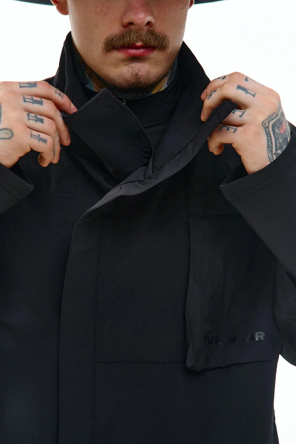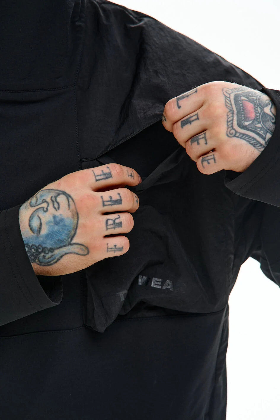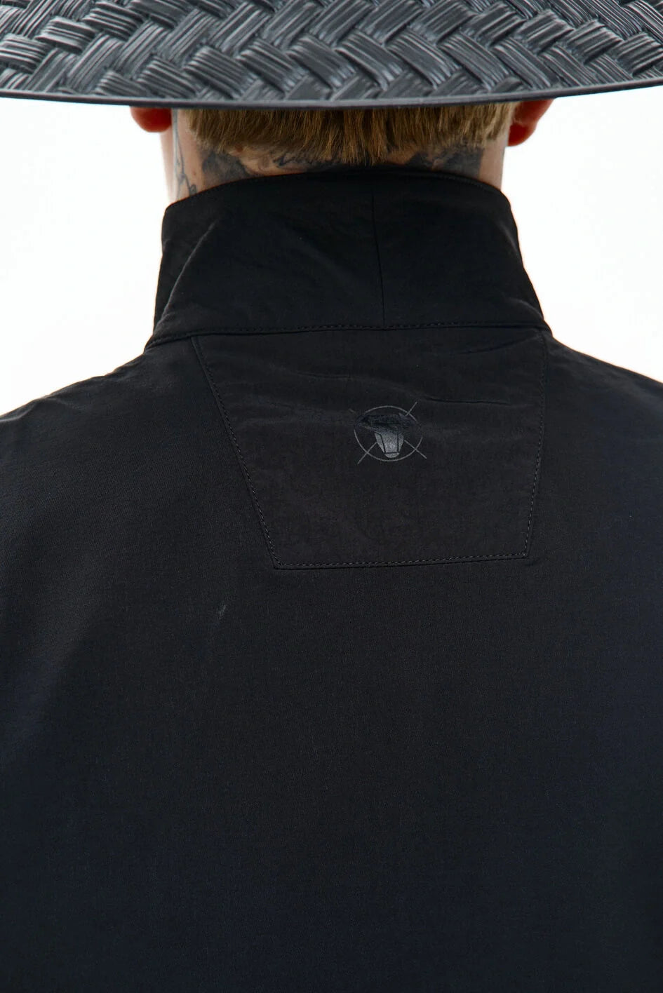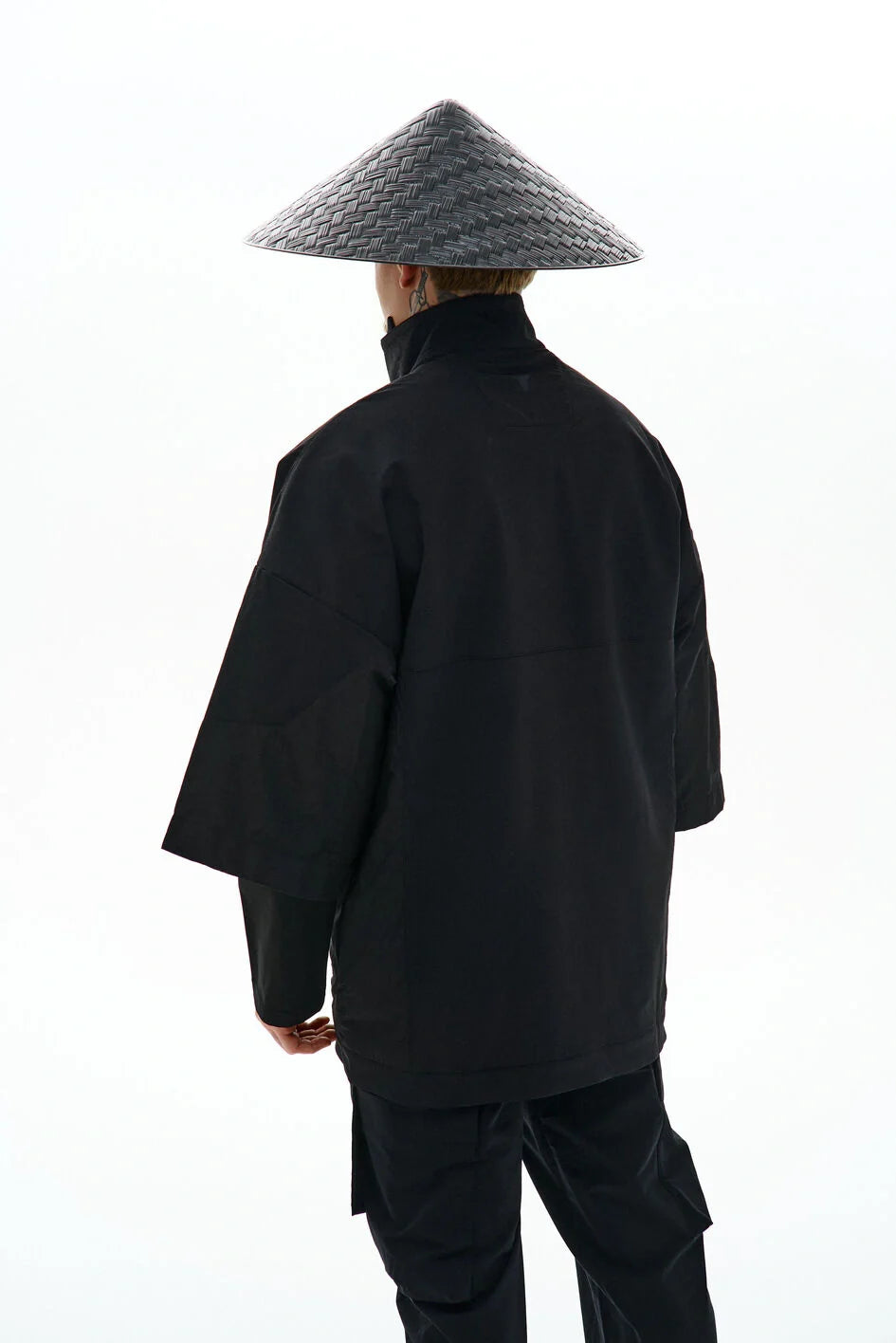 Kimono with a high stand-up collar and an asymmetrical cut. The left side features a voluminous crinkled pocket with a flap. Two additional pockets are placed in the side seams. The closure is secured with magnetic buttons for convenience. The garment also includes crinkled fabric inserts that add a textural accent. The complex cut and oversized fit create a stylish and comfortable look.