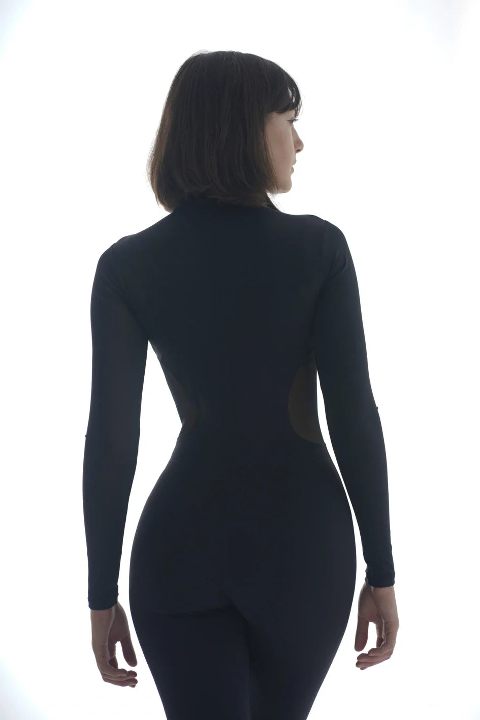 Tight-fitting jumpsuit with sleeves and a low stand-up collar. Front zipper YKK for easy fastening. Knit mesh panels on the sides at the front and back provide ventilation and accentuate the figure. The TUR signature print is placed on the left front panel — a meaningful accent.