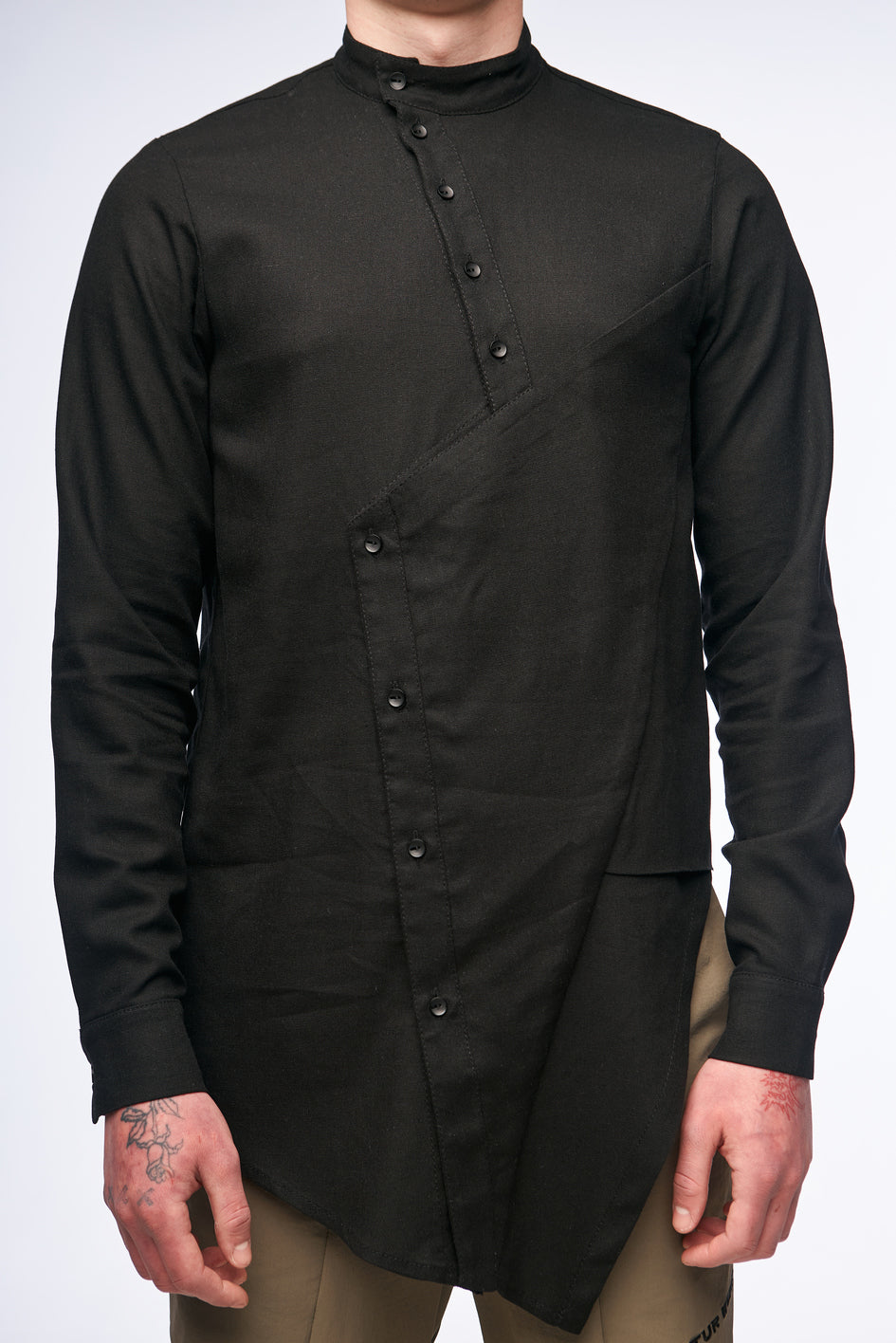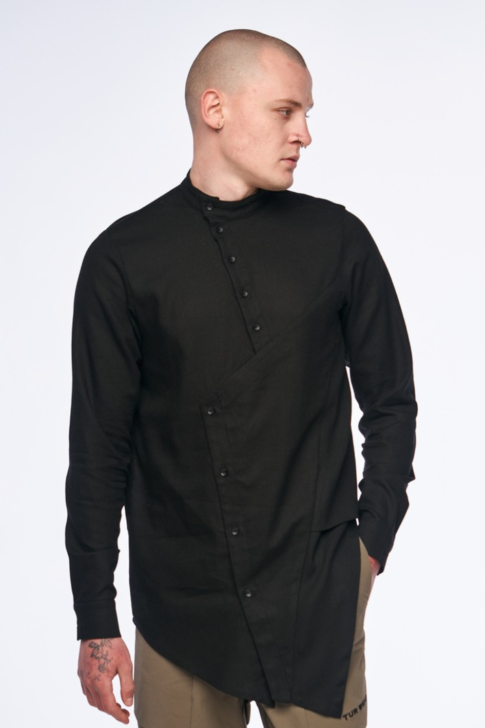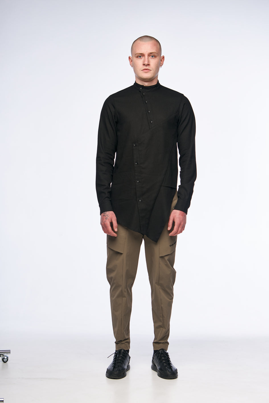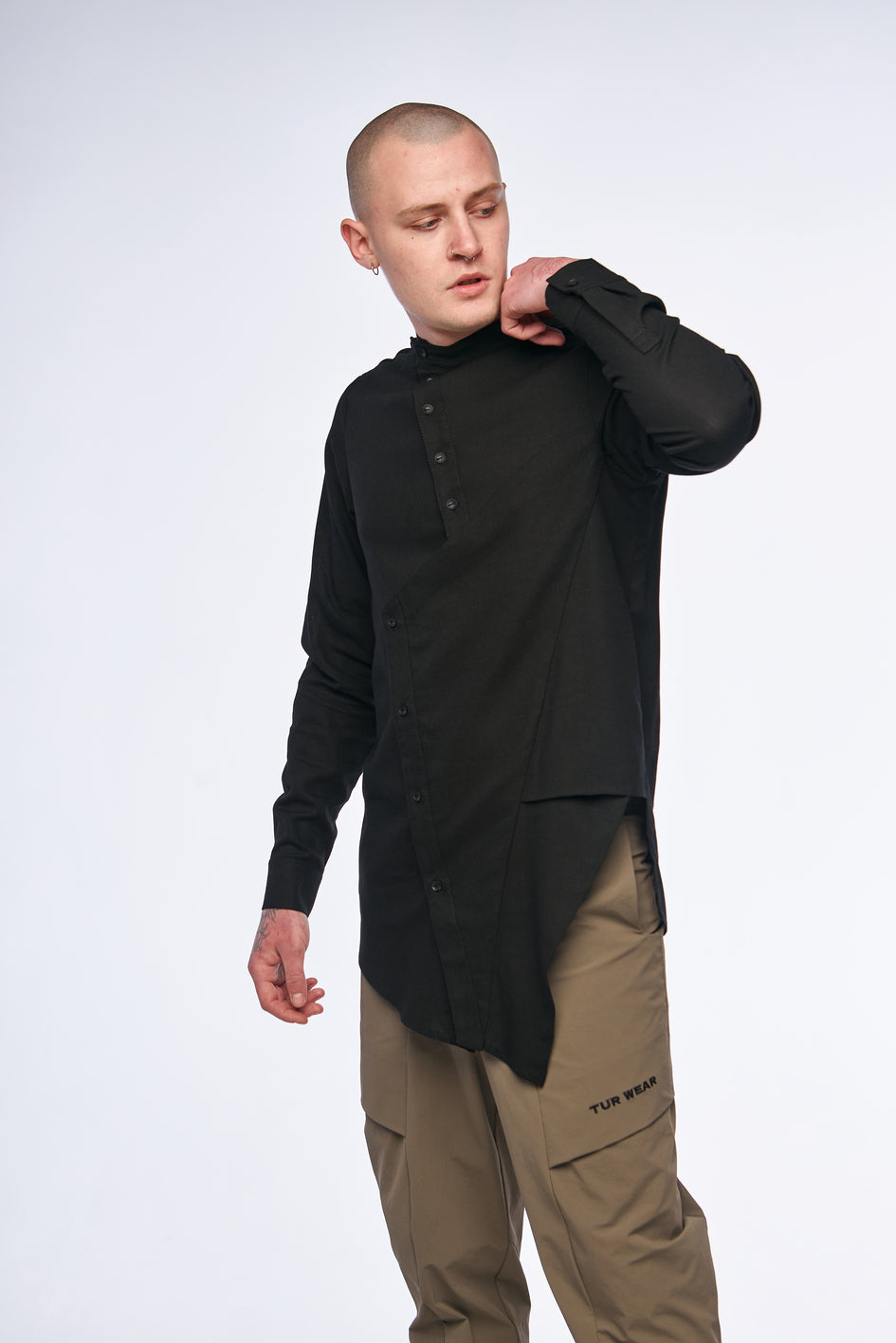A cotton-linen shirt with an asymmetrical cut, featuring a stand-up collar and long sleeves — the perfect piece for a stylish look. It fastens with buttons on the front and cuffs, offering ease of wear and adjustable fit.
