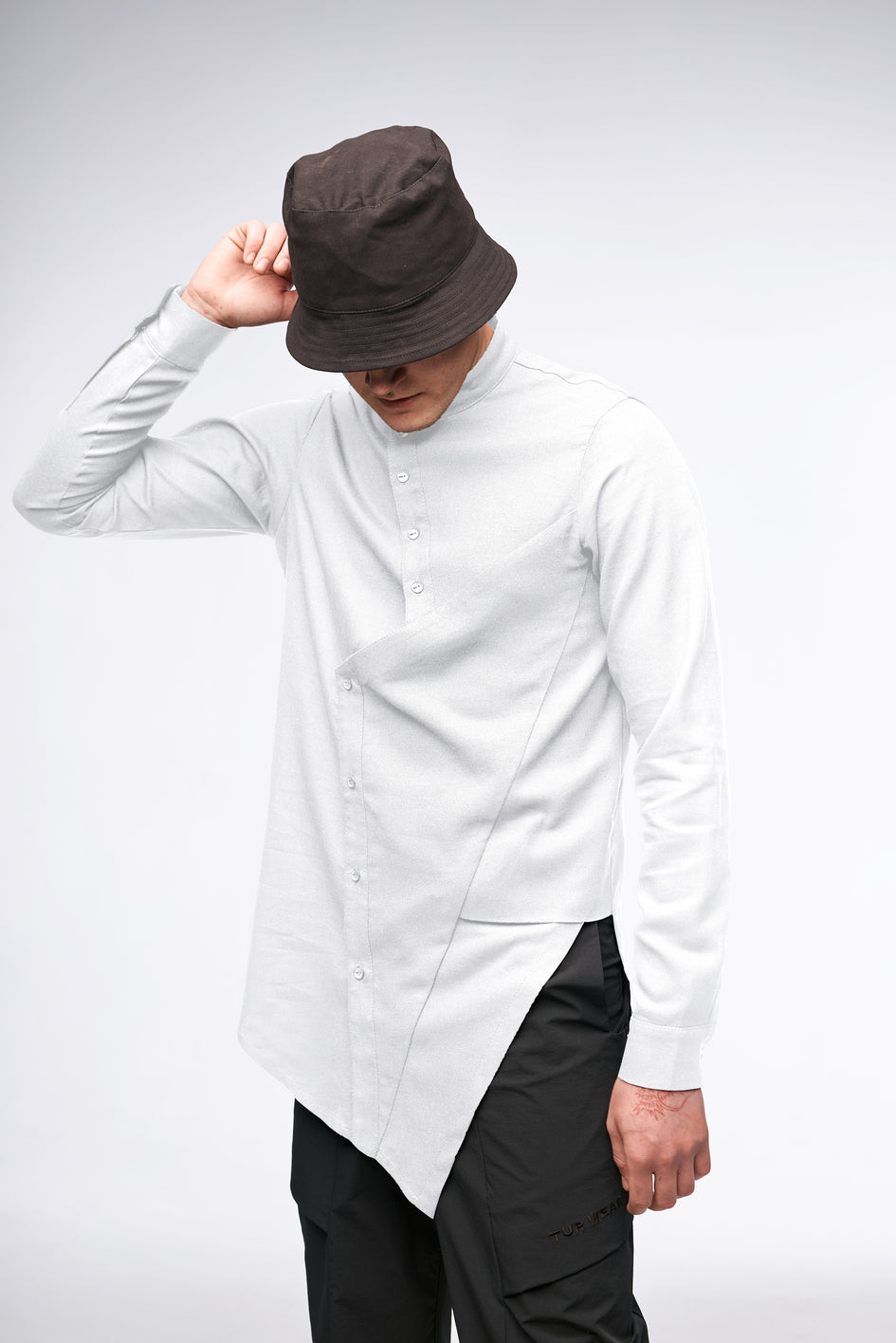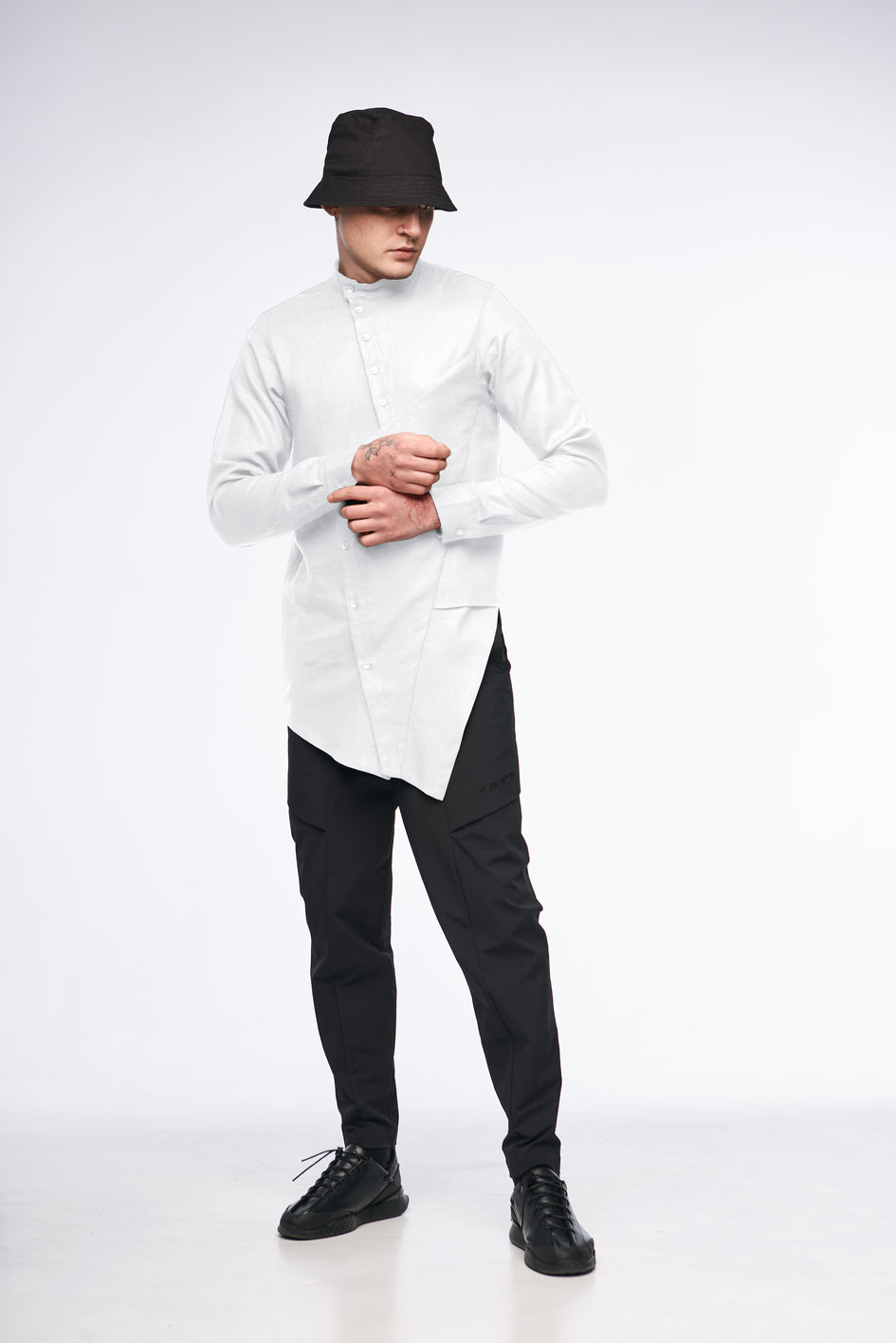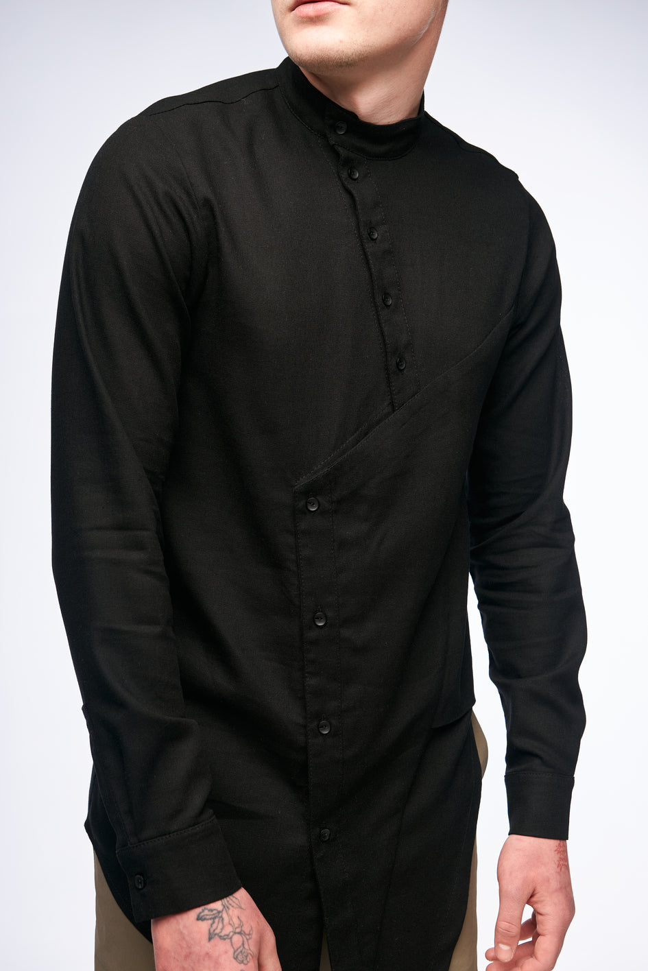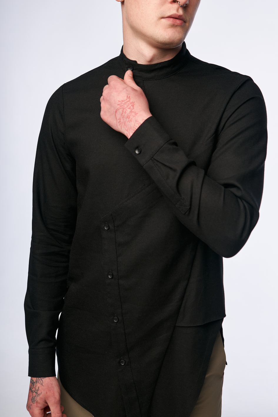 A cotton-linen shirt with an asymmetrical cut, featuring a stand-up collar and long sleeves — the perfect piece for a stylish look. It fastens with buttons on the front and cuffs, offering ease of wear and adjustable fit.