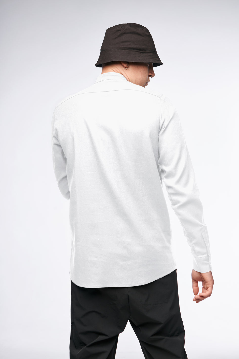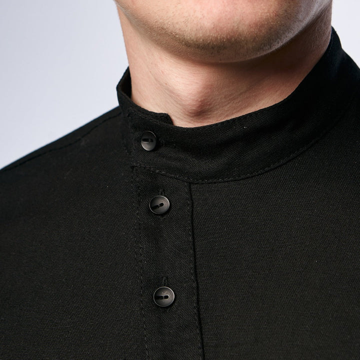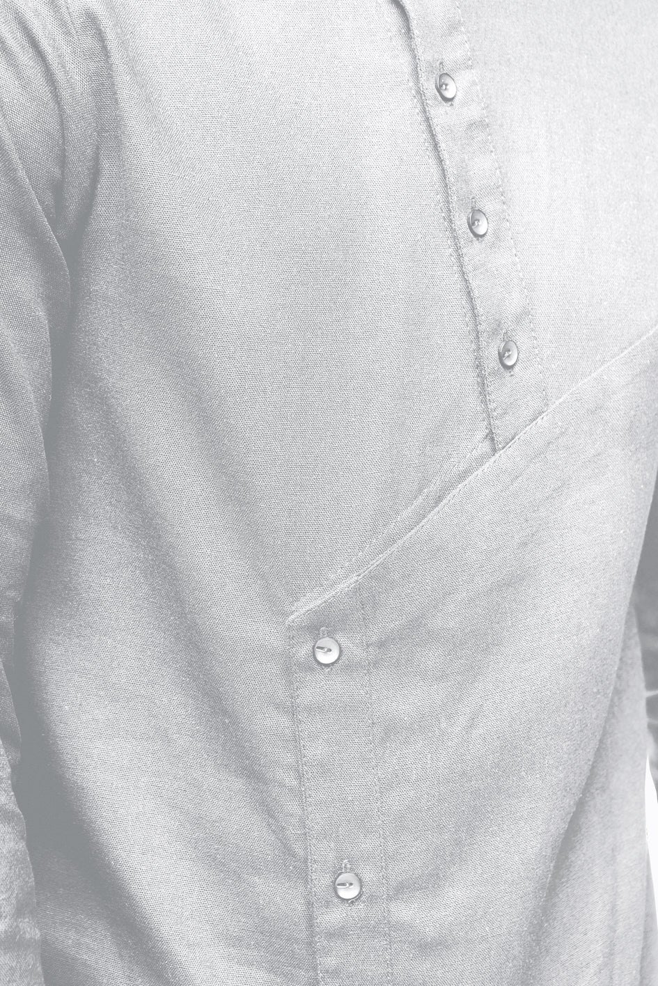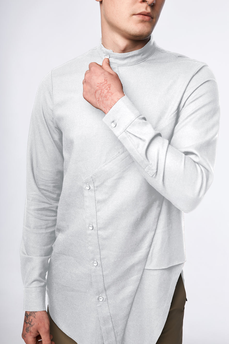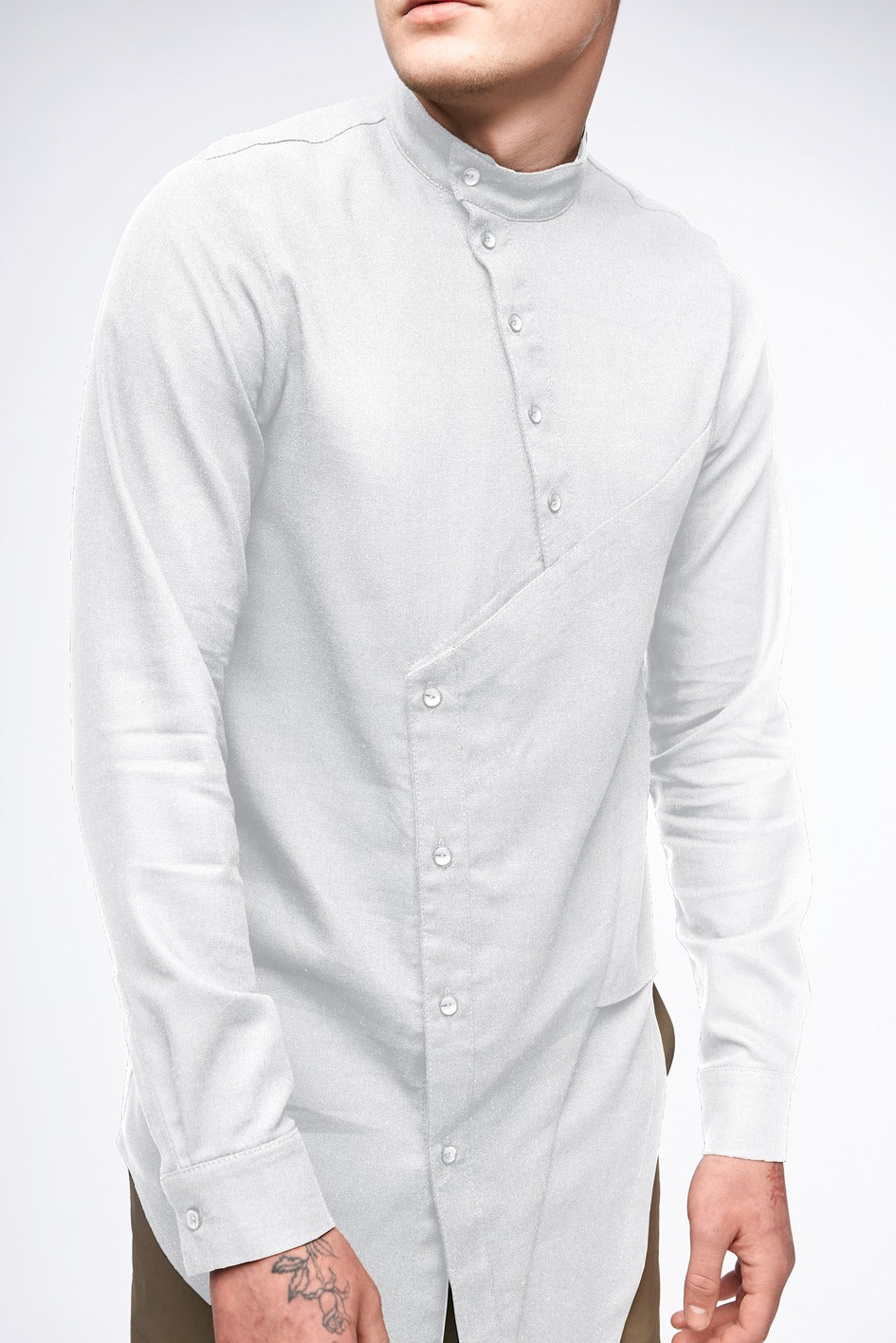 A cotton-linen shirt with an asymmetrical cut, featuring a stand-up collar and long sleeves — the perfect piece for a stylish look. It fastens with buttons on the front and cuffs, offering ease of wear and adjustable fit.