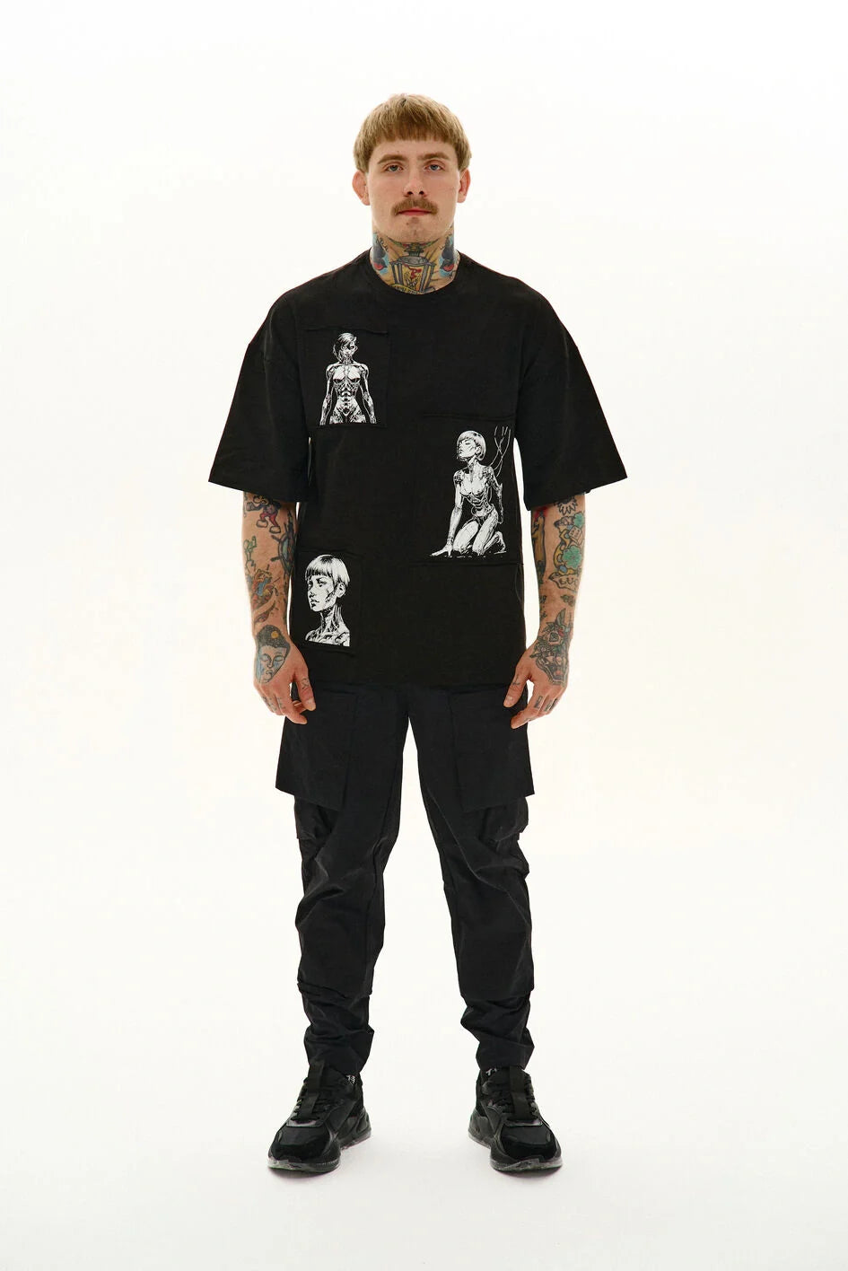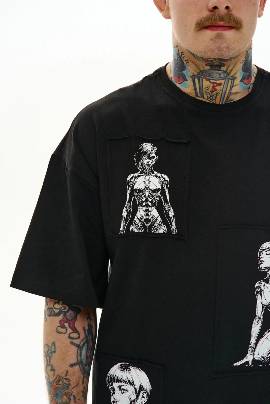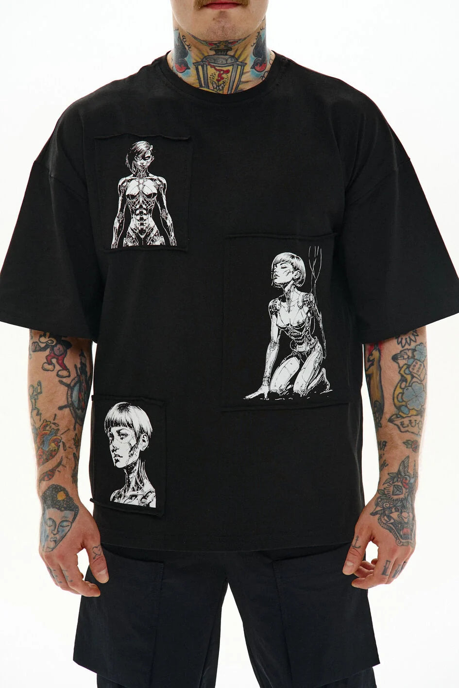 Loose-fit t-shirt with a round neckline and extended sleeves. Three separate prints are made on patches and attached to the garment — a detail that creates character.