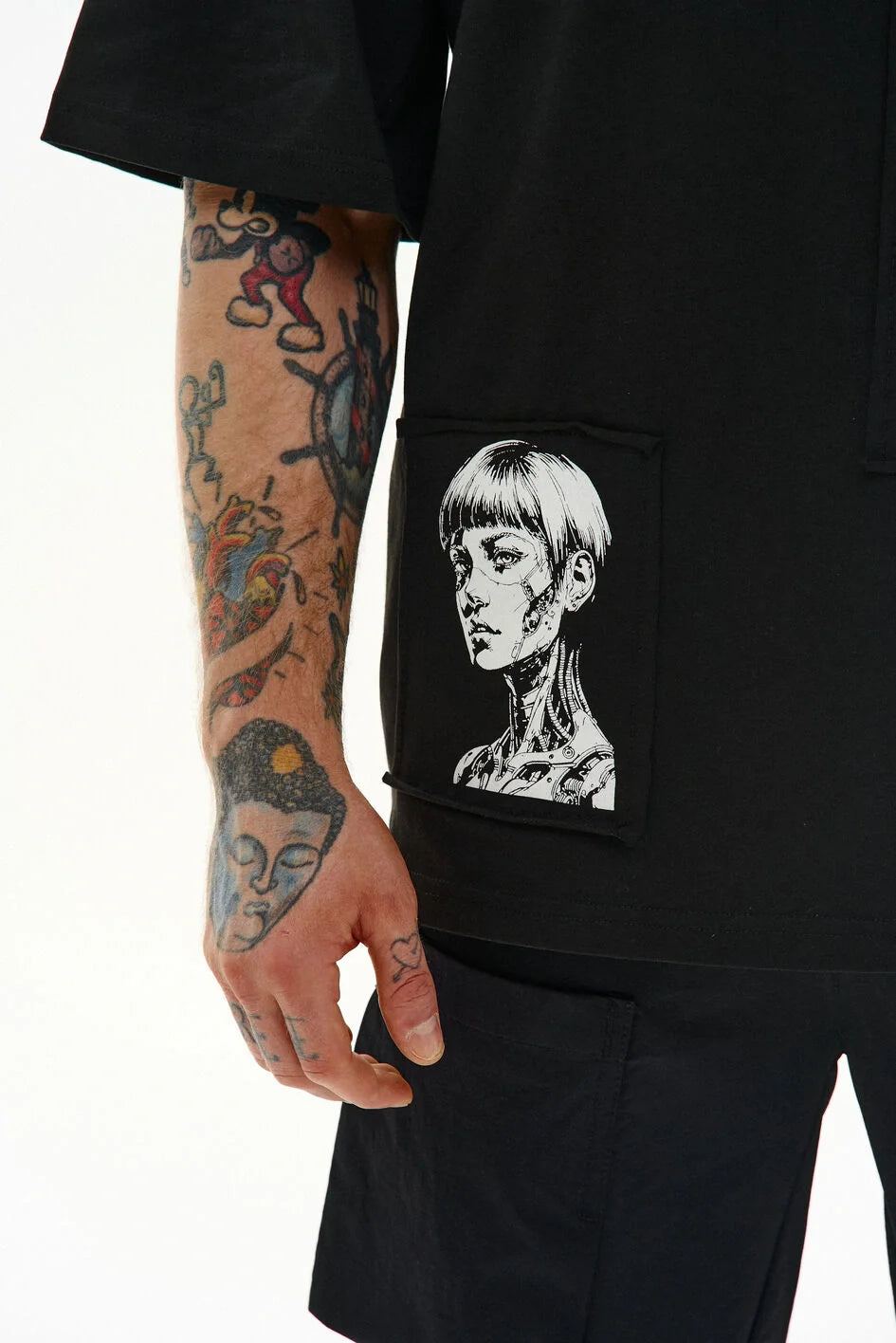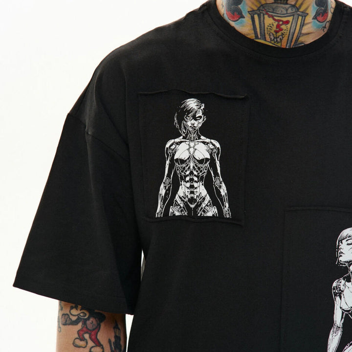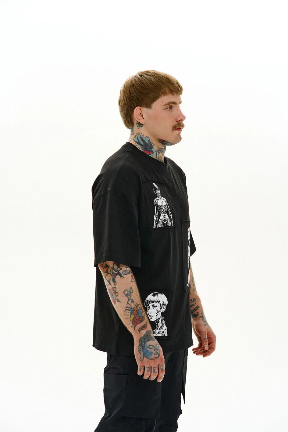 Loose-fit t-shirt with a round neckline and extended sleeves. Three separate prints are made on patches and attached to the garment — a detail that creates character.