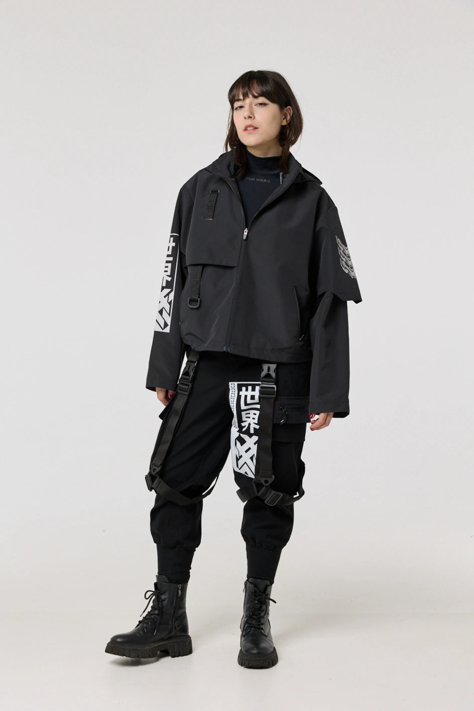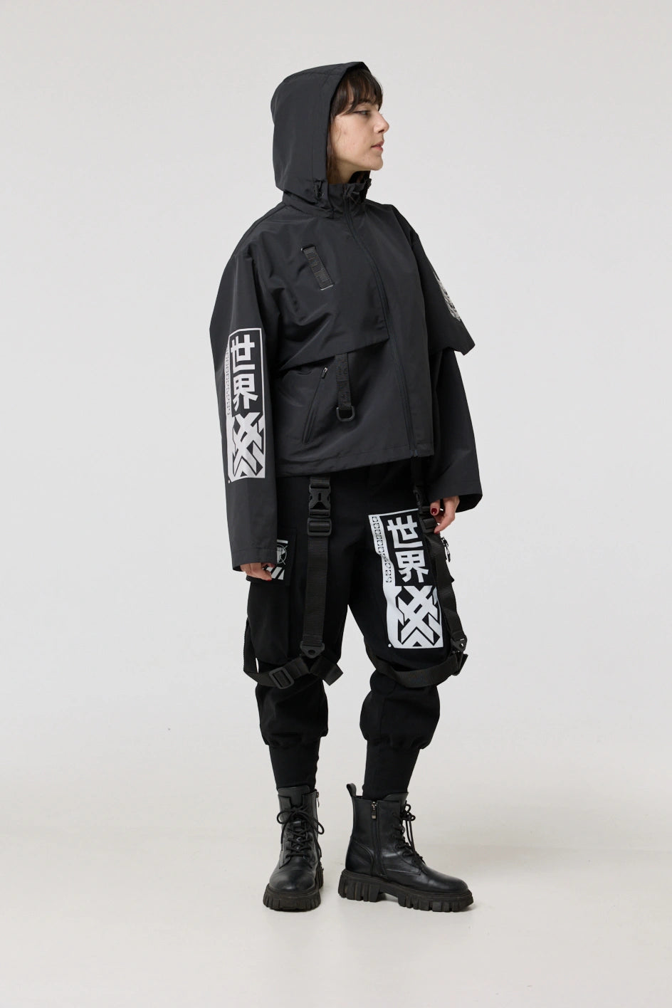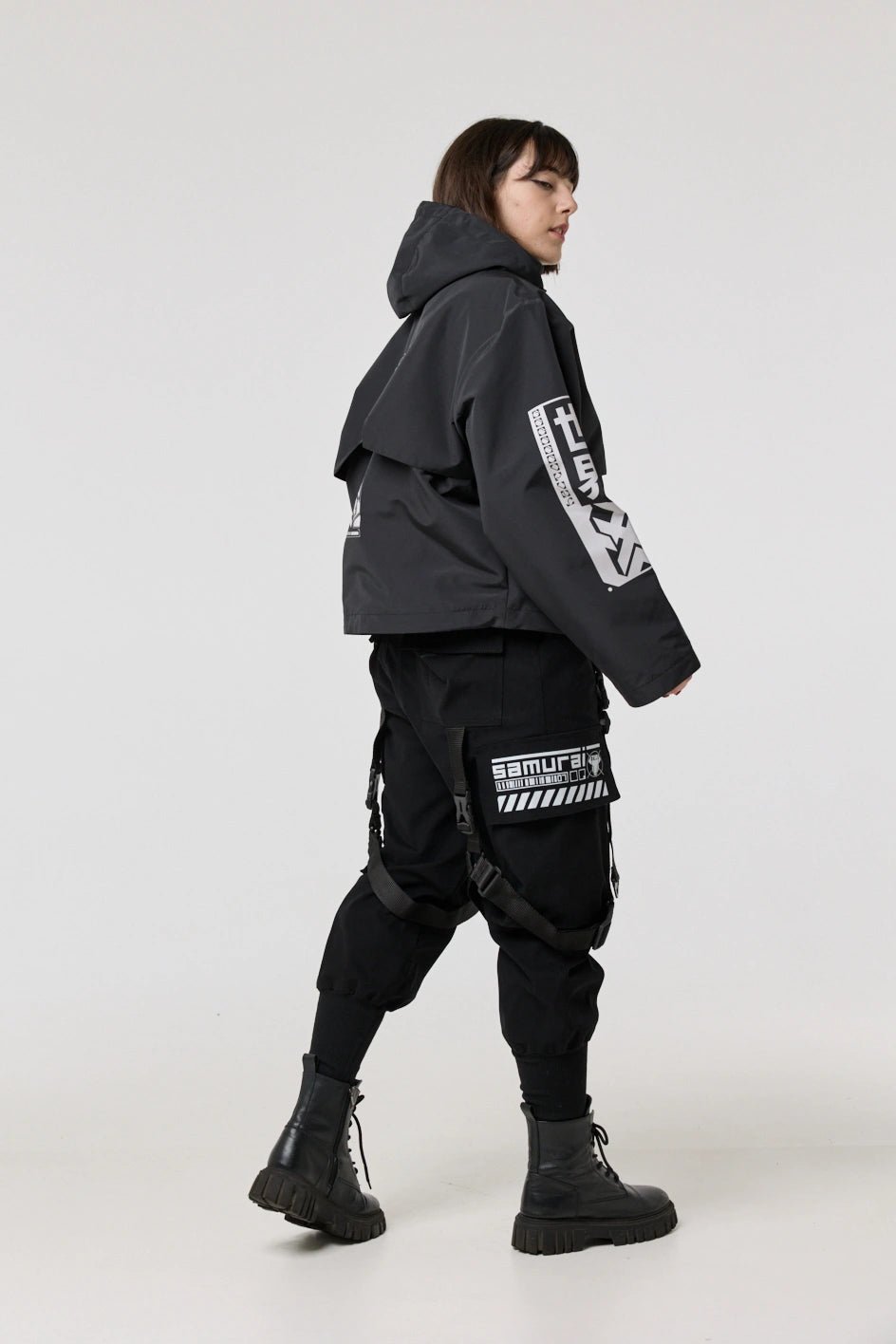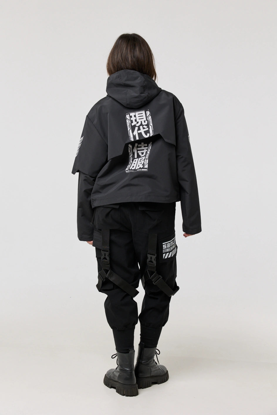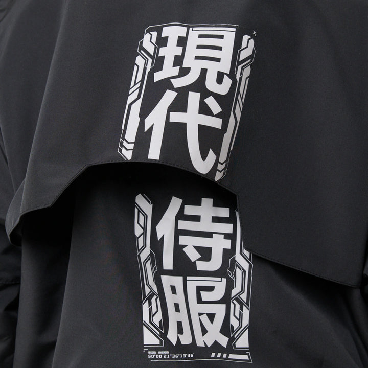 The model has an internal zip pocket and four external ones: two lower zip pockets, a chest pocket with a buckle, and a sleeve pocket with a buckle. On the sleeve patch and on the back — cyberpunk-style prints with an inscription in hieroglyphs: “Armor of the modern samurai.” The hood is vertically adjustable, and the bottom of the product can be adjusted with an elastic cord.