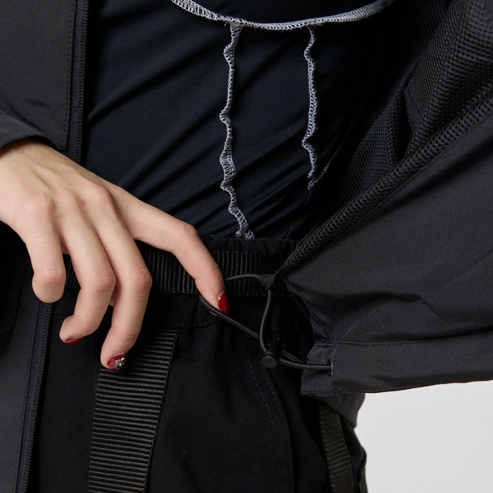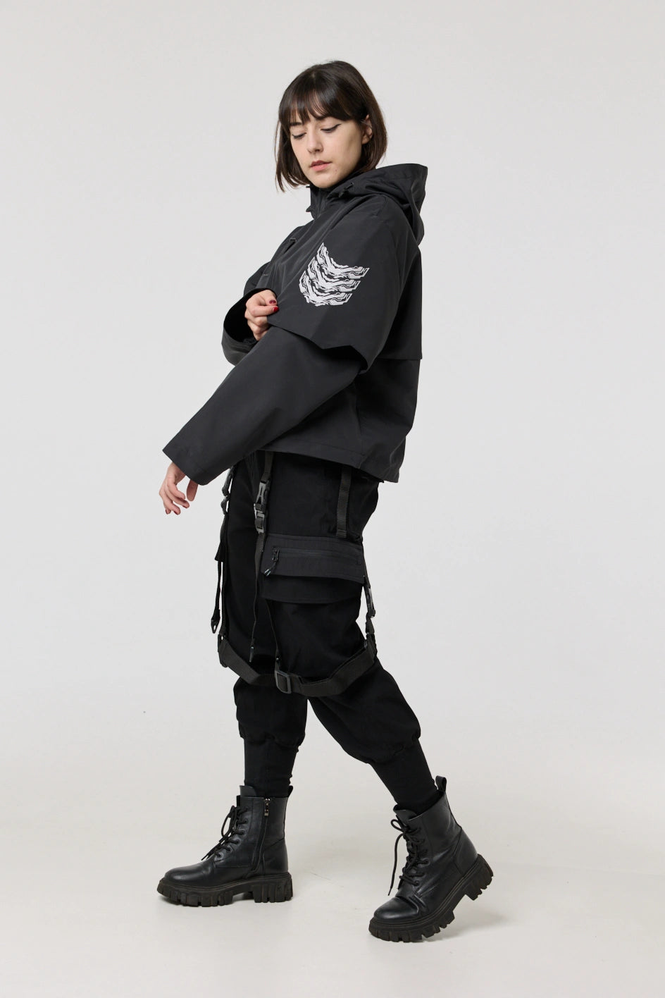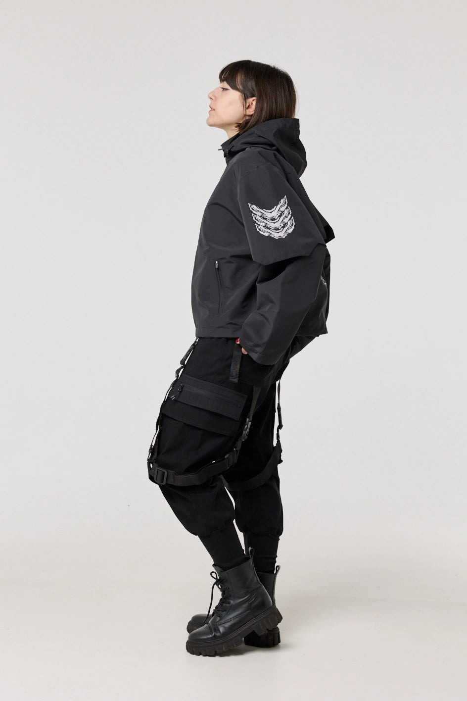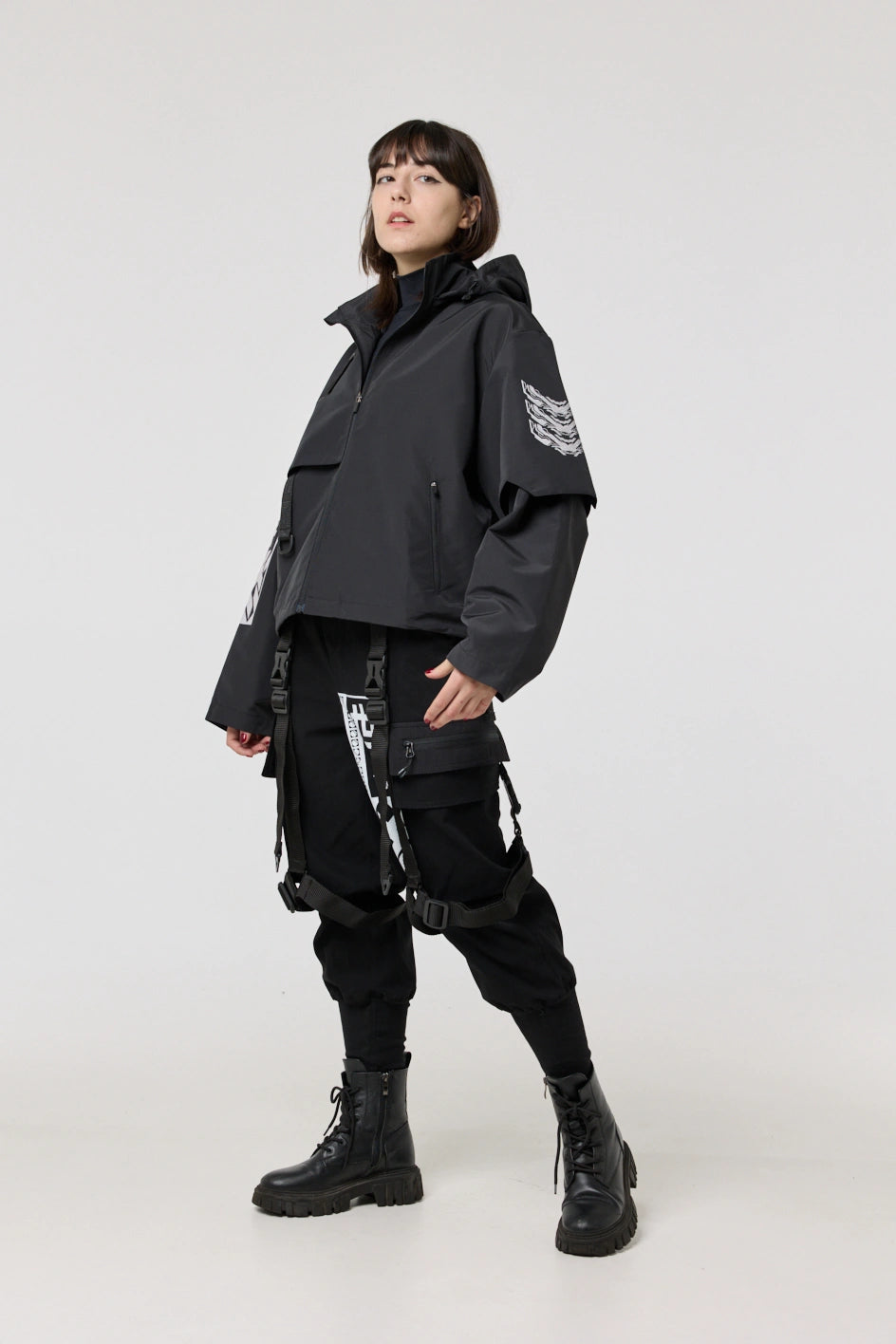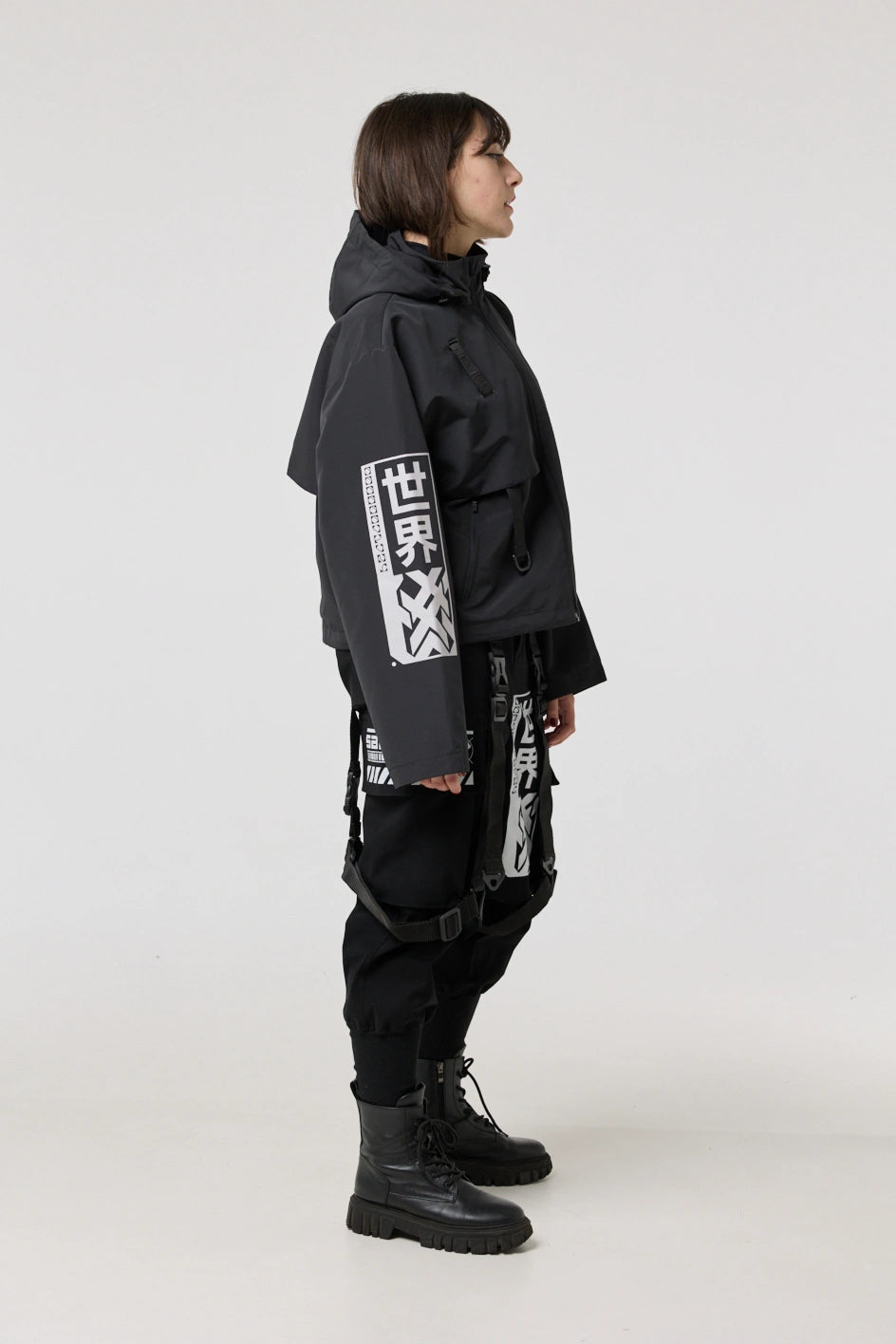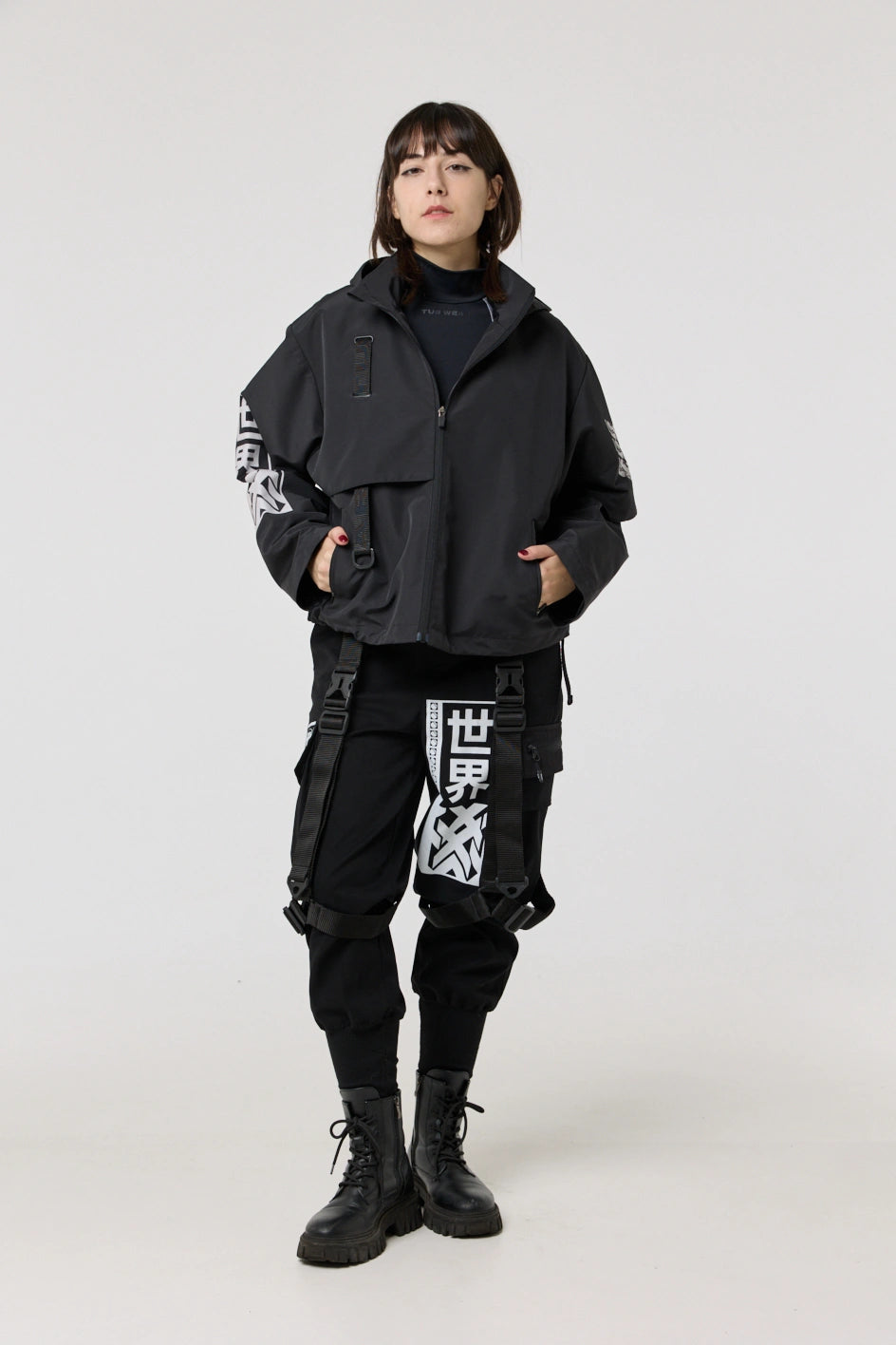 The model has an internal zip pocket and four external ones: two lower zip pockets, a chest pocket with a buckle, and a sleeve pocket with a buckle. On the sleeve patch and on the back — cyberpunk-style prints with an inscription in hieroglyphs: “Armor of the modern samurai.” The hood is vertically adjustable, and the bottom of the product can be adjusted with an elastic cord.