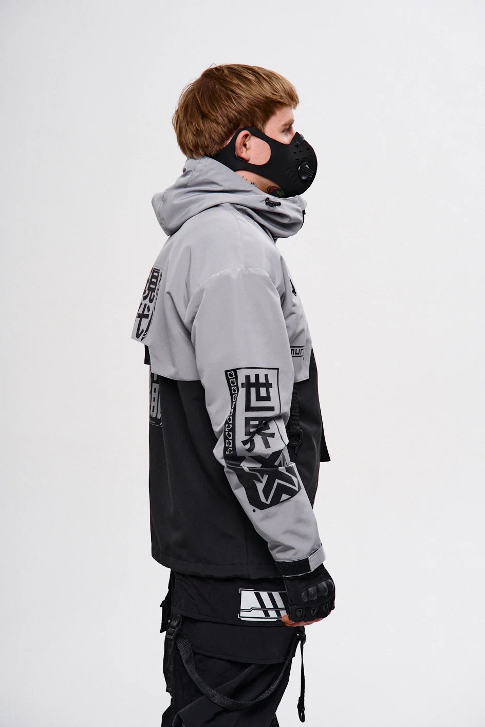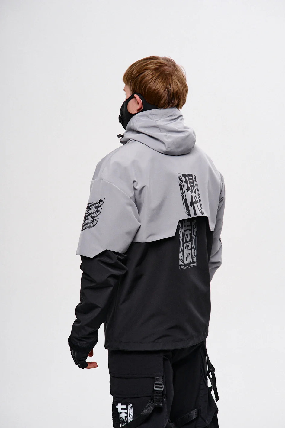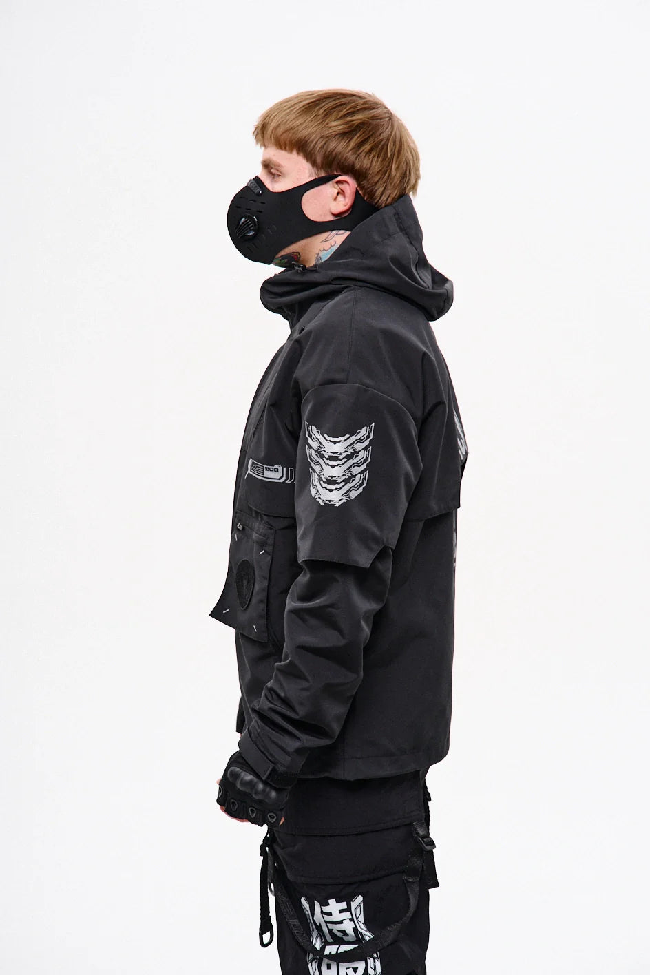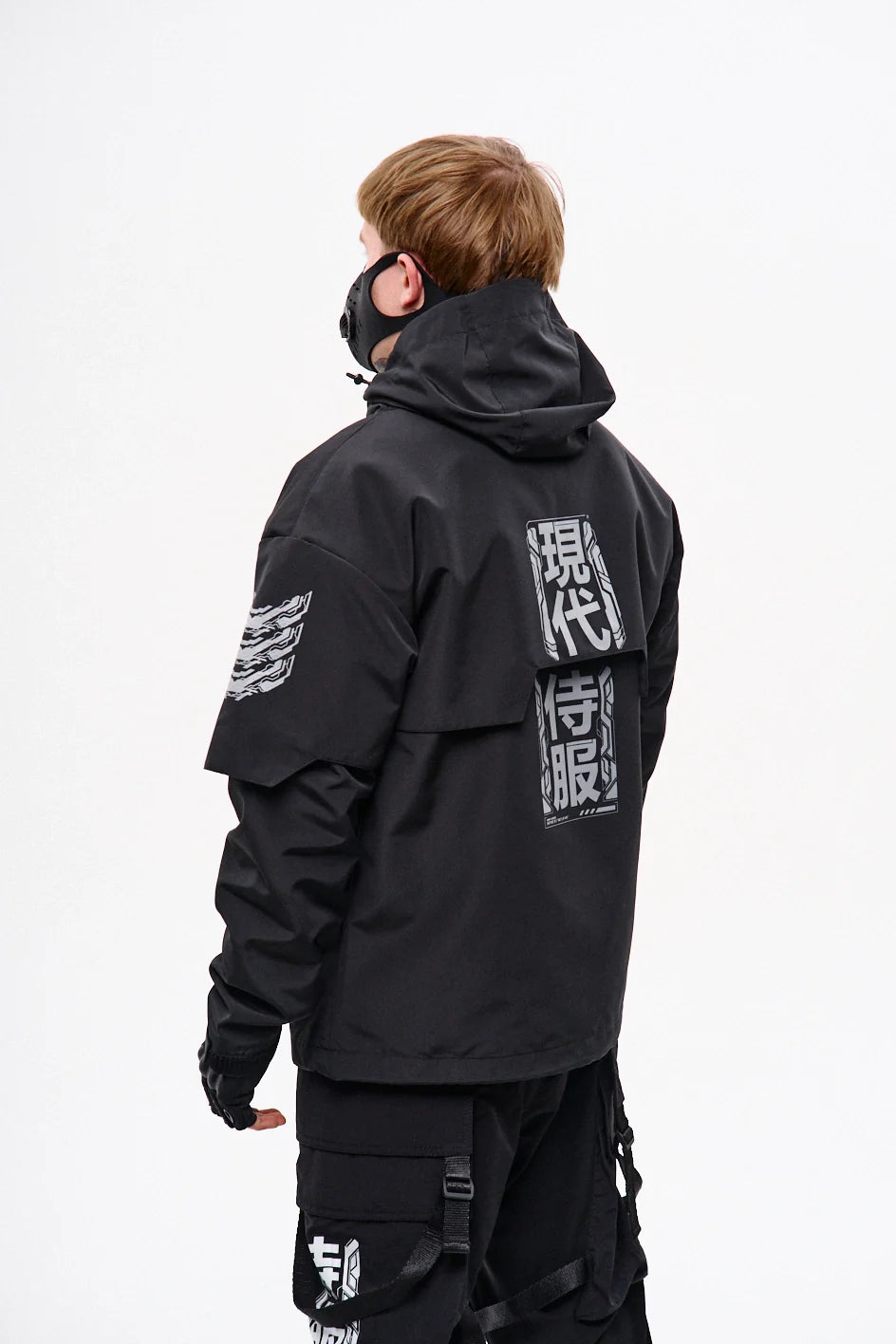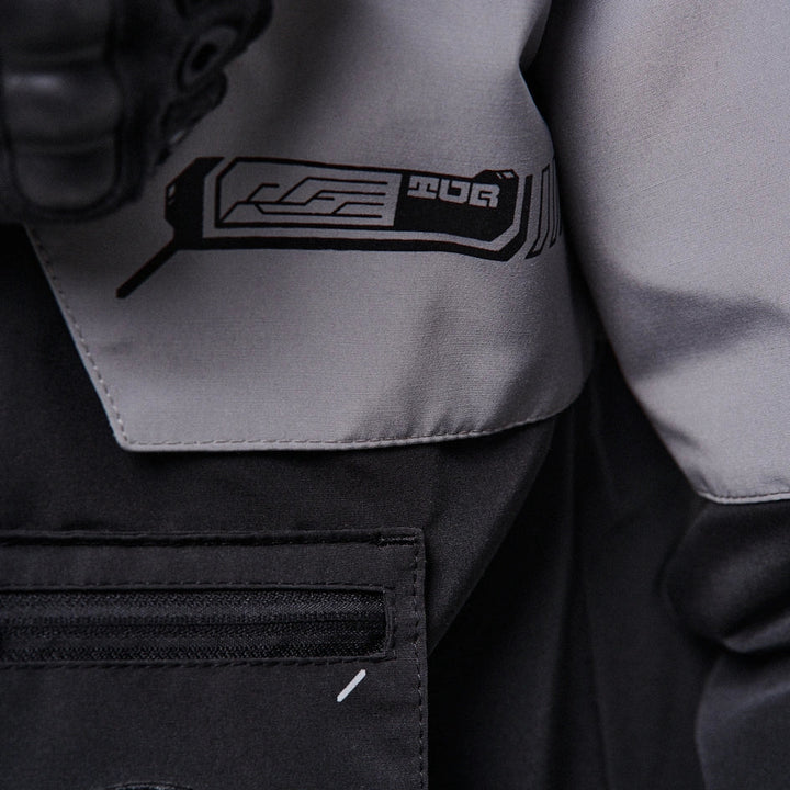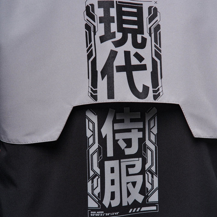 Classic-cut windbreaker with a deep, vertically adjustable hood. Decorative elements sewn on the sleeve and chest, with a zippered pocket on the left side. On the right – a partially hidden strap with a D-ring for attaching keychains or pouches; a branded strap keychain is attached as standard. Two lower zippered pockets, adjustable hem with an elastic cord. On the left front side – a detachable zippered pocket with a print and velcro panel for patches. Adjustable velcro cuffs. The interior is finished with a soft fabric and breathable mesh lining. Two inside zippered pockets. In total – 7 cyberpunk-style prints. Main fabric – dense, soft-to-the-touch nylon-type fabric.