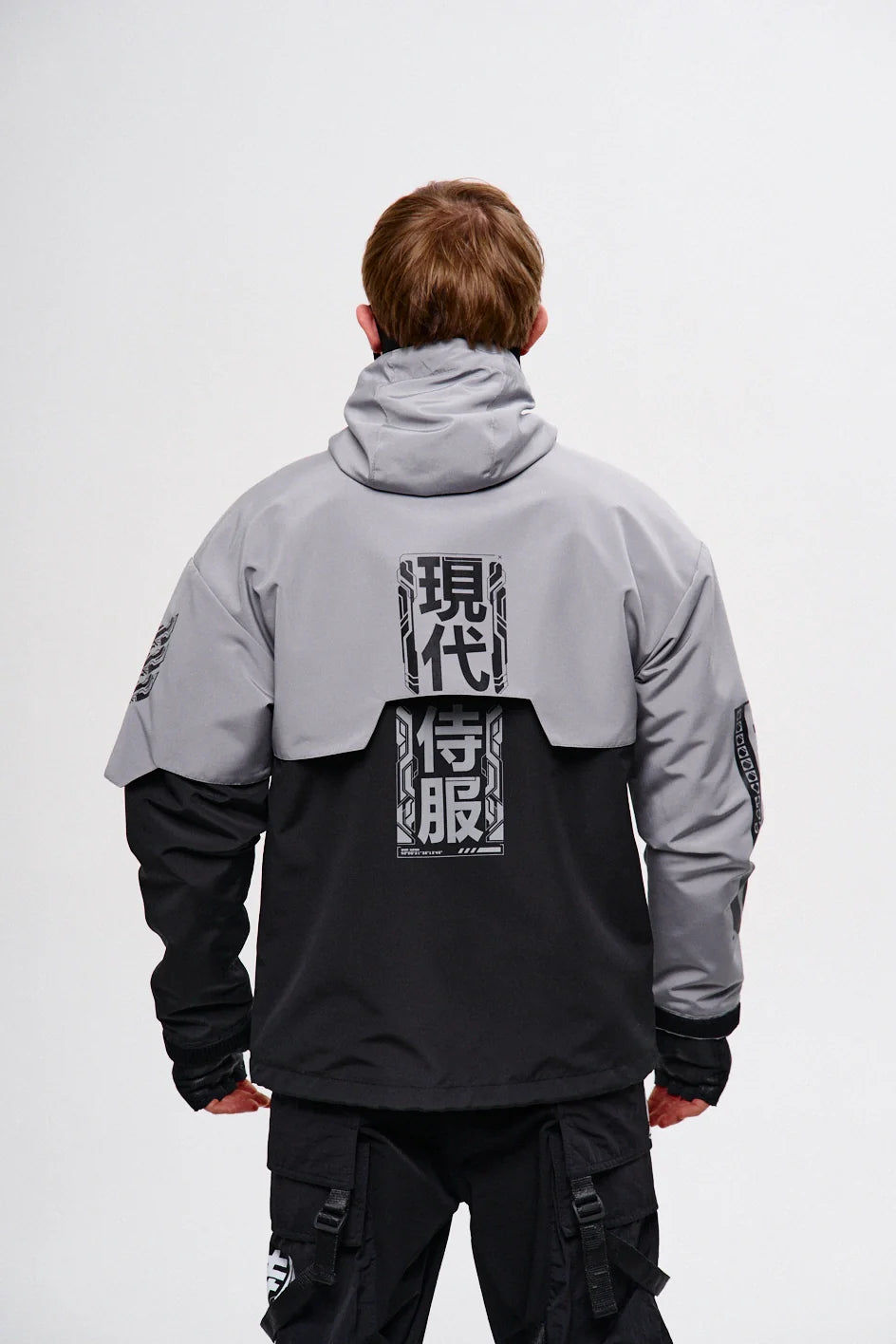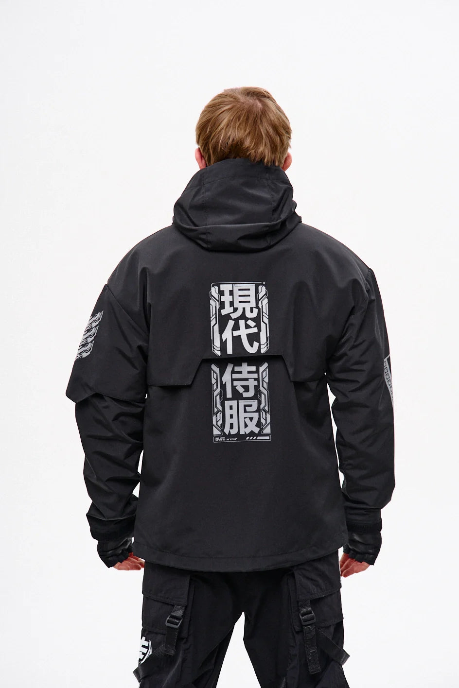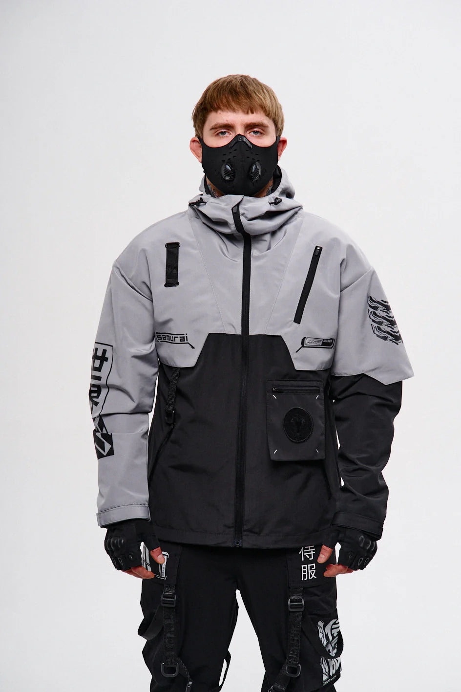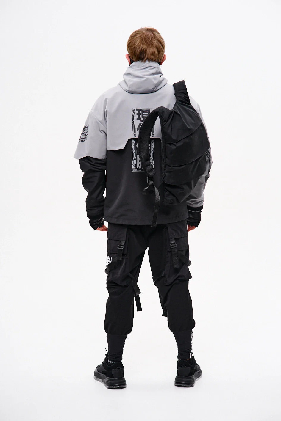 Classic-cut windbreaker with a deep, vertically adjustable hood. Decorative elements sewn on the sleeve and chest, with a zippered pocket on the left side. On the right – a partially hidden strap with a D-ring for attaching keychains or pouches; a branded strap keychain is attached as standard. Two lower zippered pockets, adjustable hem with an elastic cord. On the left front side – a detachable zippered pocket with a print and velcro panel for patches. Adjustable velcro cuffs. The interior is finished with a soft fabric and breathable mesh lining. Two inside zippered pockets. In total – 7 cyberpunk-style prints. Main fabric – dense, soft-to-the-touch nylon-type fabric.