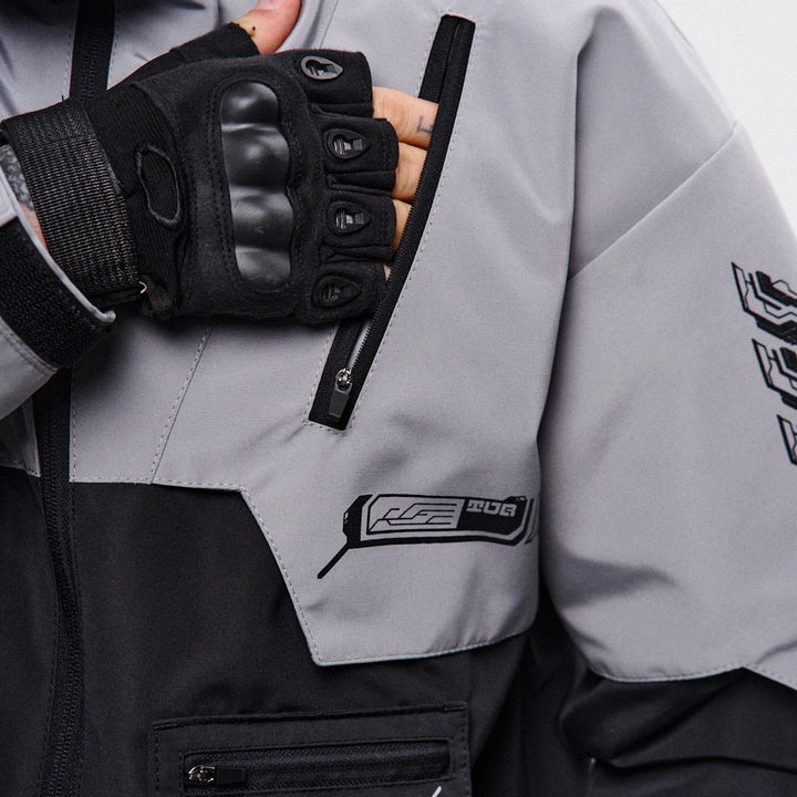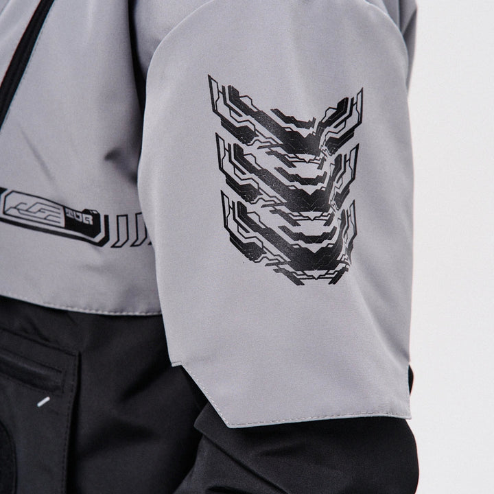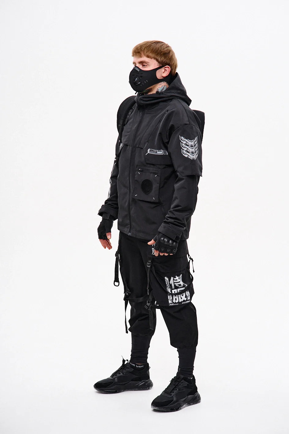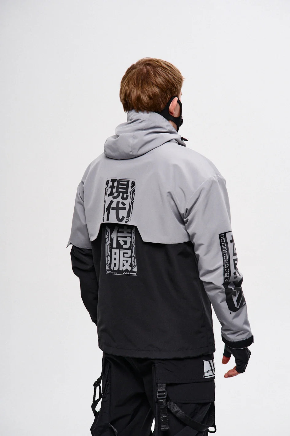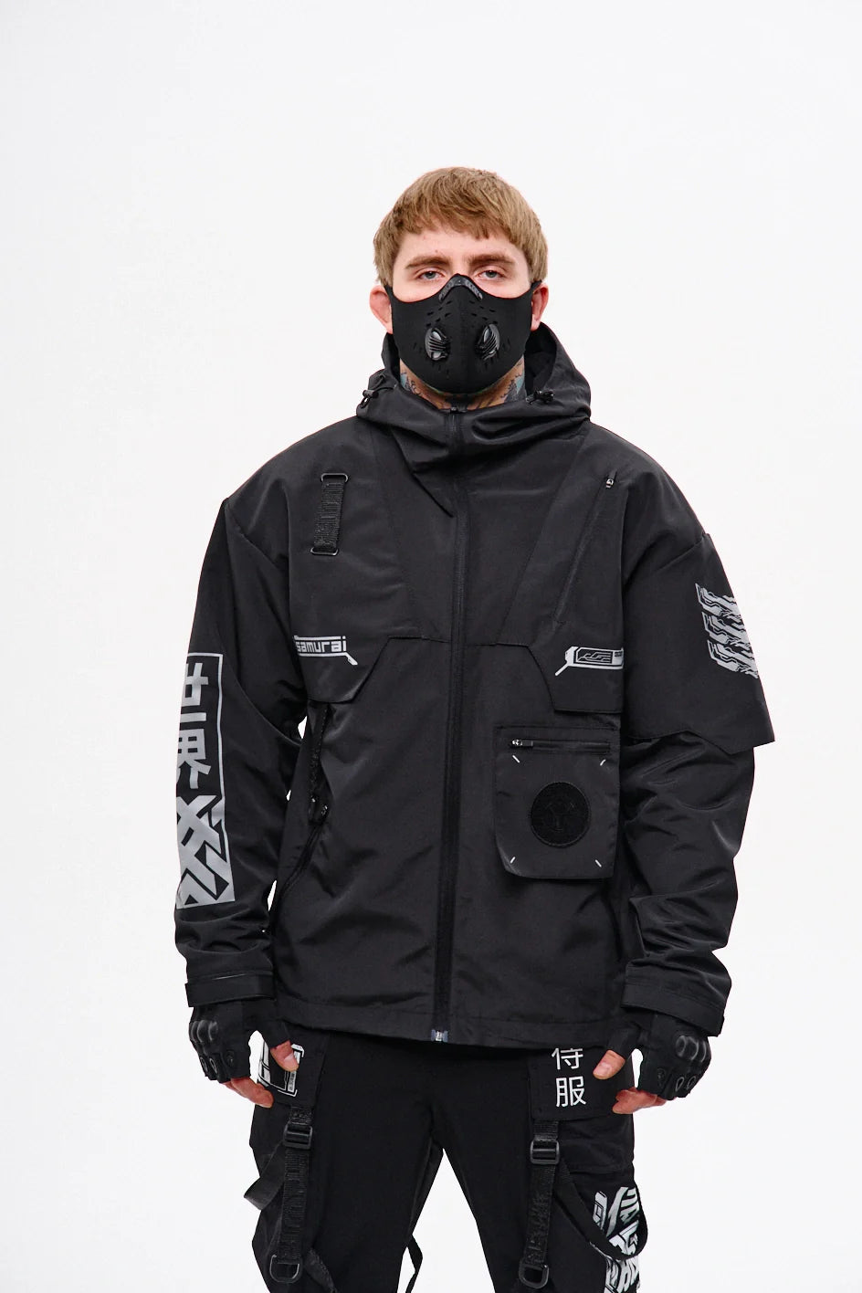 Classic-cut windbreaker with a deep, vertically adjustable hood. Decorative elements sewn on the sleeve and chest, with a zippered pocket on the left side. On the right – a partially hidden strap with a D-ring for attaching keychains or pouches; a branded strap keychain is attached as standard. Two lower zippered pockets, adjustable hem with an elastic cord. On the left front side – a detachable zippered pocket with a print and velcro panel for patches. Adjustable velcro cuffs. The interior is finished with a soft fabric and breathable mesh lining. Two inside zippered pockets. In total – 7 cyberpunk-style prints. Main fabric – dense, soft-to-the-touch nylon-type fabric.