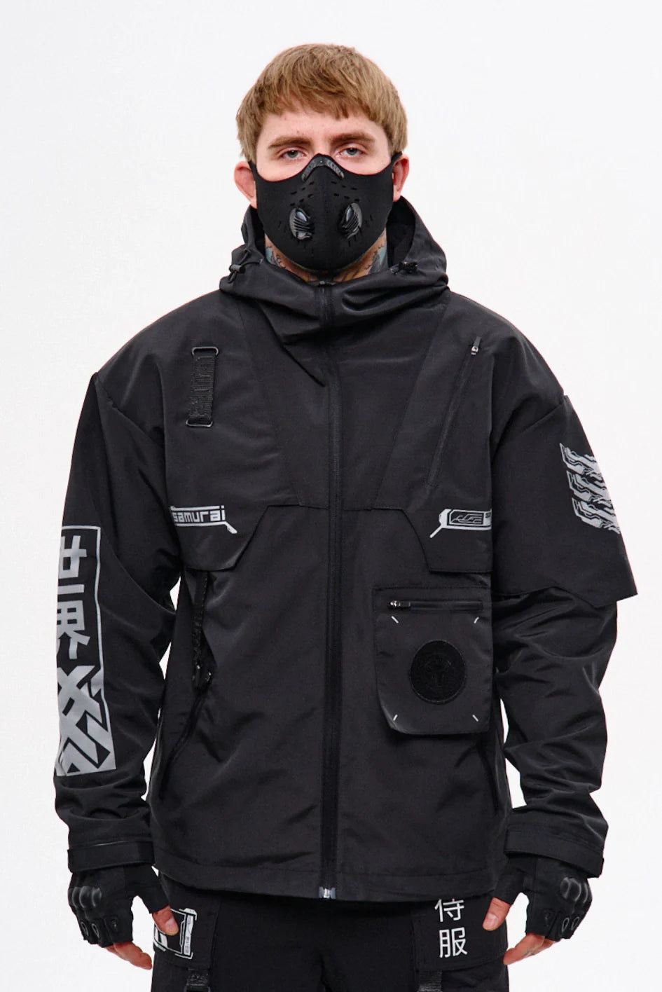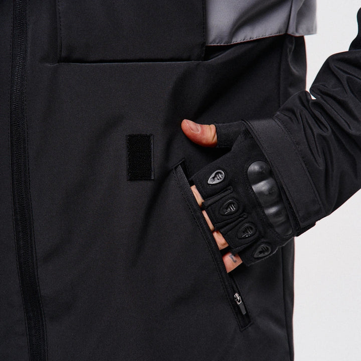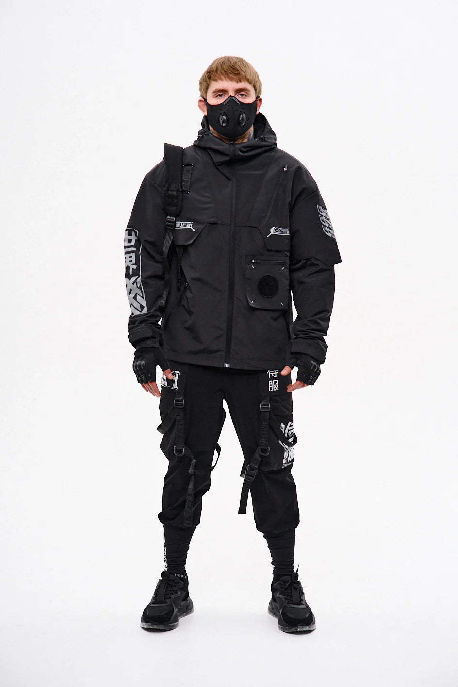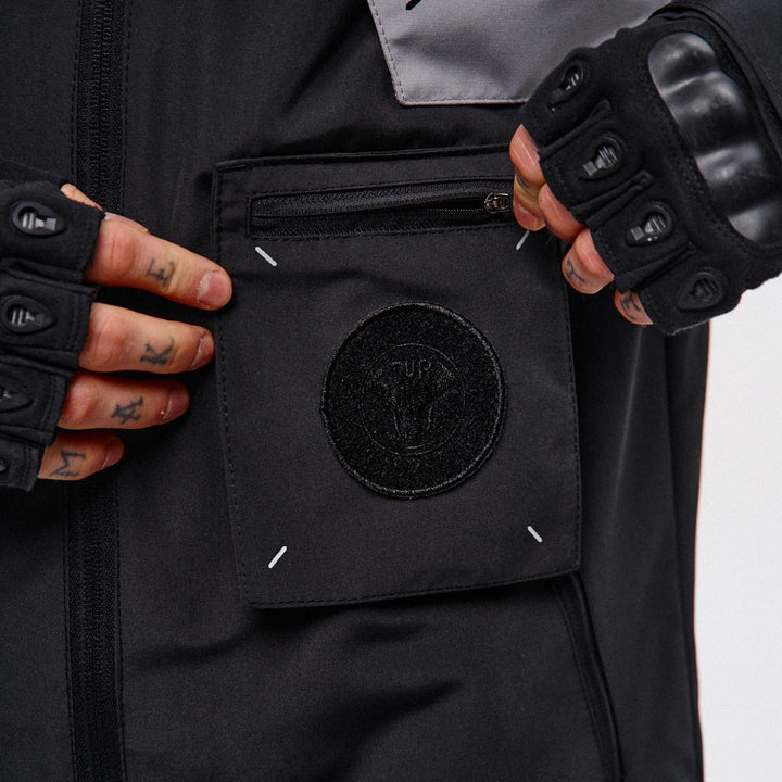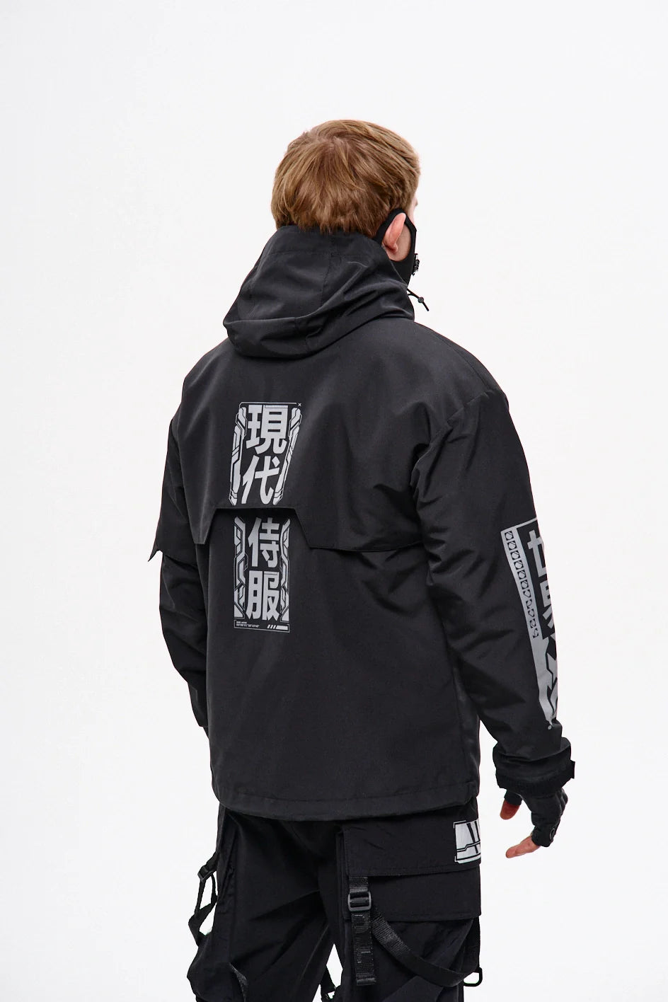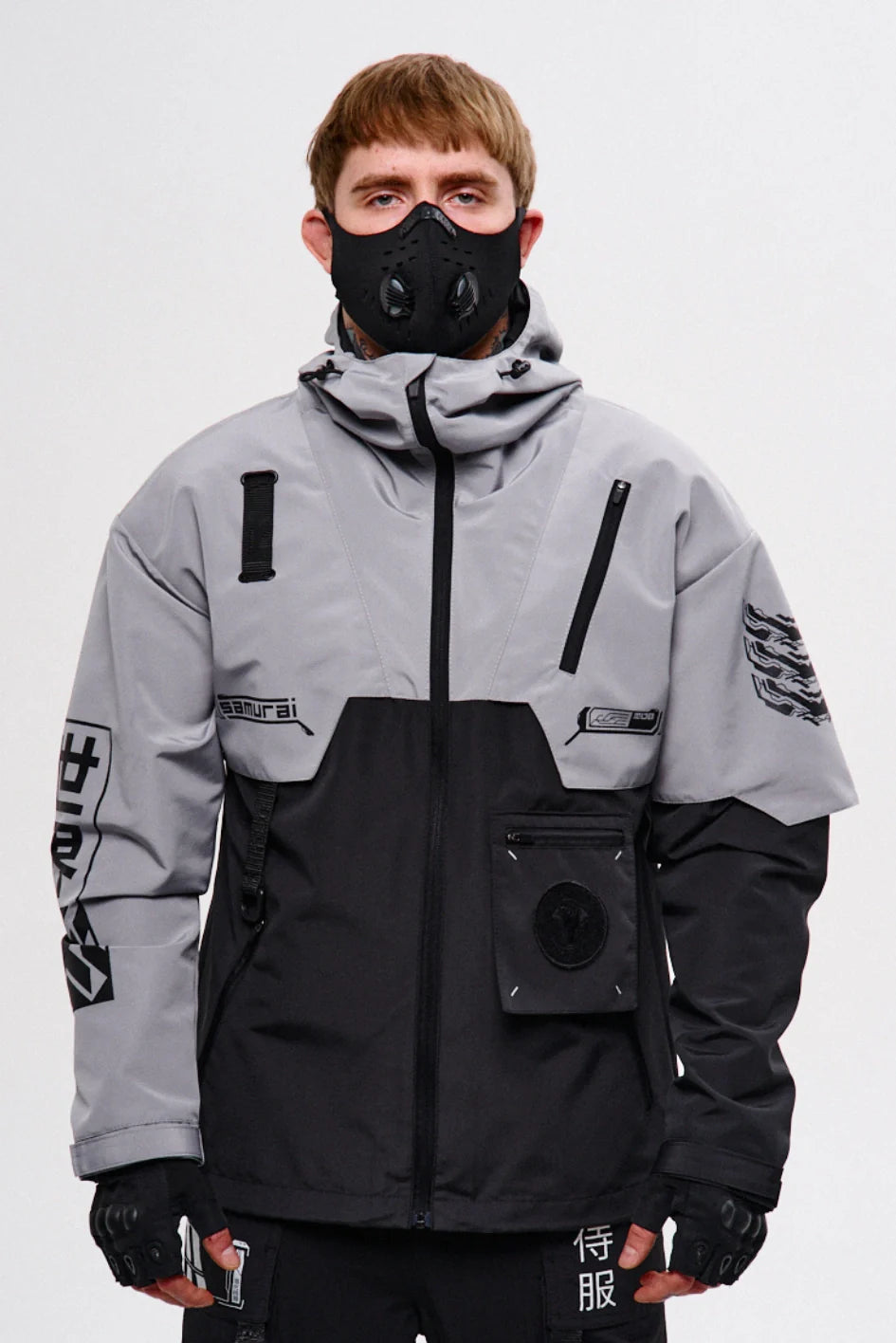 Classic-cut windbreaker with a deep, vertically adjustable hood. Decorative elements sewn on the sleeve and chest, with a zippered pocket on the left side. On the right – a partially hidden strap with a D-ring for attaching keychains or pouches; a branded strap keychain is attached as standard. Two lower zippered pockets, adjustable hem with an elastic cord. On the left front side – a detachable zippered pocket with a print and velcro panel for patches. Adjustable velcro cuffs. The interior is finished with a soft fabric and breathable mesh lining. Two inside zippered pockets. In total – 7 cyberpunk-style prints. Main fabric – dense, soft-to-the-touch nylon-type fabric.