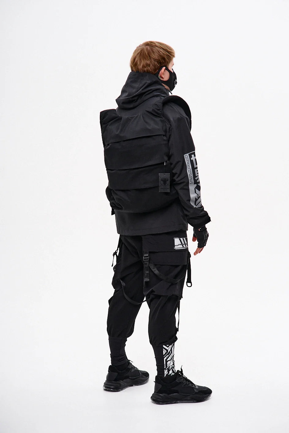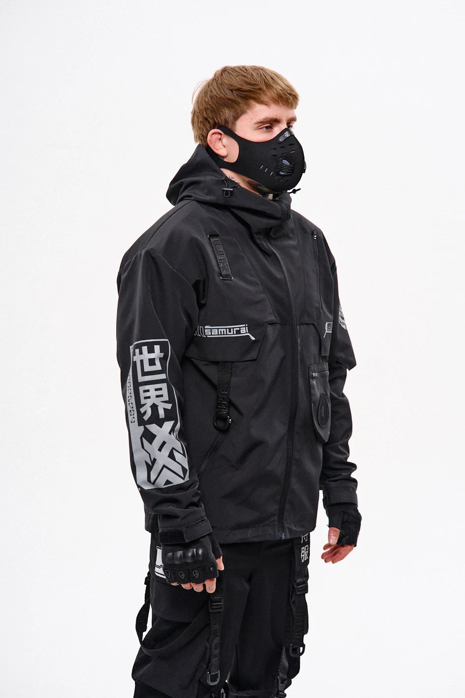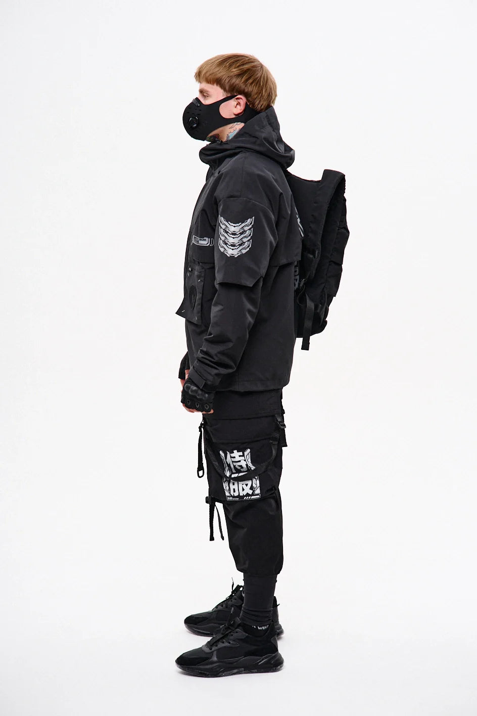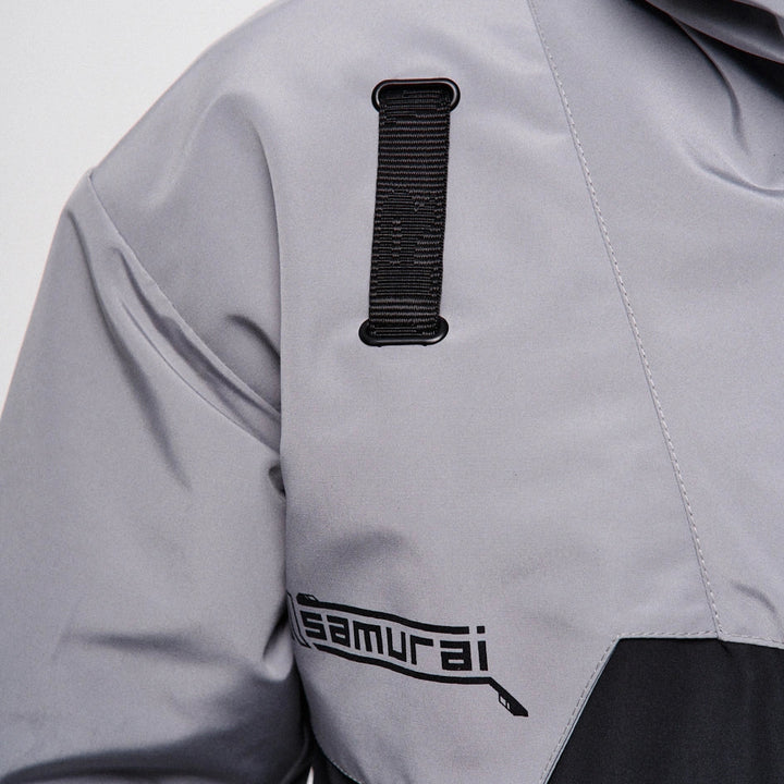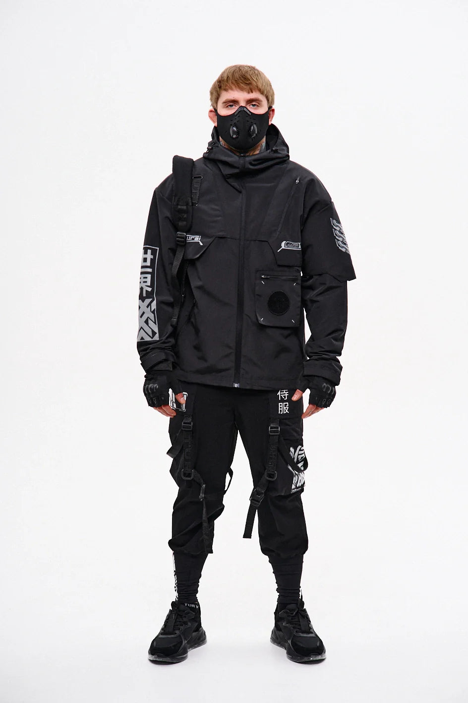 Classic-cut windbreaker with a deep, vertically adjustable hood. Decorative elements sewn on the sleeve and chest, with a zippered pocket on the left side. On the right – a partially hidden strap with a D-ring for attaching keychains or pouches; a branded strap keychain is attached as standard. Two lower zippered pockets, adjustable hem with an elastic cord. On the left front side – a detachable zippered pocket with a print and velcro panel for patches. Adjustable velcro cuffs. The interior is finished with a soft fabric and breathable mesh lining. Two inside zippered pockets. In total – 7 cyberpunk-style prints. Main fabric – dense, soft-to-the-touch nylon-type fabric.
