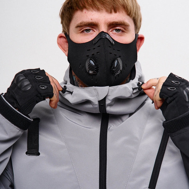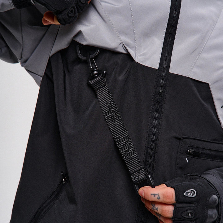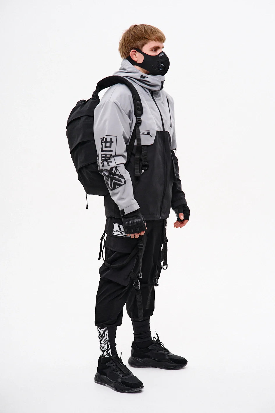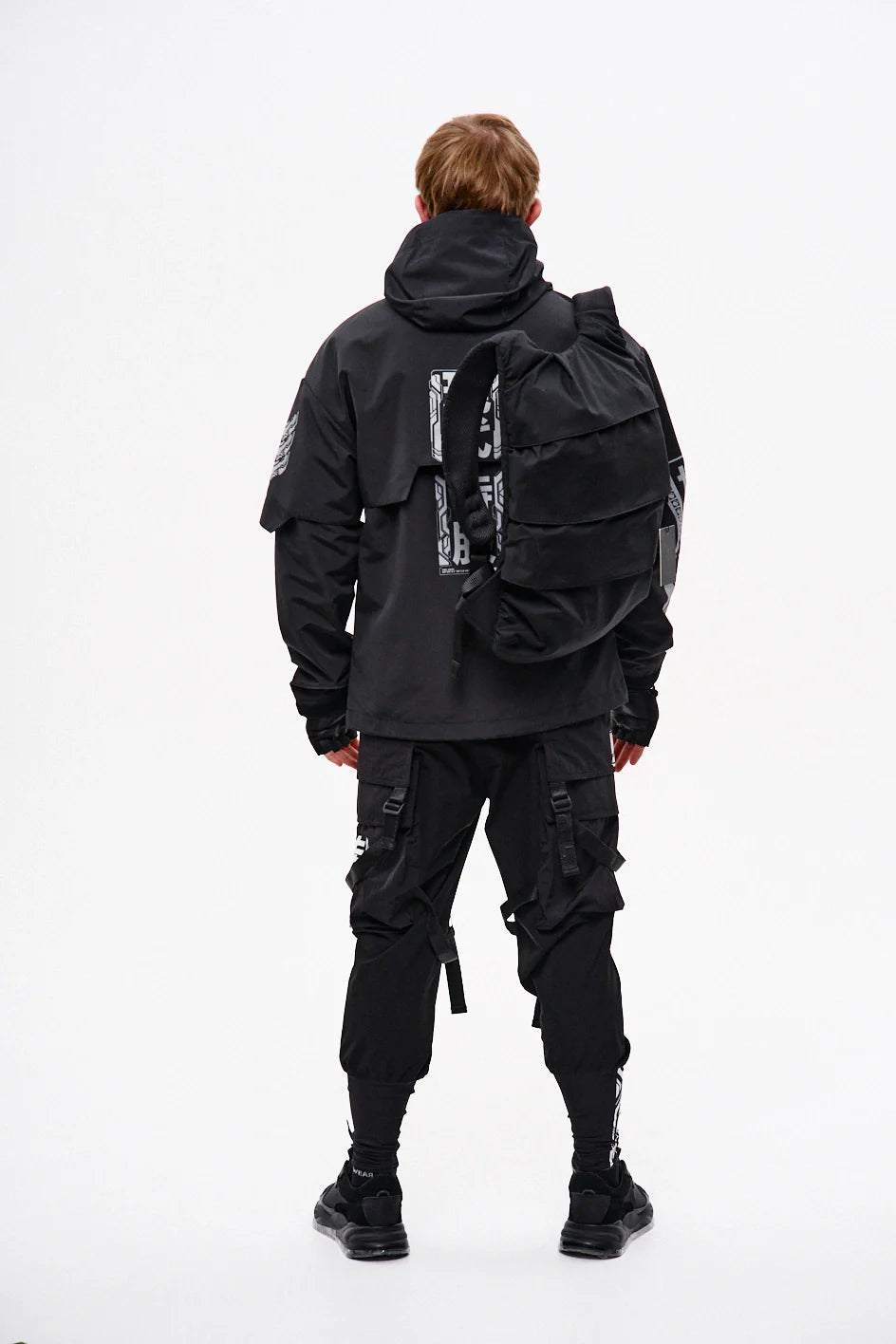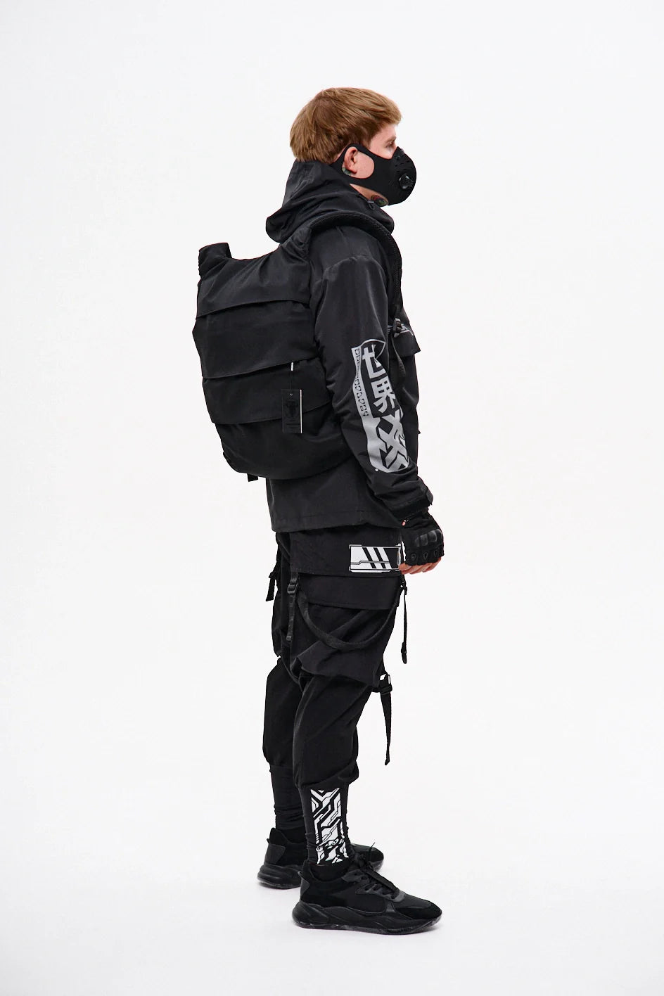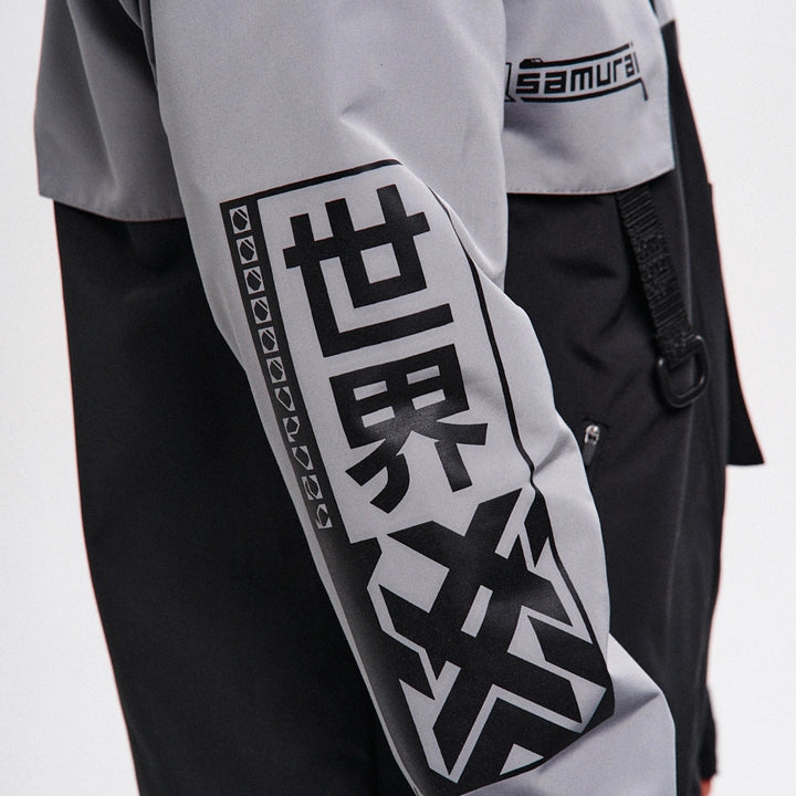 Classic-cut windbreaker with a deep, vertically adjustable hood. Decorative elements sewn on the sleeve and chest, with a zippered pocket on the left side. On the right – a partially hidden strap with a D-ring for attaching keychains or pouches; a branded strap keychain is attached as standard. Two lower zippered pockets, adjustable hem with an elastic cord. On the left front side – a detachable zippered pocket with a print and velcro panel for patches. Adjustable velcro cuffs. The interior is finished with a soft fabric and breathable mesh lining. Two inside zippered pockets. In total – 7 cyberpunk-style prints. Main fabric – dense, soft-to-the-touch nylon-type fabric.