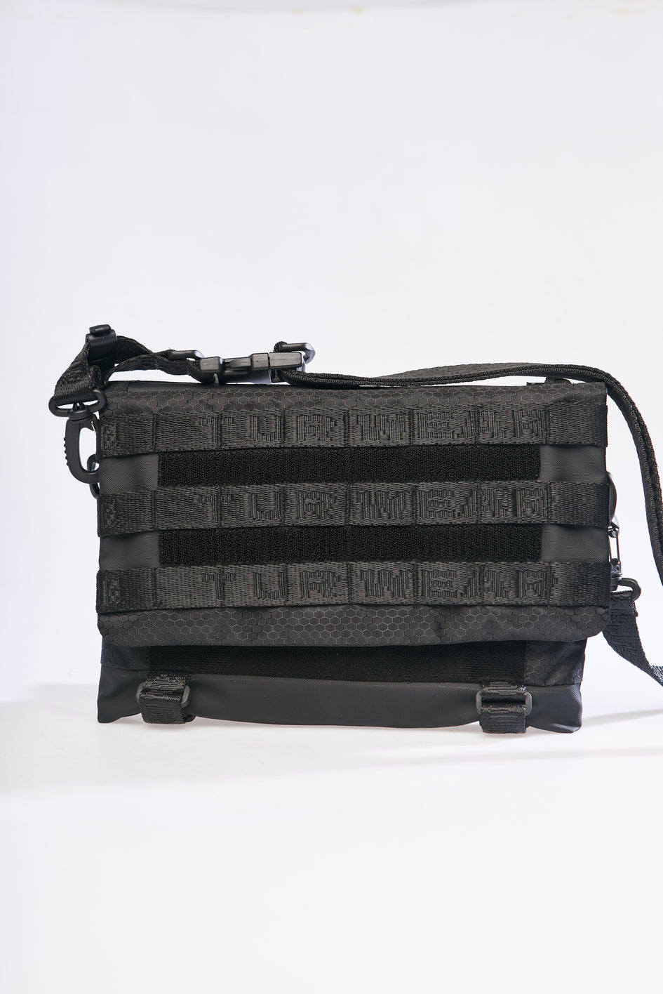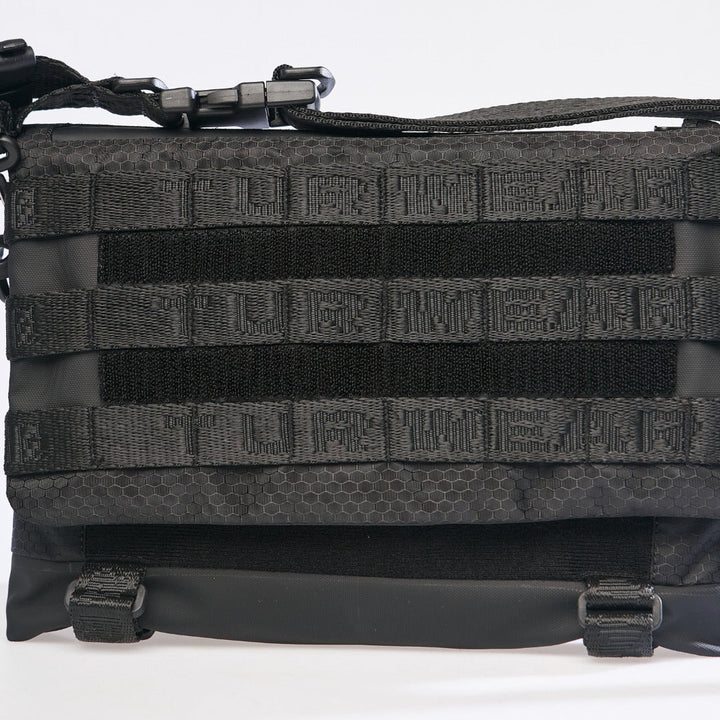 Equipped with a functional handle with carabiners and a load-bearing hook. The front features a branded MOLLE system for attaching additional accessories.
