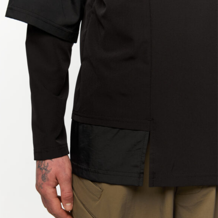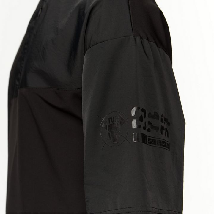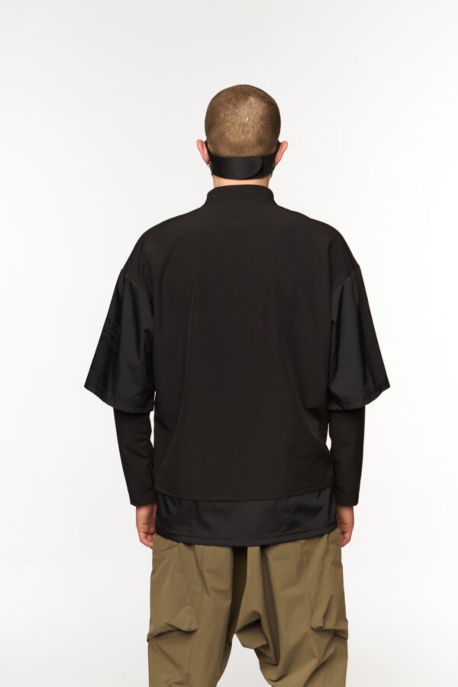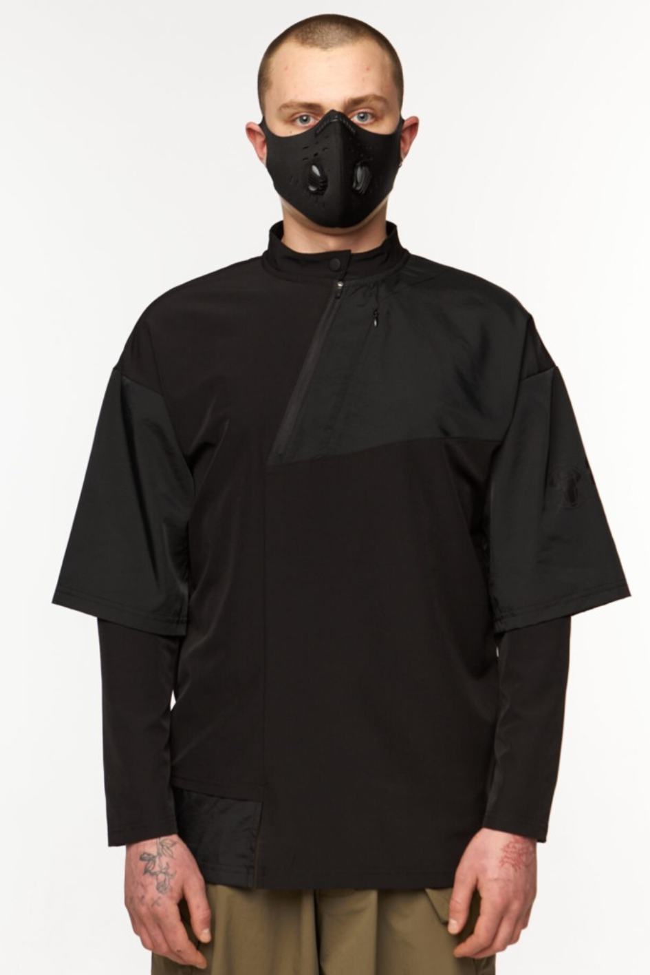 Key Features of the Model: A kimono-style long sleeve with a complex cut and a combination of different fabrics. The upper sleeve imitates a kimono, made of crinkle fabric. From the kimono sleeve, a sleeve made from the main fabric extends. The left upper part of the front is made of crinkle fabric, featuring a hidden zipper pocket. The stand-up collar is made from the main fabric and fastens with a button. The asymmetric zipper allows for a more open neckline. The right lower part of the garment has a shirt-tail effect. A black print is placed on the left sleeve.