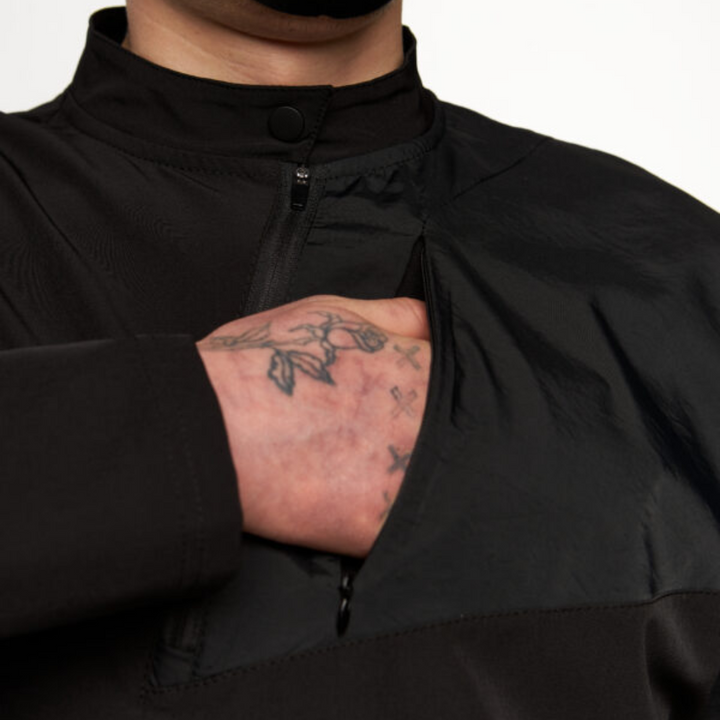 The upper left front part is made of coat fabric. This element features a hidden zip pocket
