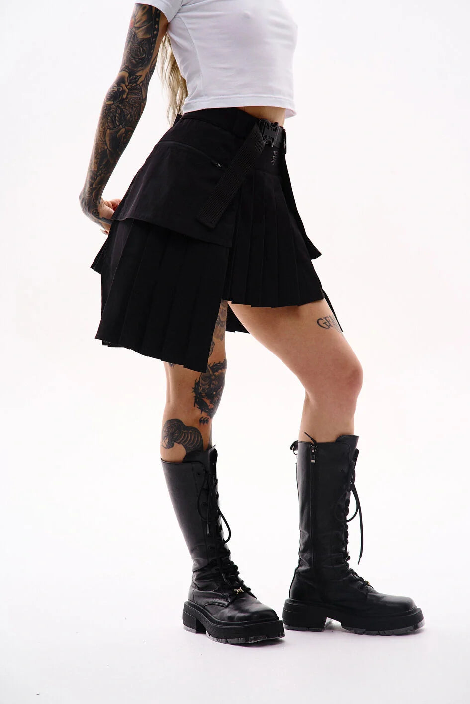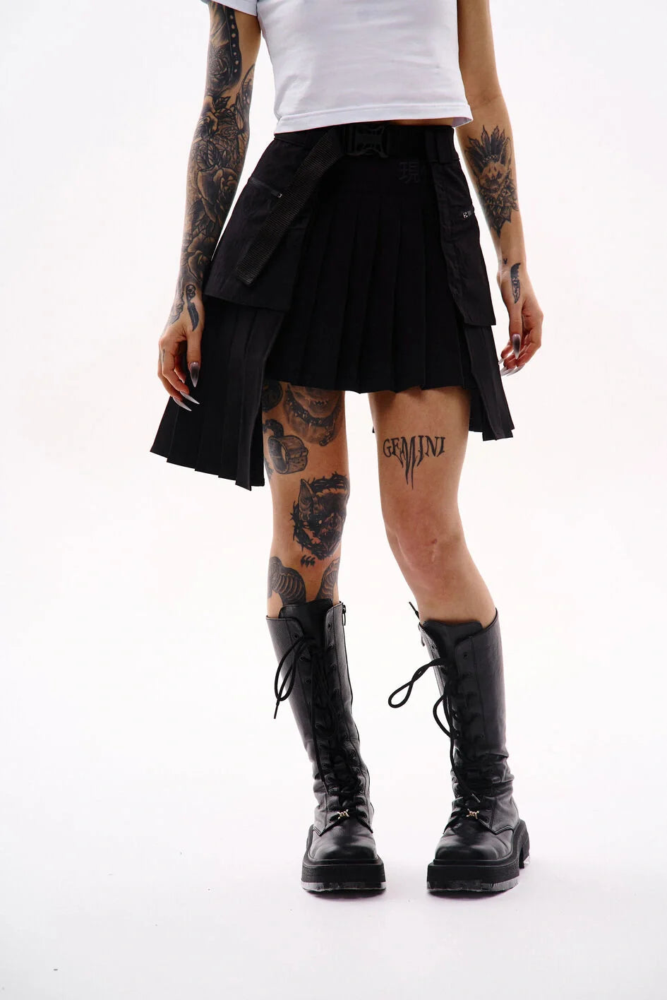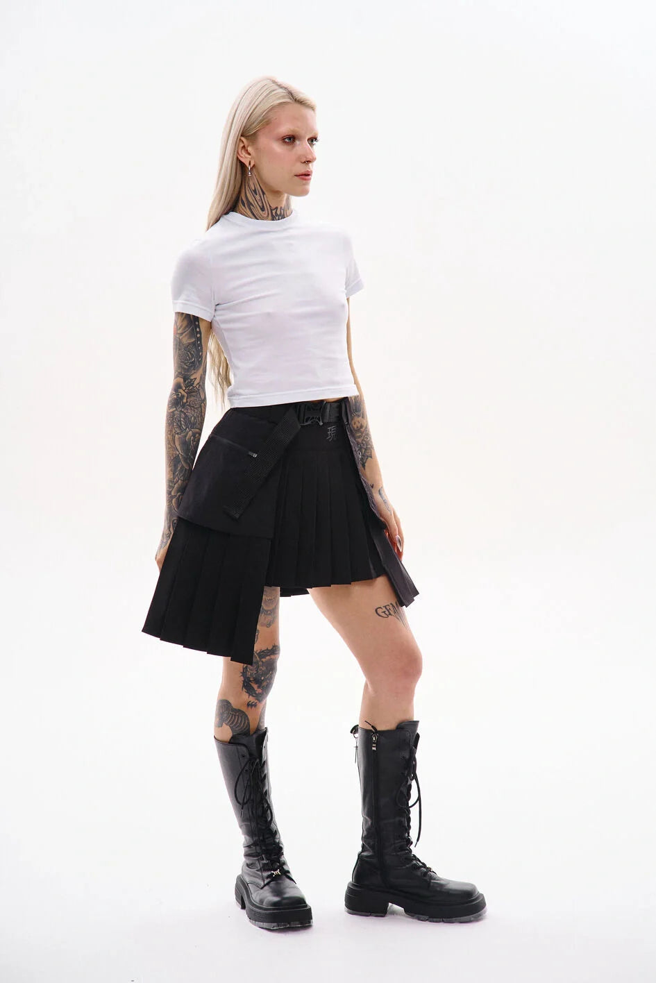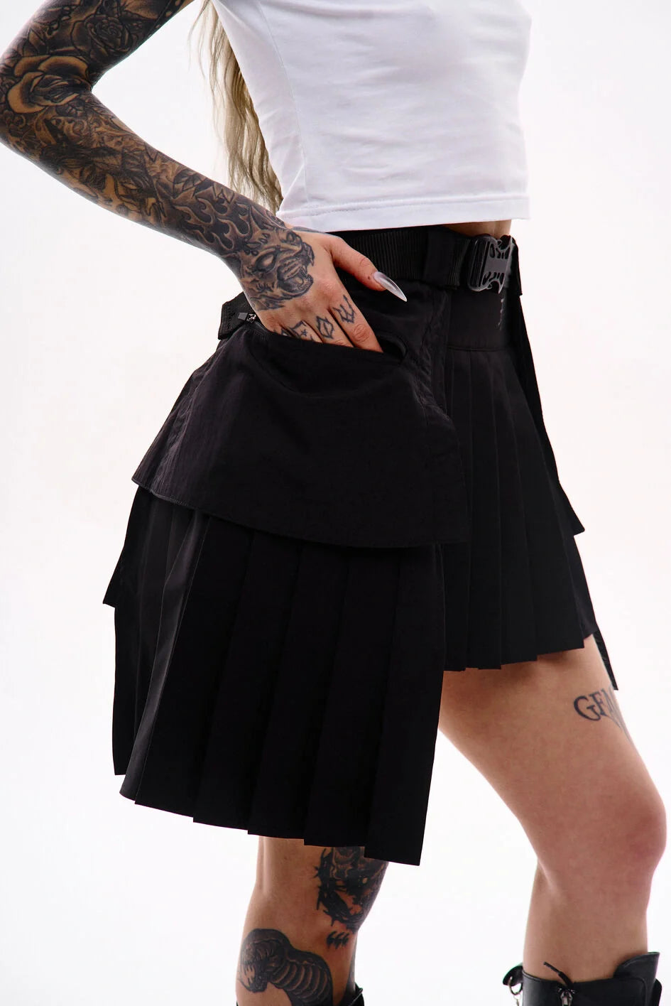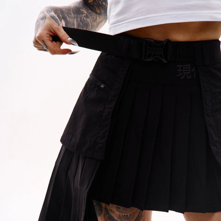 Wrap skirt with pleats fitted on the hips, sitting on a wide waistband. Inside, there is a belt strap with a fast-release buckle. On the sides, two detachable pockets made of crinkle fabric fasten with spiral reverse zippers.