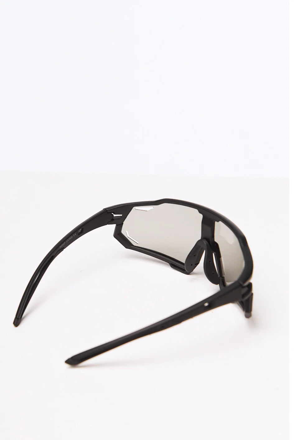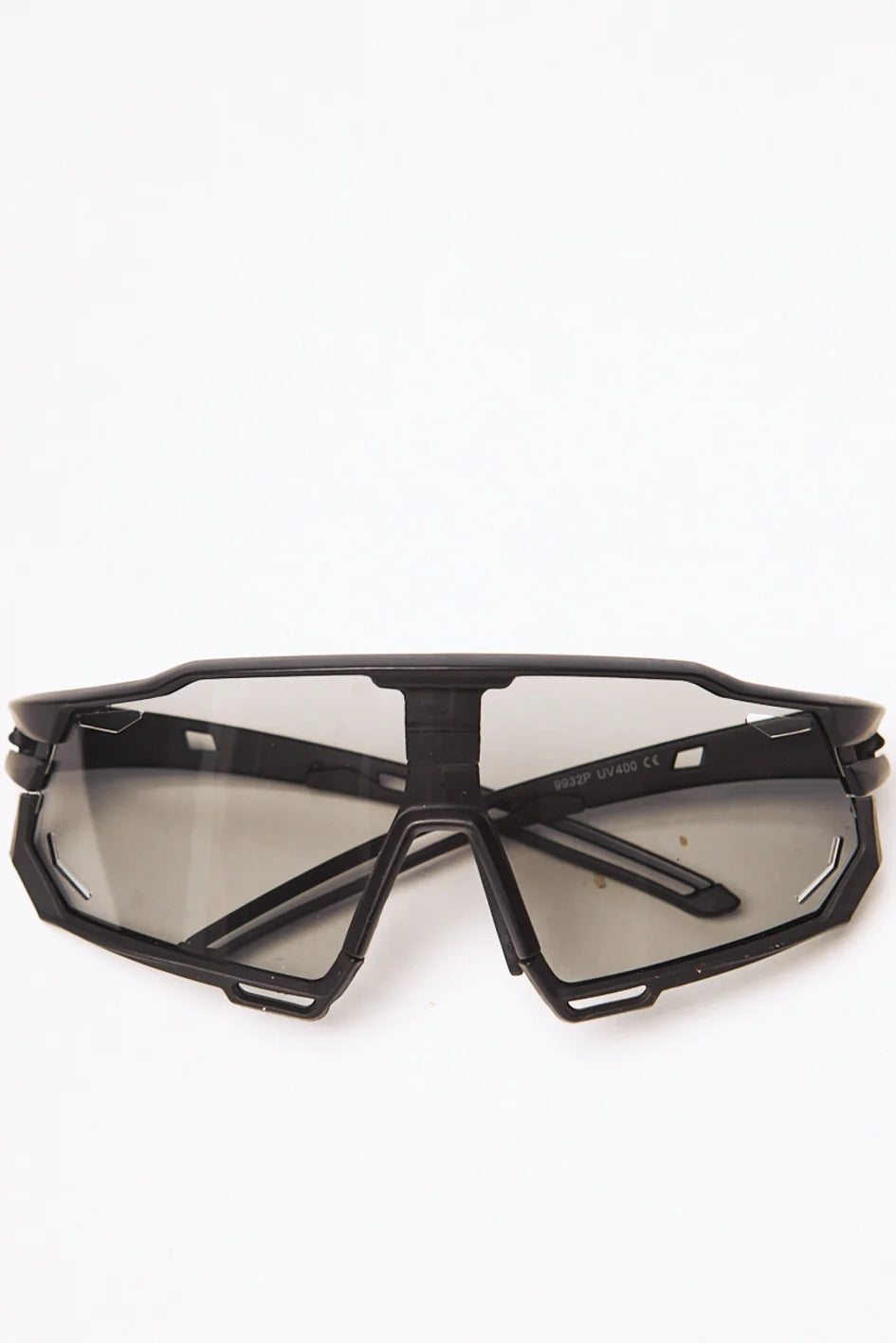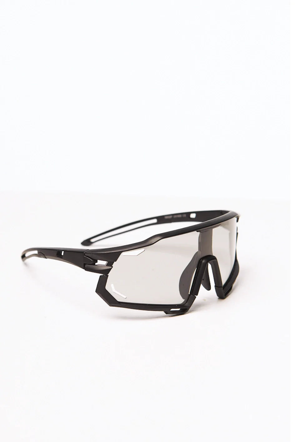 Sport-style photochromic sunglasses in a sleek black frame. Equipped with polycarbonate lenses that shield your eyes from sun, wind, and sand. UV 400 protection ensures maximum defense against harmful ultraviolet rays. Comes with a protective case.