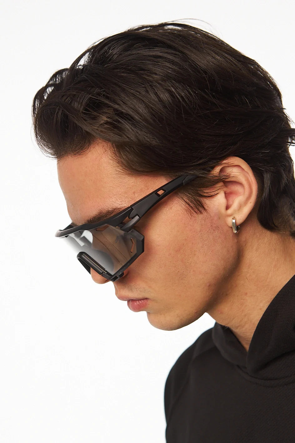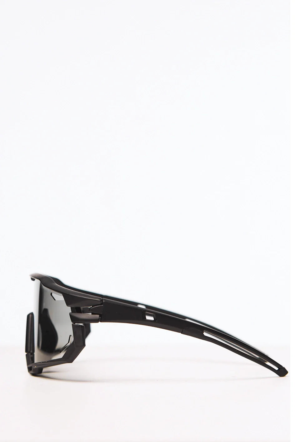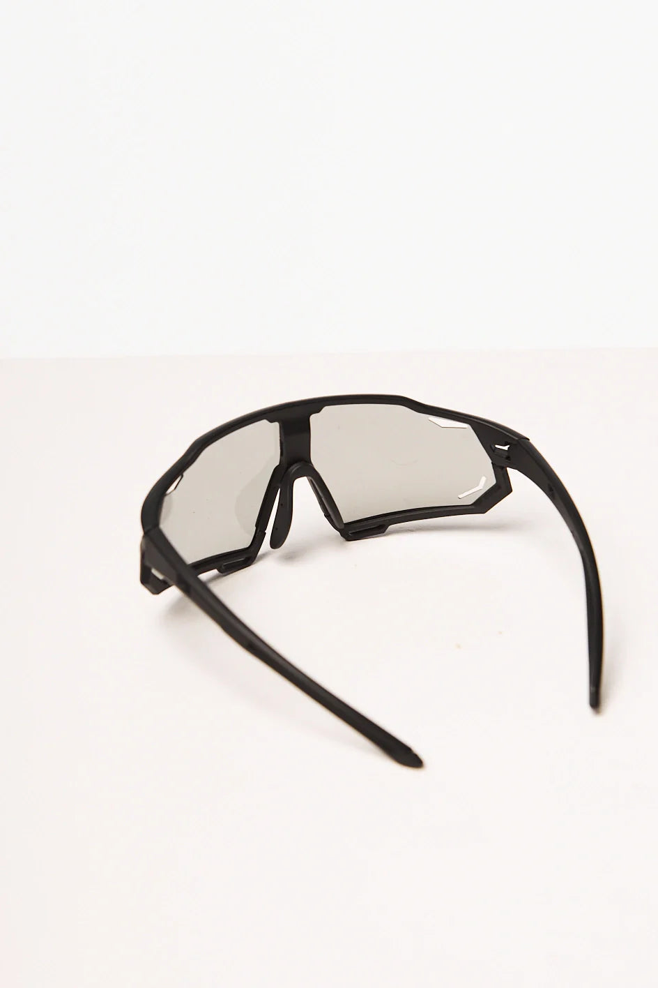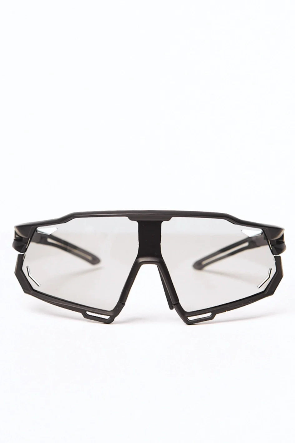 Sport-style photochromic sunglasses in a sleek black frame. Equipped with polycarbonate lenses that shield your eyes from sun, wind, and sand. UV 400 protection ensures maximum defense against harmful ultraviolet rays. Comes with a protective case.