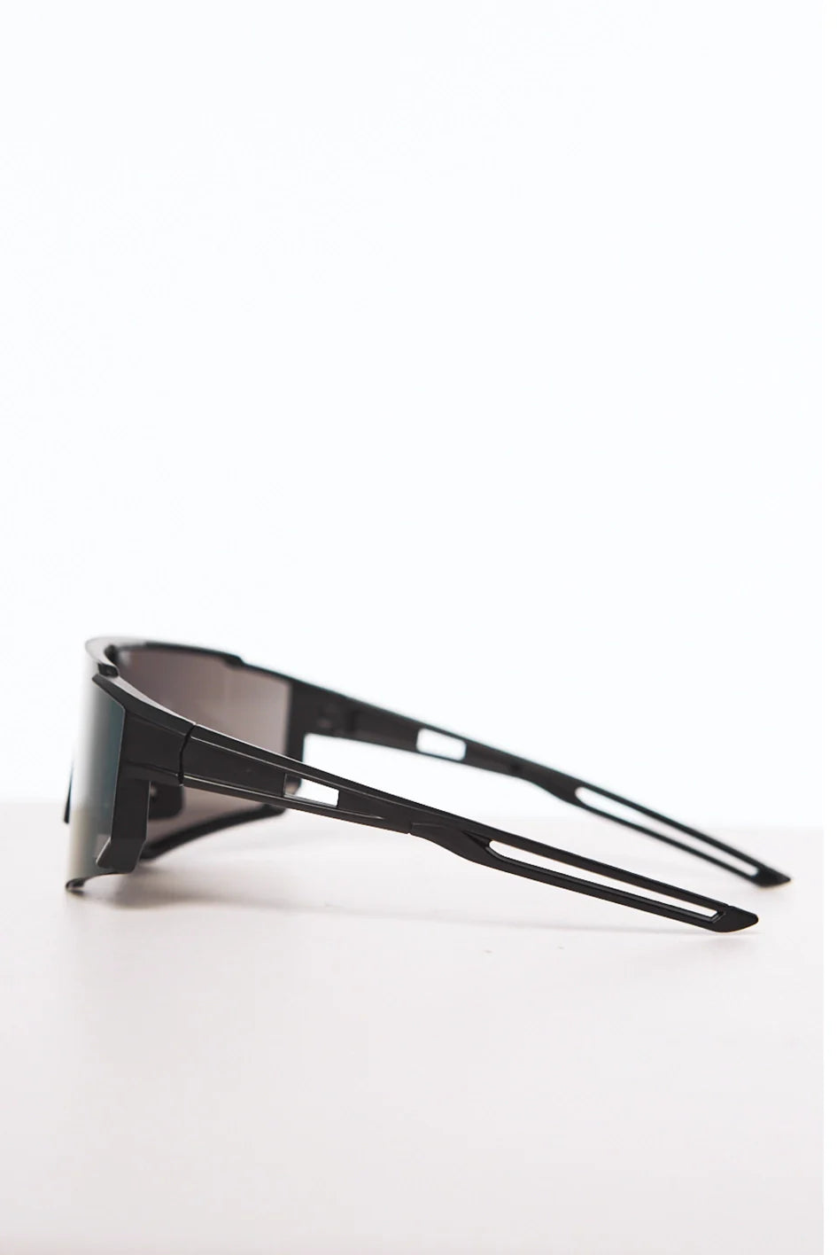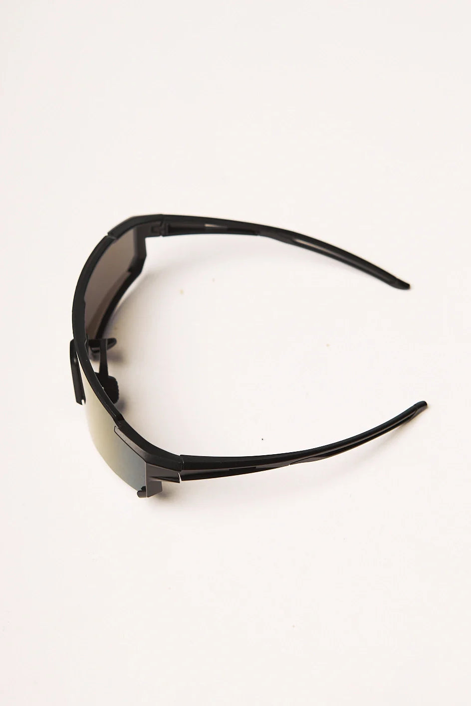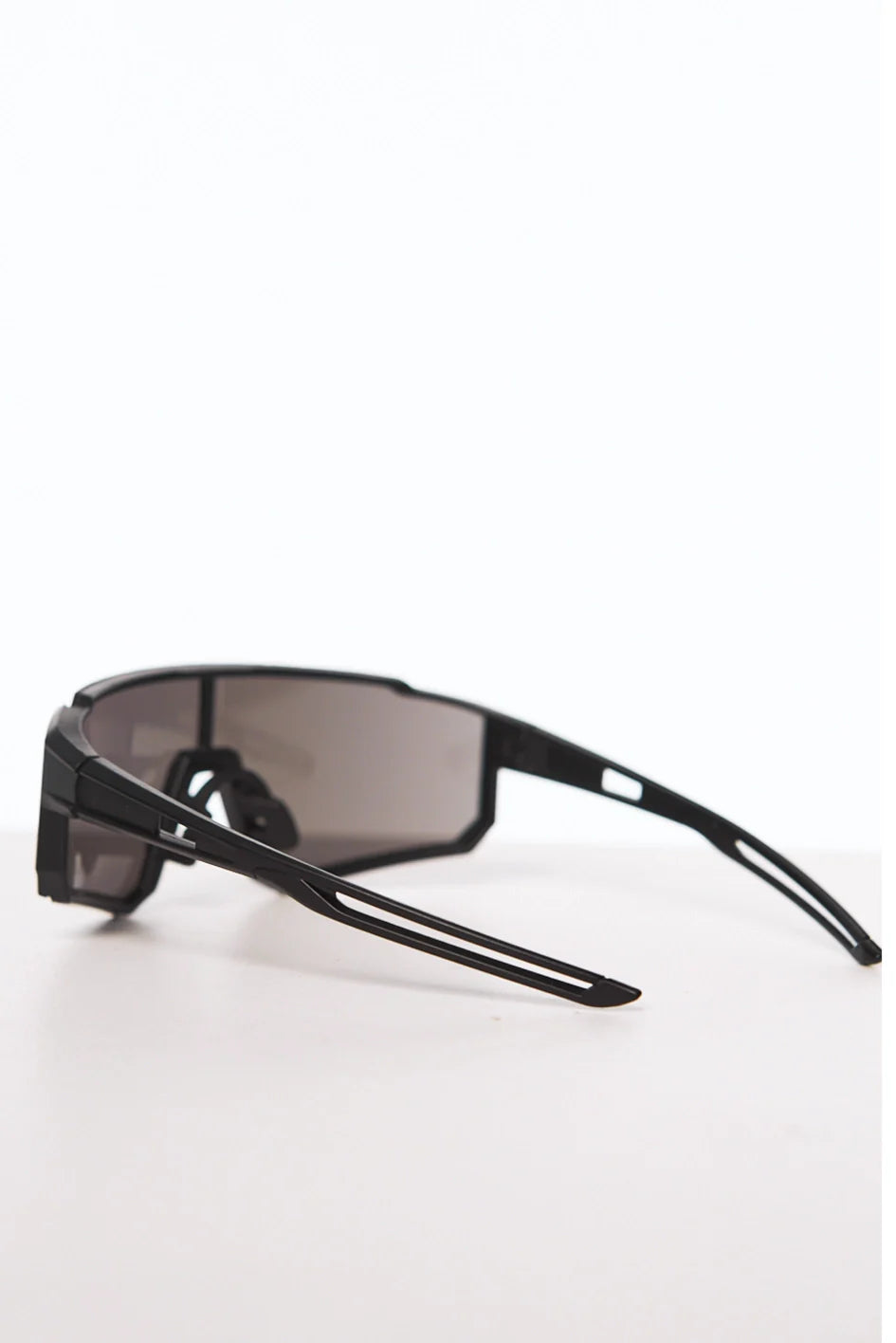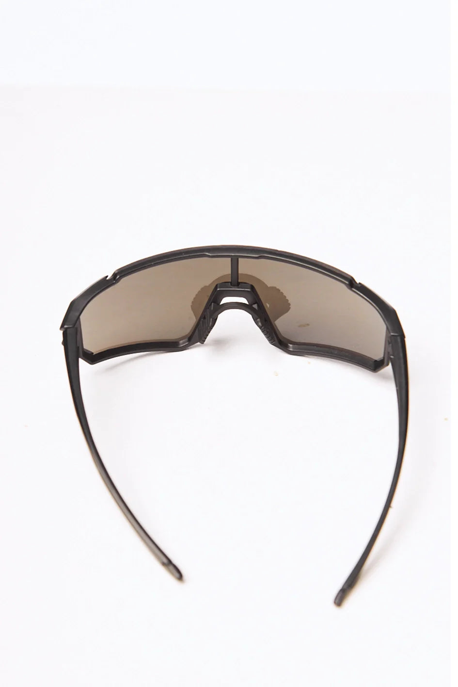 Sport-style photochromic sunglasses in a sleek black frame. Equipped with polycarbonate lenses that shield your eyes from sun, wind, and sand. UV 400 protection ensures maximum defense against harmful ultraviolet rays. Comes with a protective case.