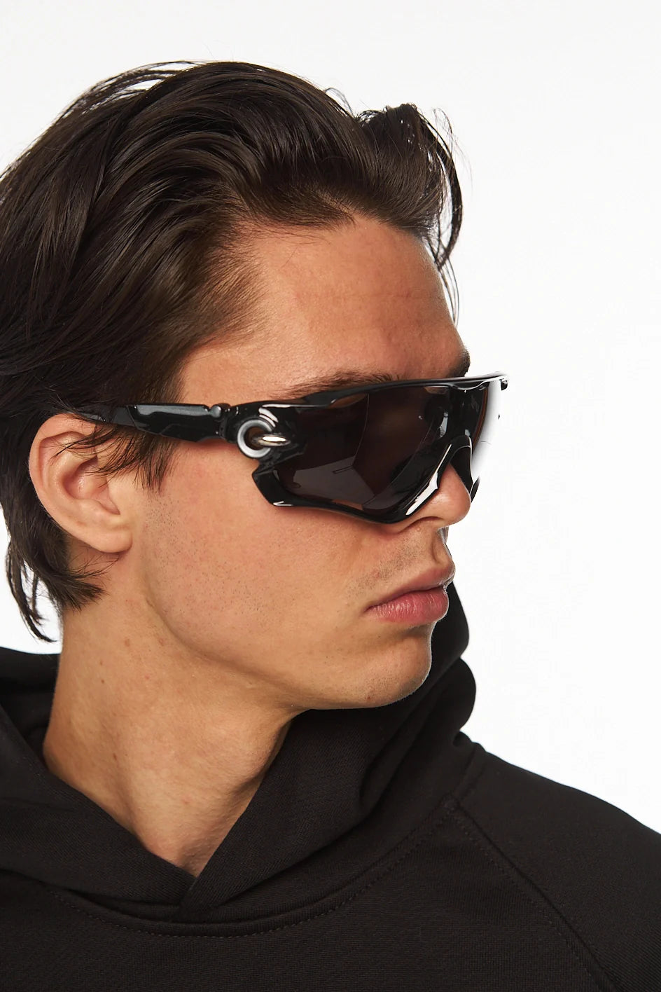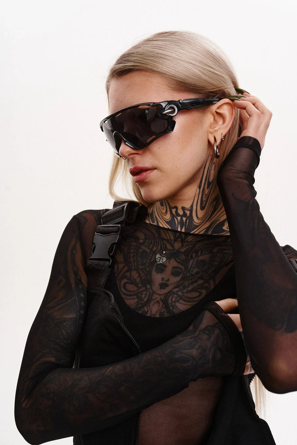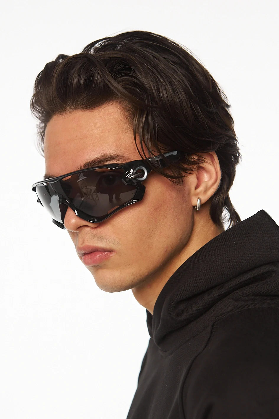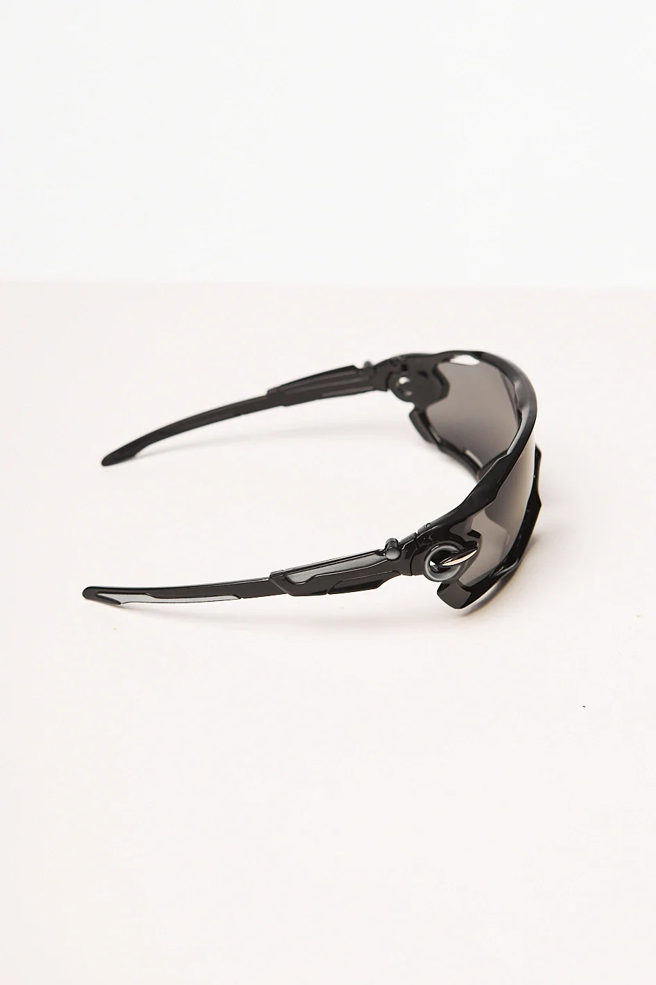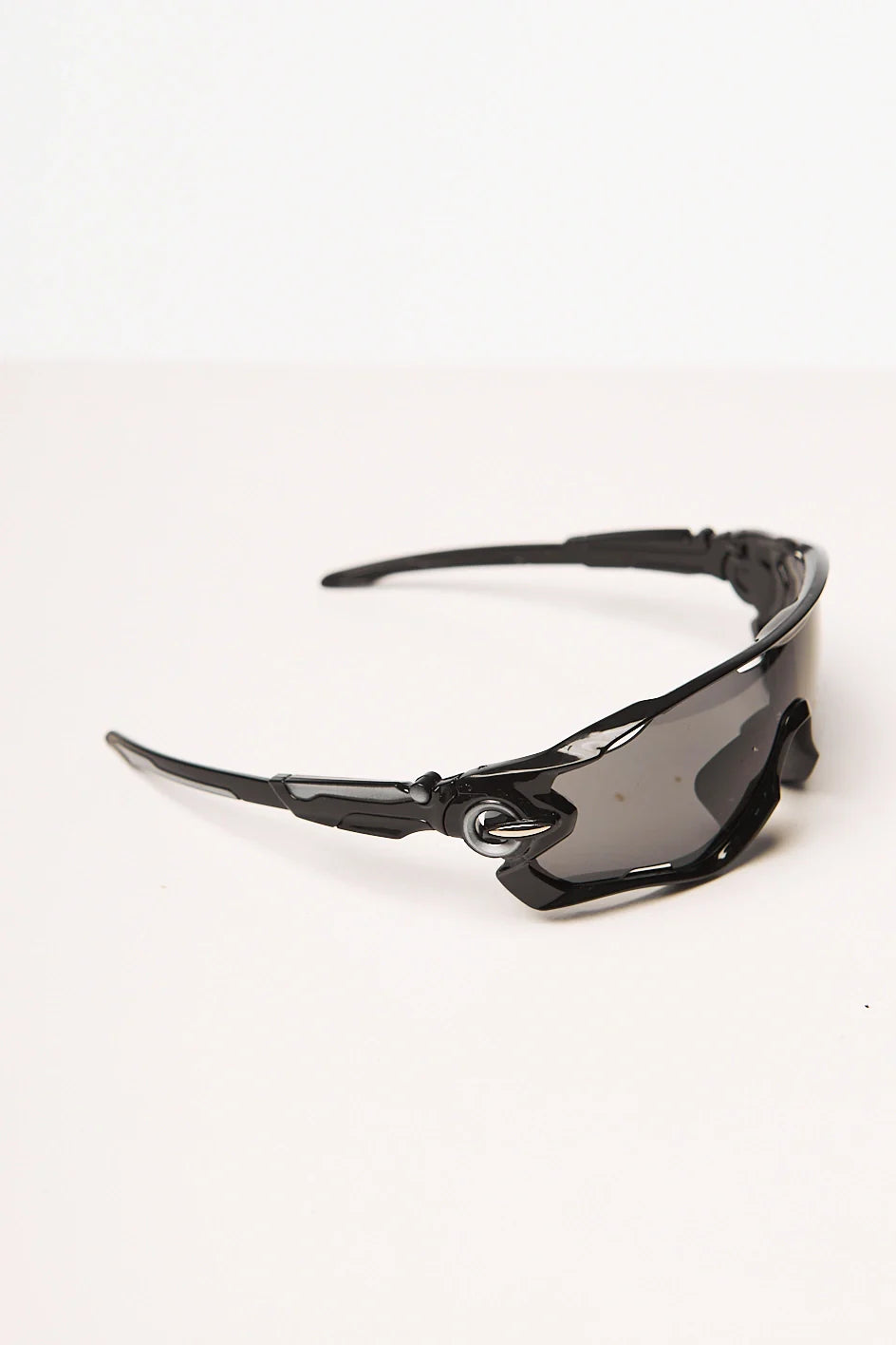 Sport-style photochromic sunglasses in a sleek black frame. Equipped with polycarbonate lenses that shield your eyes from sun, wind, and sand. UV 400 protection ensures maximum defense against harmful ultraviolet rays. Comes with a protective case.