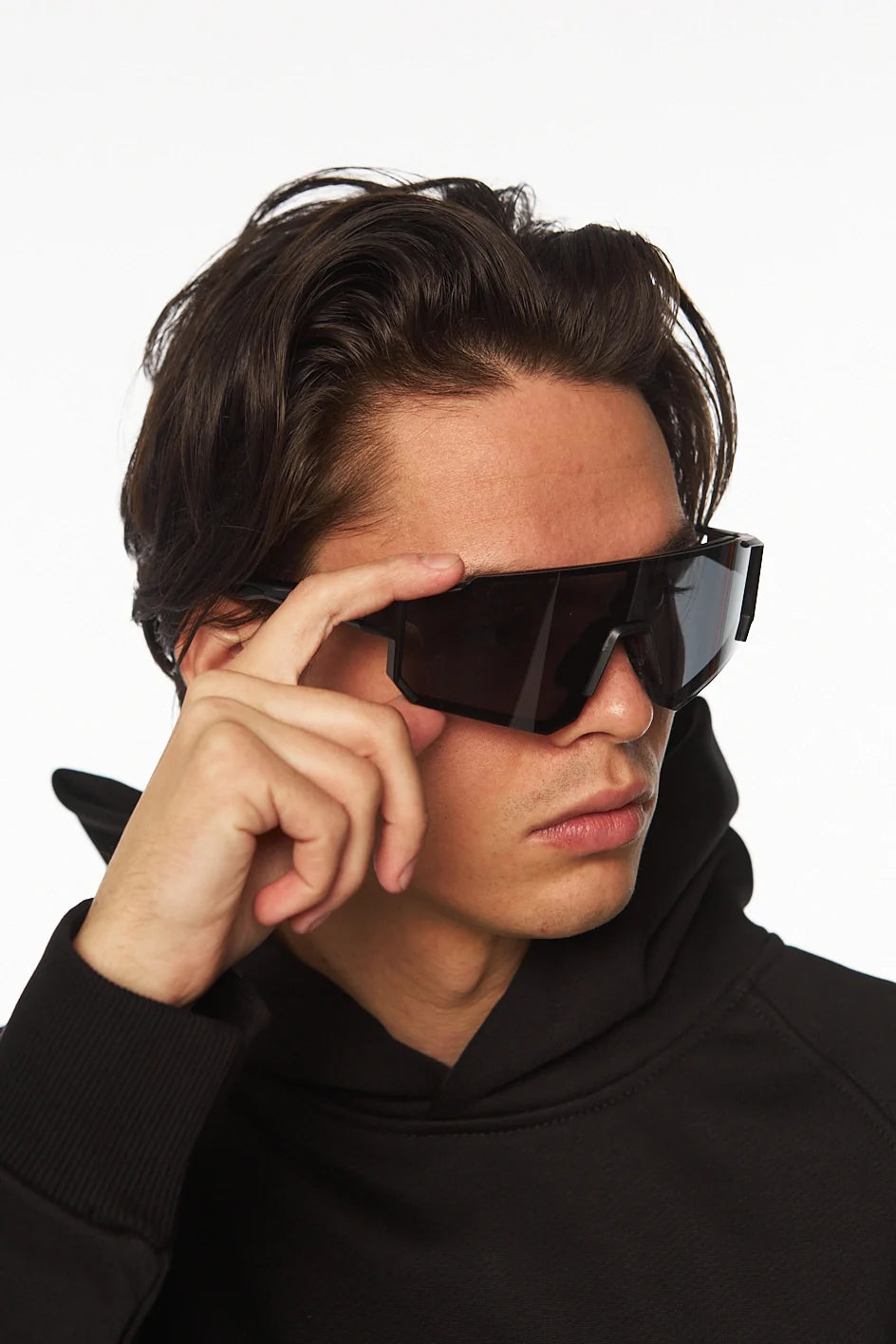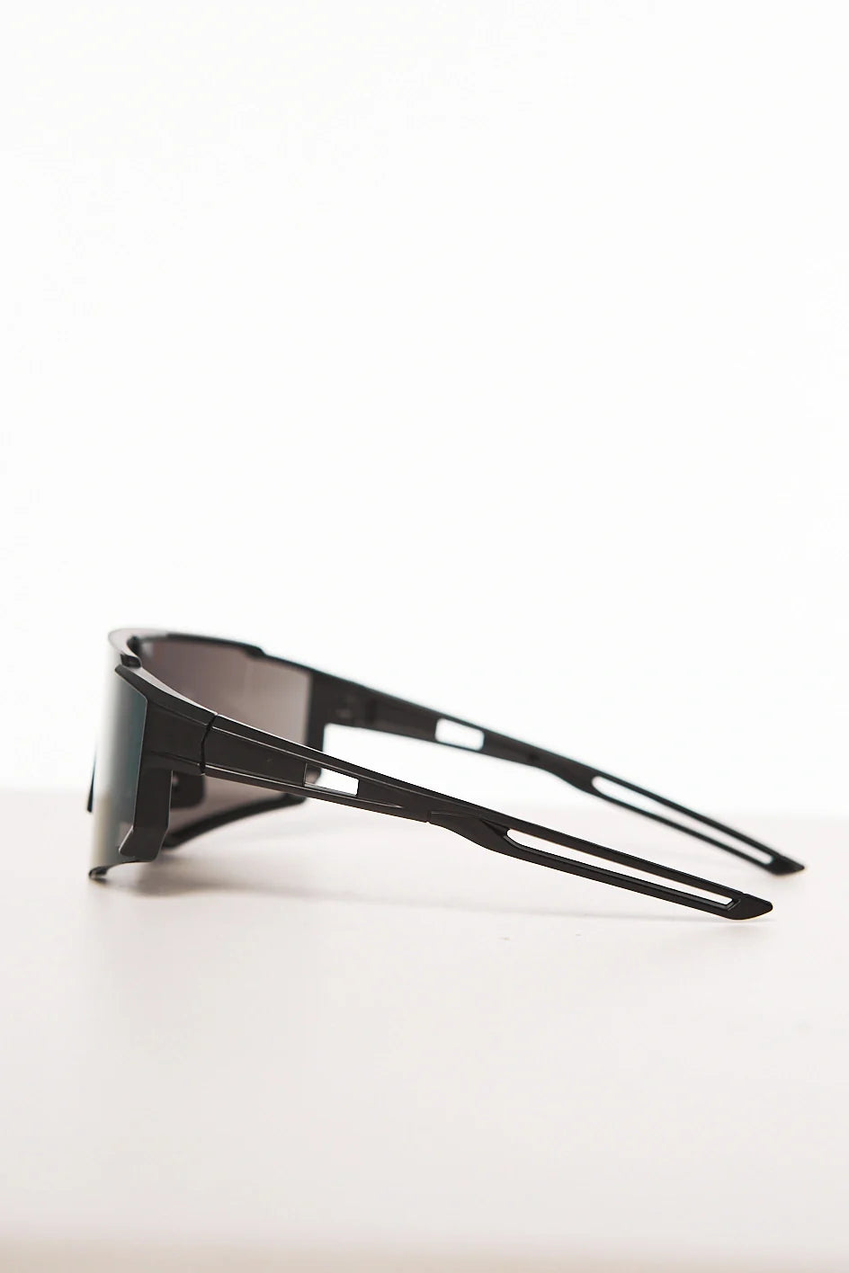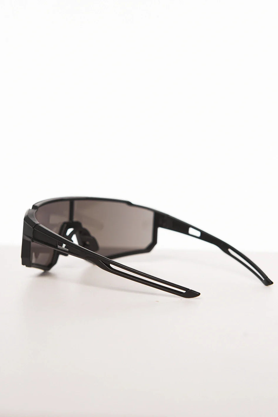 Sport-style photochromic sunglasses in a sleek black frame. Equipped with polycarbonate lenses that shield your eyes from sun, wind, and sand. UV 400 protection ensures maximum defense against harmful ultraviolet rays. Comes with a protective case.