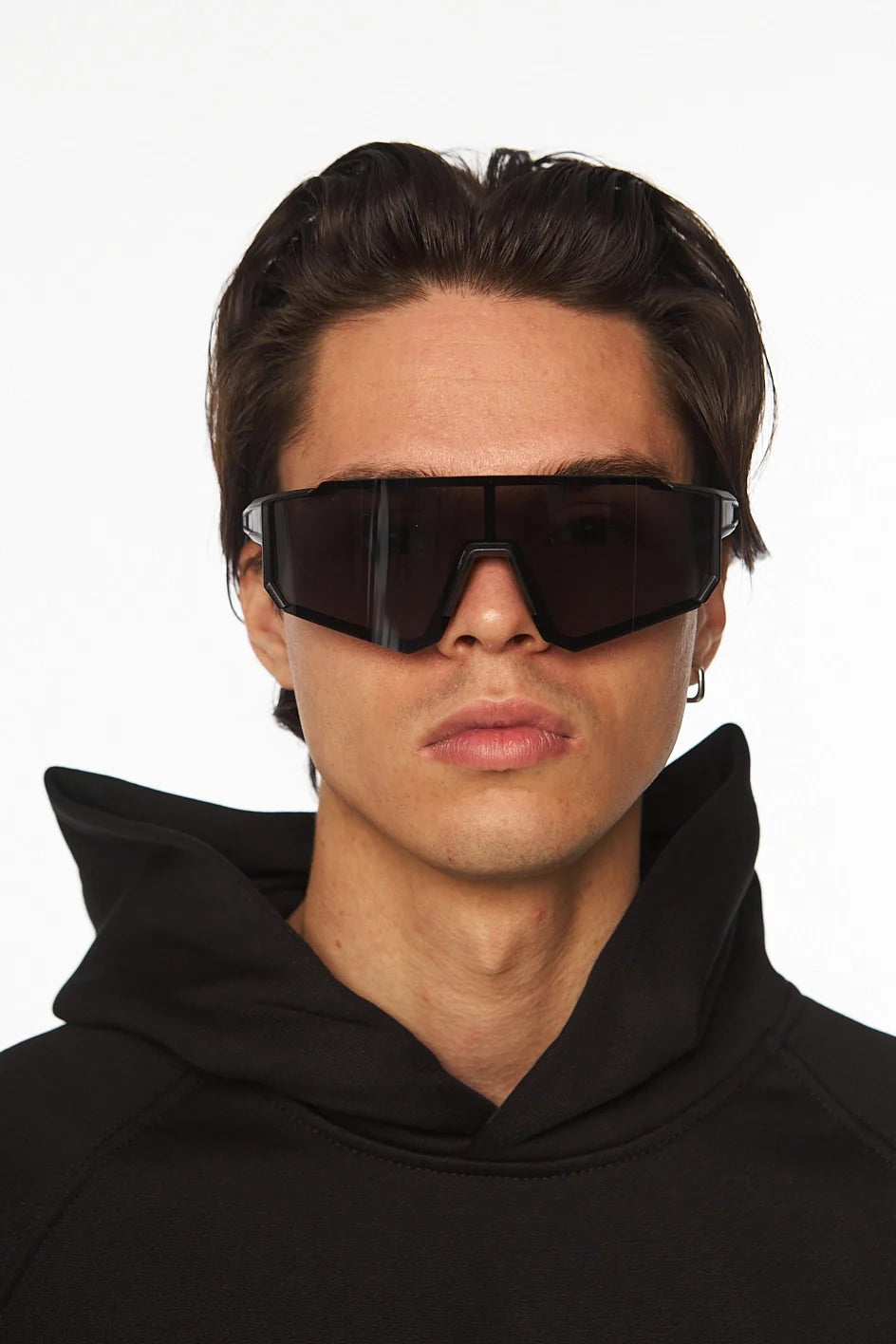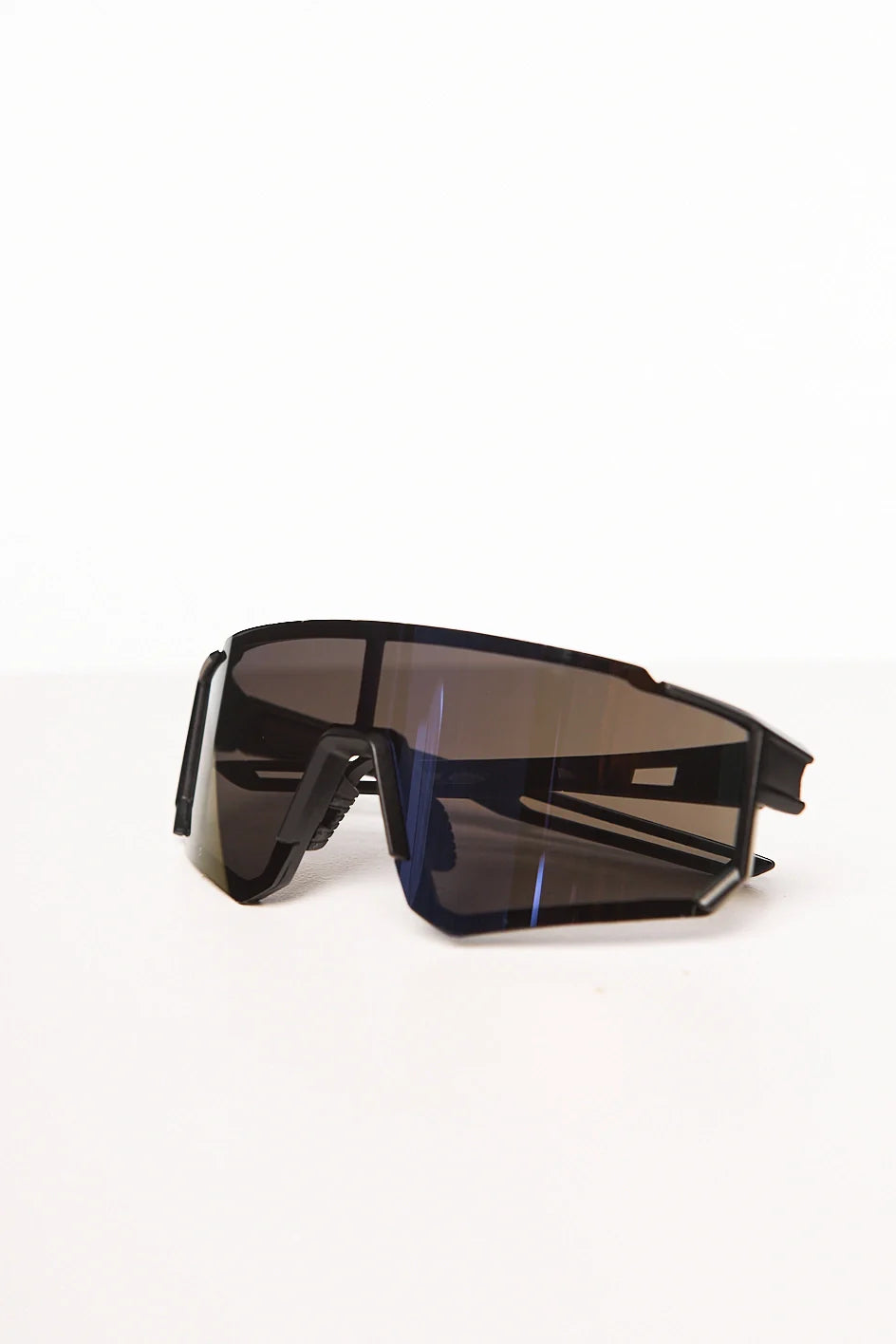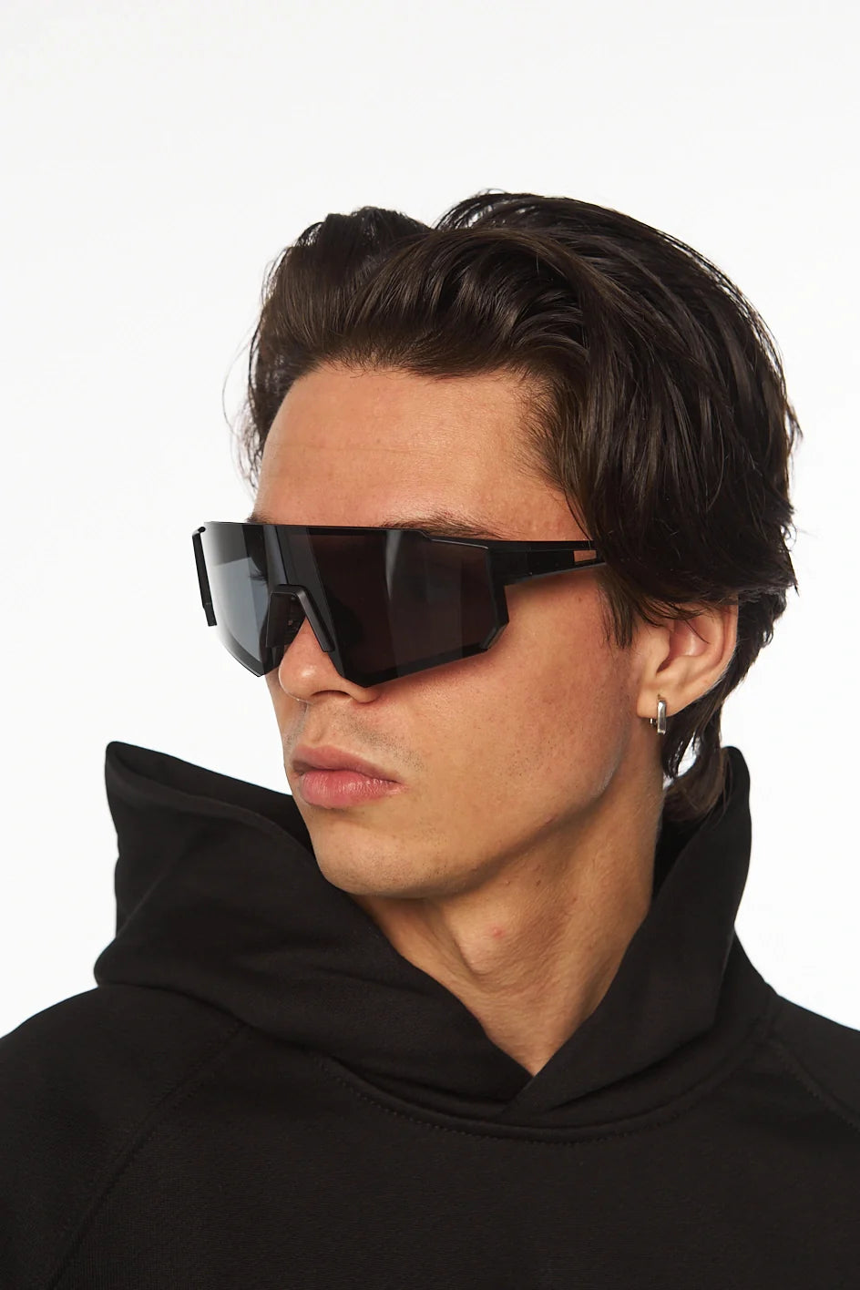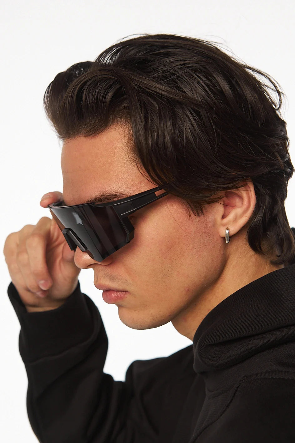 Sport-style photochromic sunglasses in a sleek black frame. Equipped with polycarbonate lenses that shield your eyes from sun, wind, and sand. UV 400 protection ensures maximum defense against harmful ultraviolet rays. Comes with a protective case.