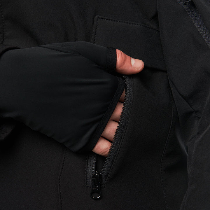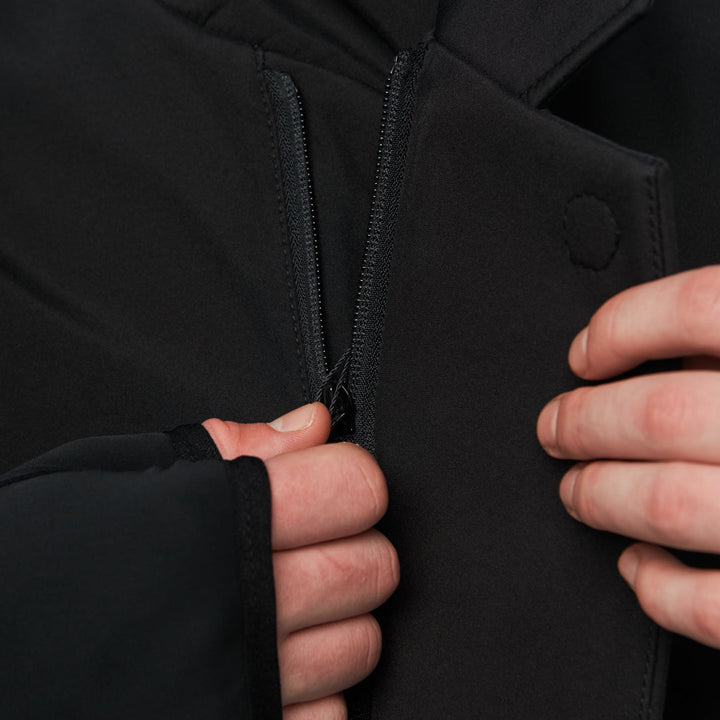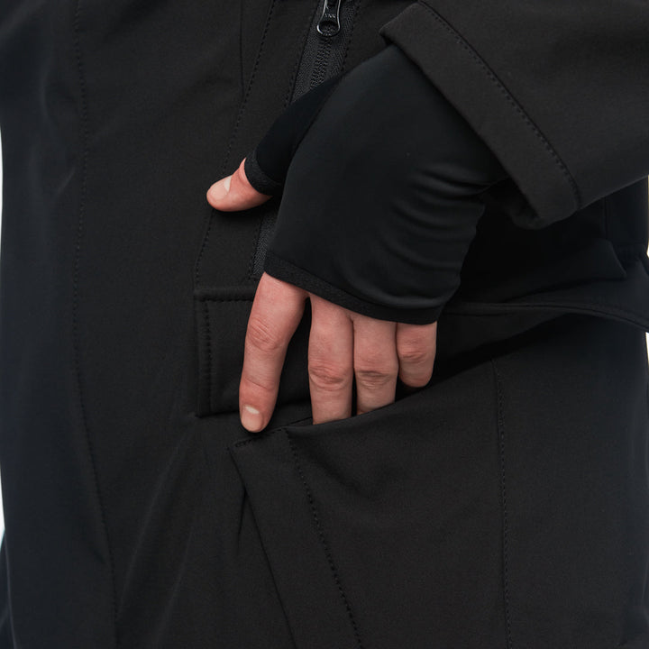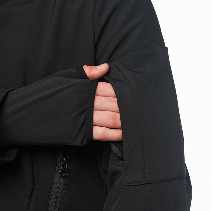 Softshell with fleece backing (100% polyester) — a dense, wind- and water-resistant fabric designed for active use. The outer layer is smooth and resistant to mechanical wear, while the inner layer is fleece-lined for added warmth. The fabric is non-stretch, holds its shape, blocks wind, and provides comfort during temperature fluctuations.