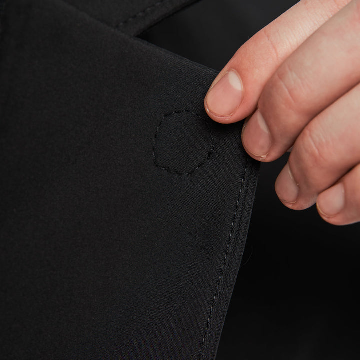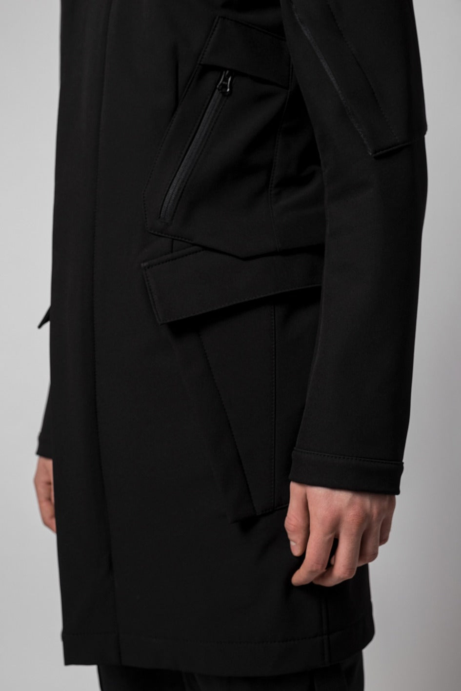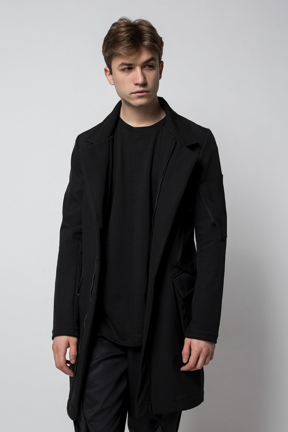 Tailored, mid-length trench coat. The main closure is a zipper. For extra protection in cool weather, magnetic fasteners are added to the top flaps. The coat features four patch pockets: two large ones at the waist, one zippered chest pocket, and one on the left sleeve.