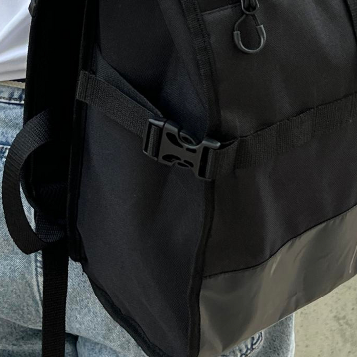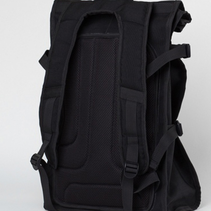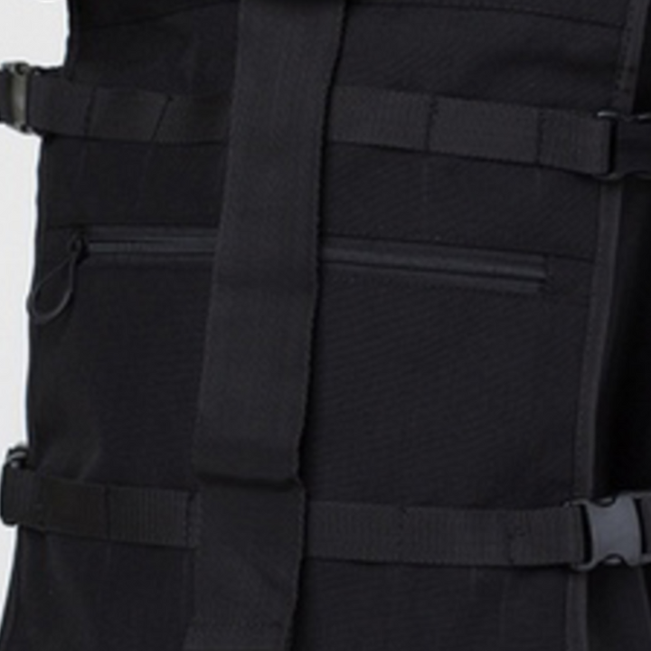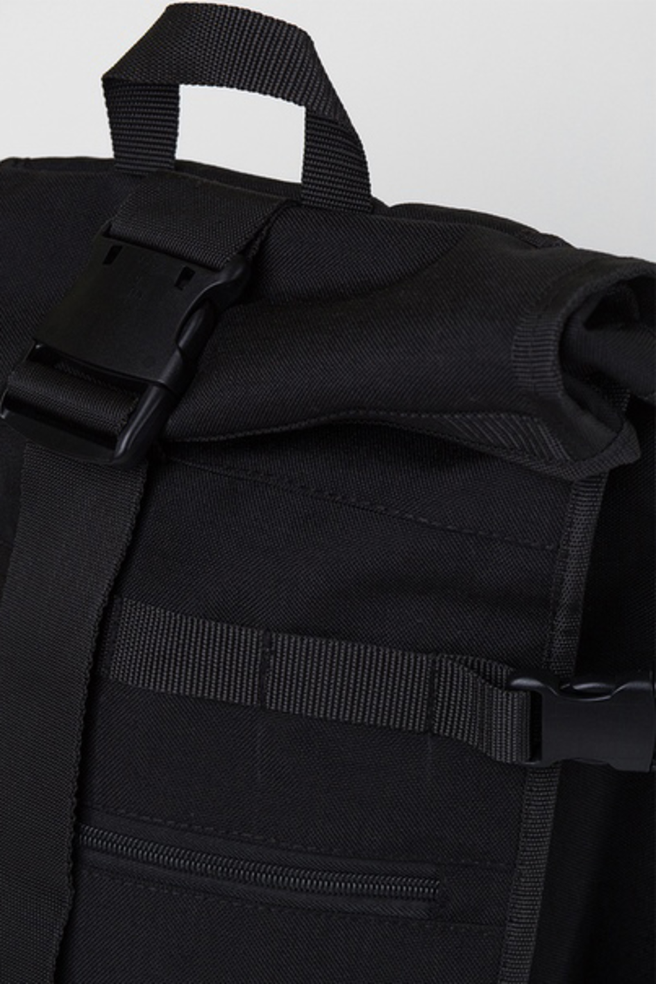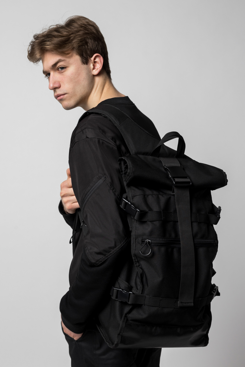 This rolltop backpack features a breathable padded back panel for added comfort. The base is reinforced with a PVC insert for extra durability. A wide top zipper pocket runs across the roll section, offering quick access. Inside, there's a laptop sleeve that fits devices up to 17”. Side pockets hold water bottles or small essentials, while the large front zip compartment provides extra storage. A MOLLE system on the front adds tactical flexibility.