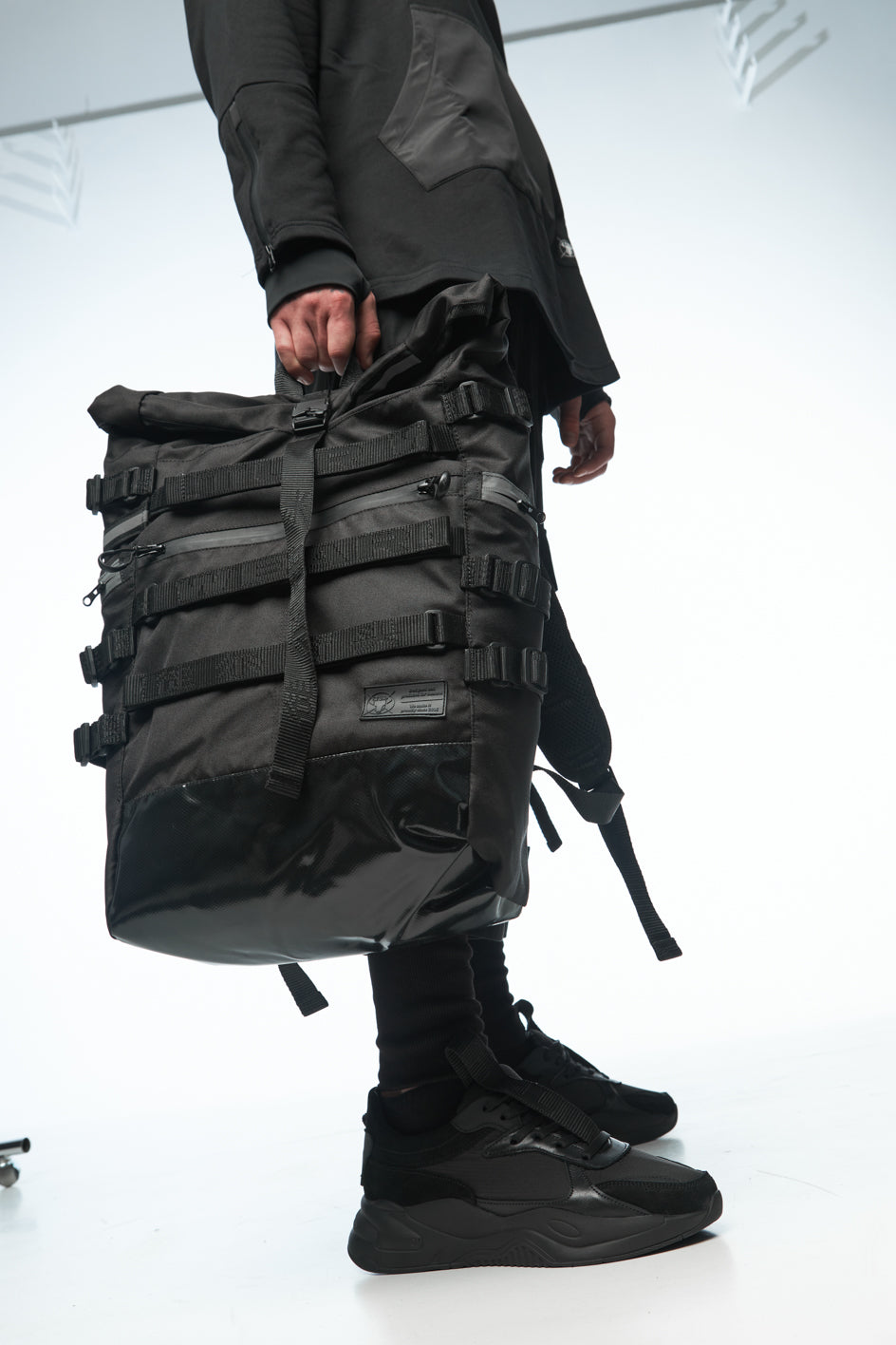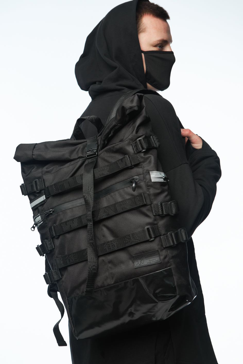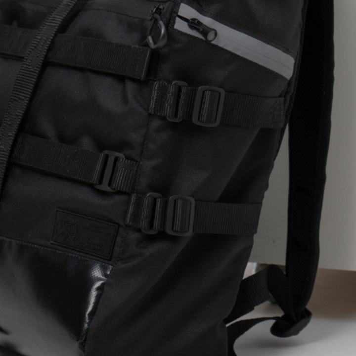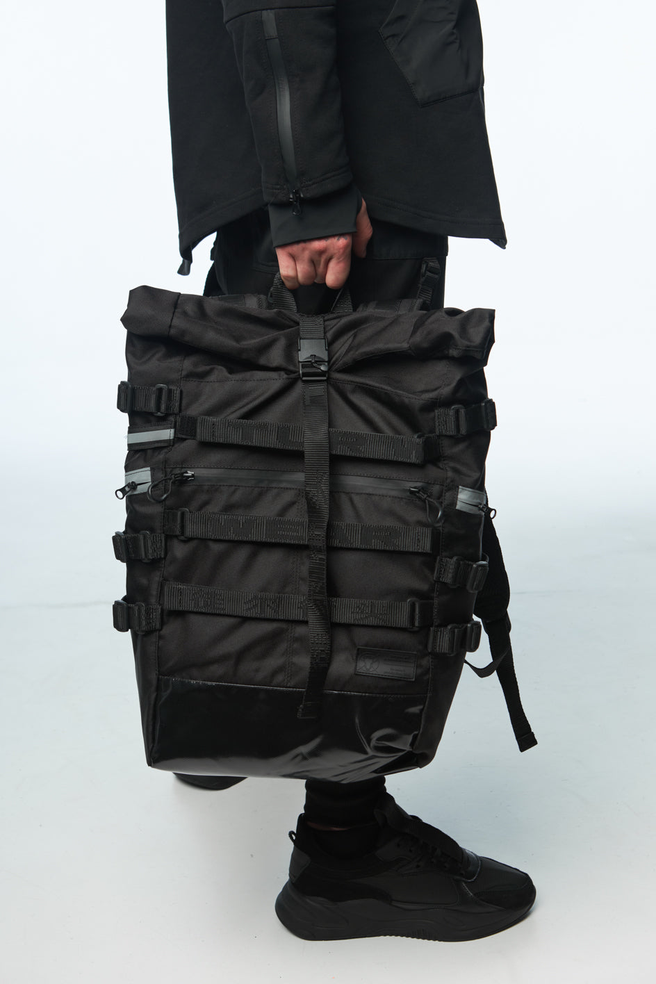 100% polyamide fastenings with magnets, polyester 100% straps, reflective waterproof zippers, branded webbing, 100% nylon Velcro.