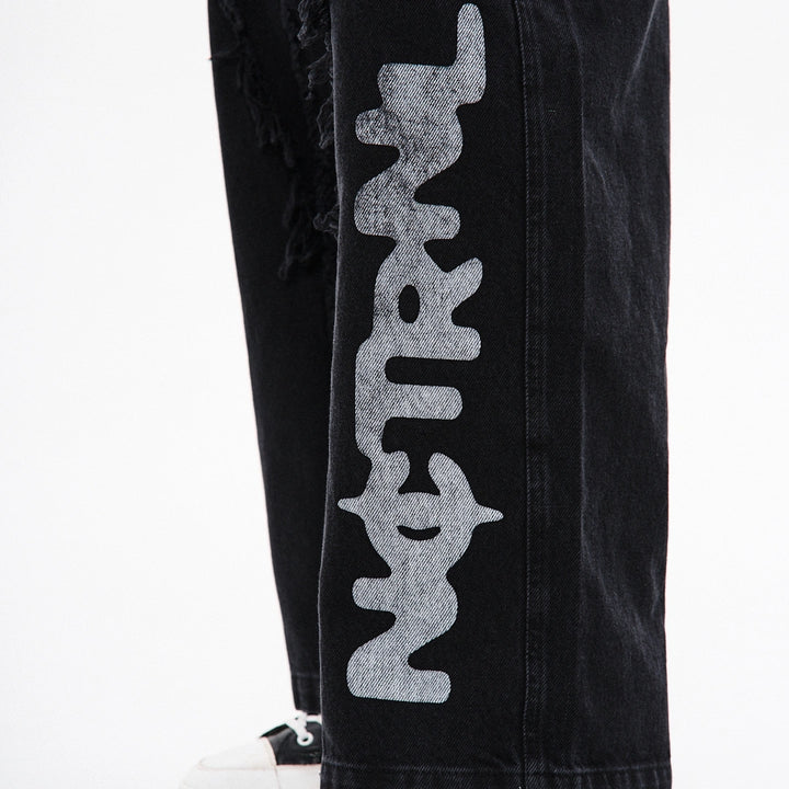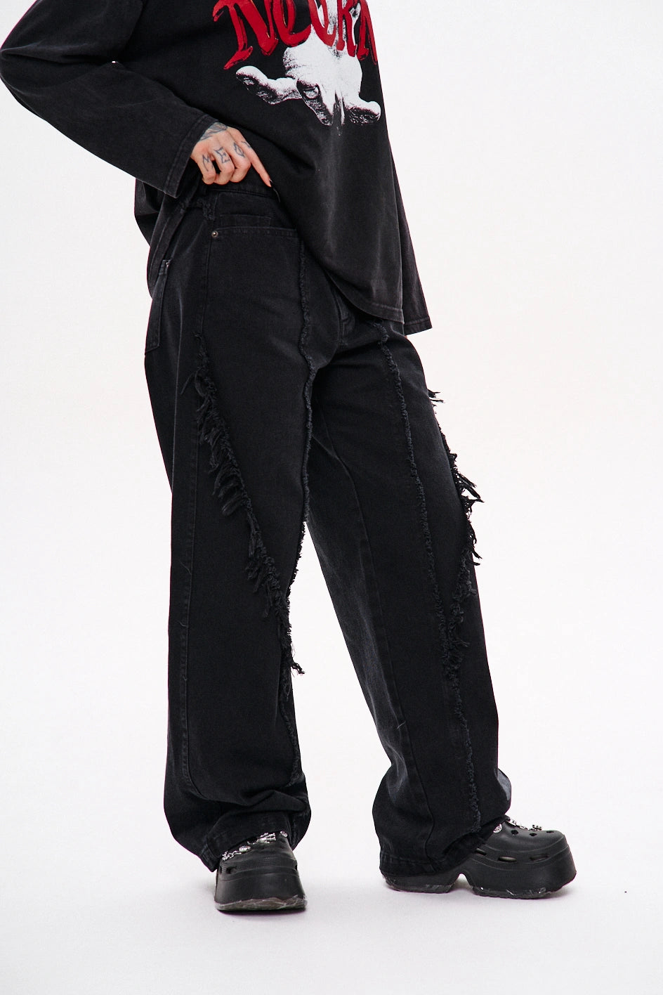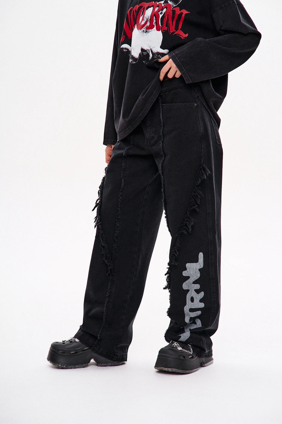 Key model features: Wide-leg jeans with a bold cut and raw edges. The upper front part features three pockets — two side pockets and a small coin pocket. The front of the model has a vertical seam and a decorative, irregular raw-edge stitch that adds texture and character. The back yoke features an unfinished lower edge and patch pockets with a print. An additional print is placed on the lower left front side. The waistband has belt loops, and the closure is a zipper.