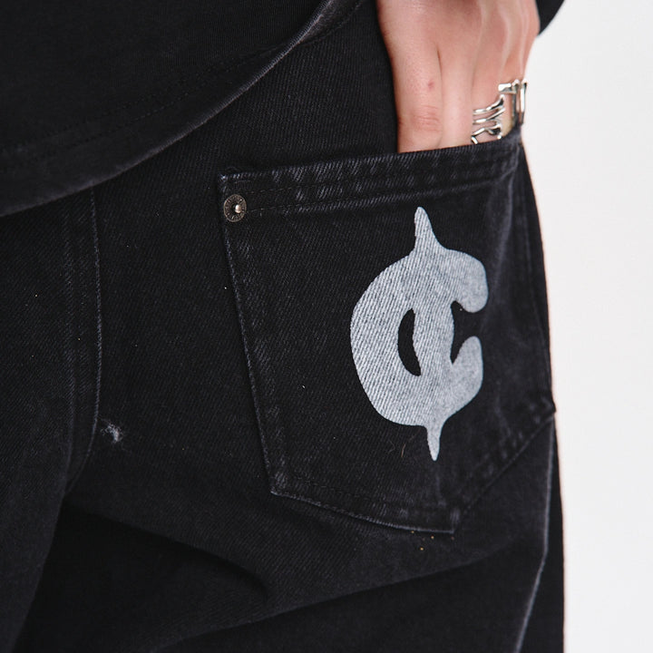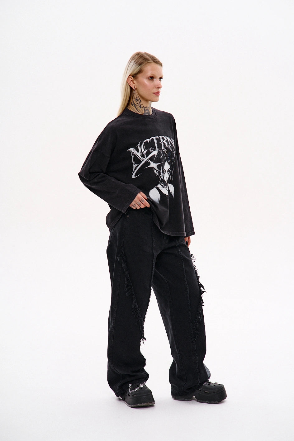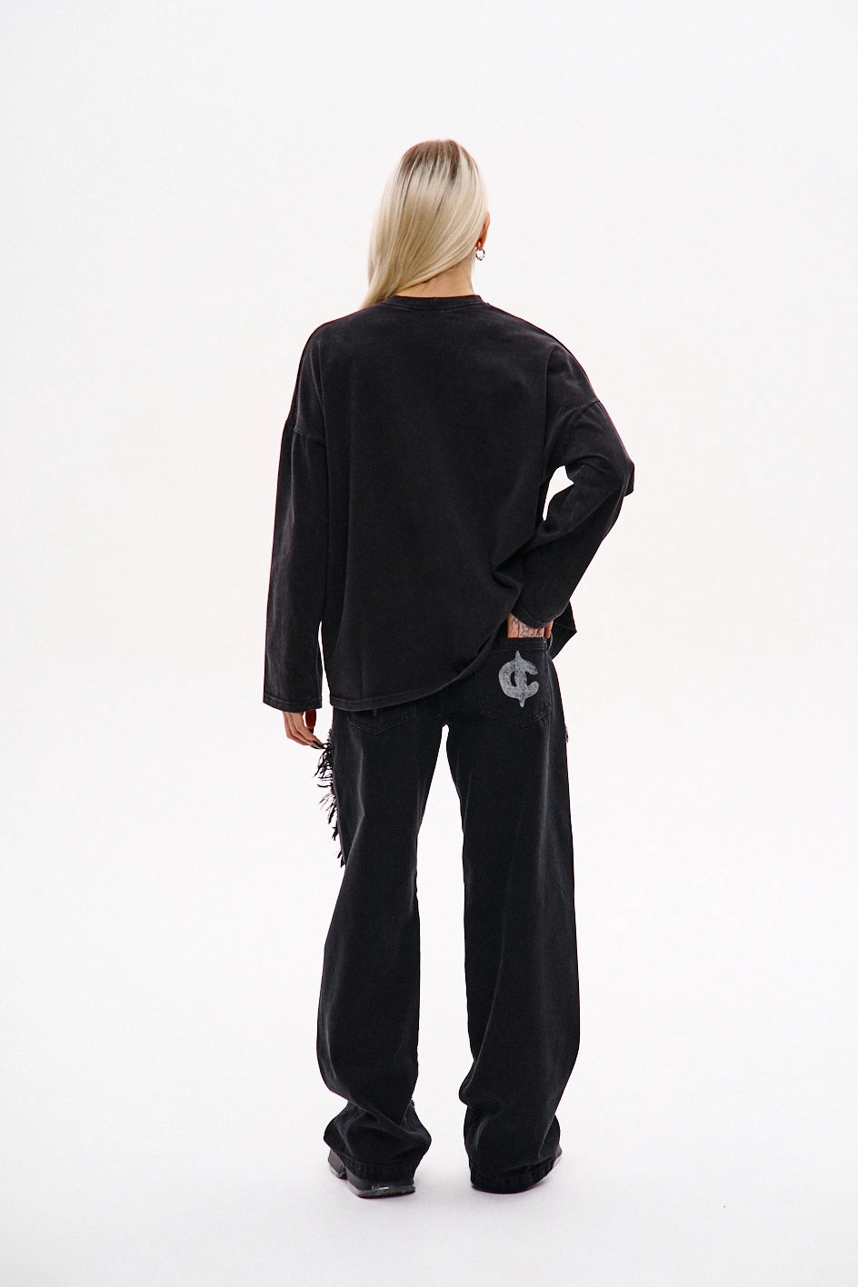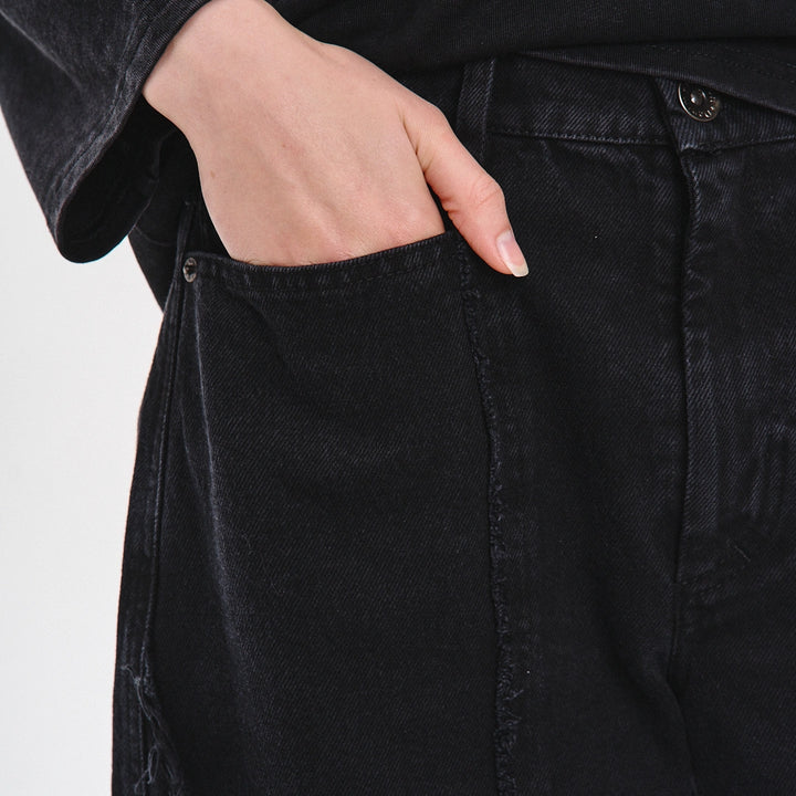 Key model features: Wide-leg jeans with a bold cut and raw edges. The upper front part features three pockets — two side pockets and a small coin pocket. The front of the model has a vertical seam and a decorative, irregular raw-edge stitch that adds texture and character. The back yoke features an unfinished lower edge and patch pockets with a print. An additional print is placed on the lower left front side. The waistband has belt loops, and the closure is a zipper.