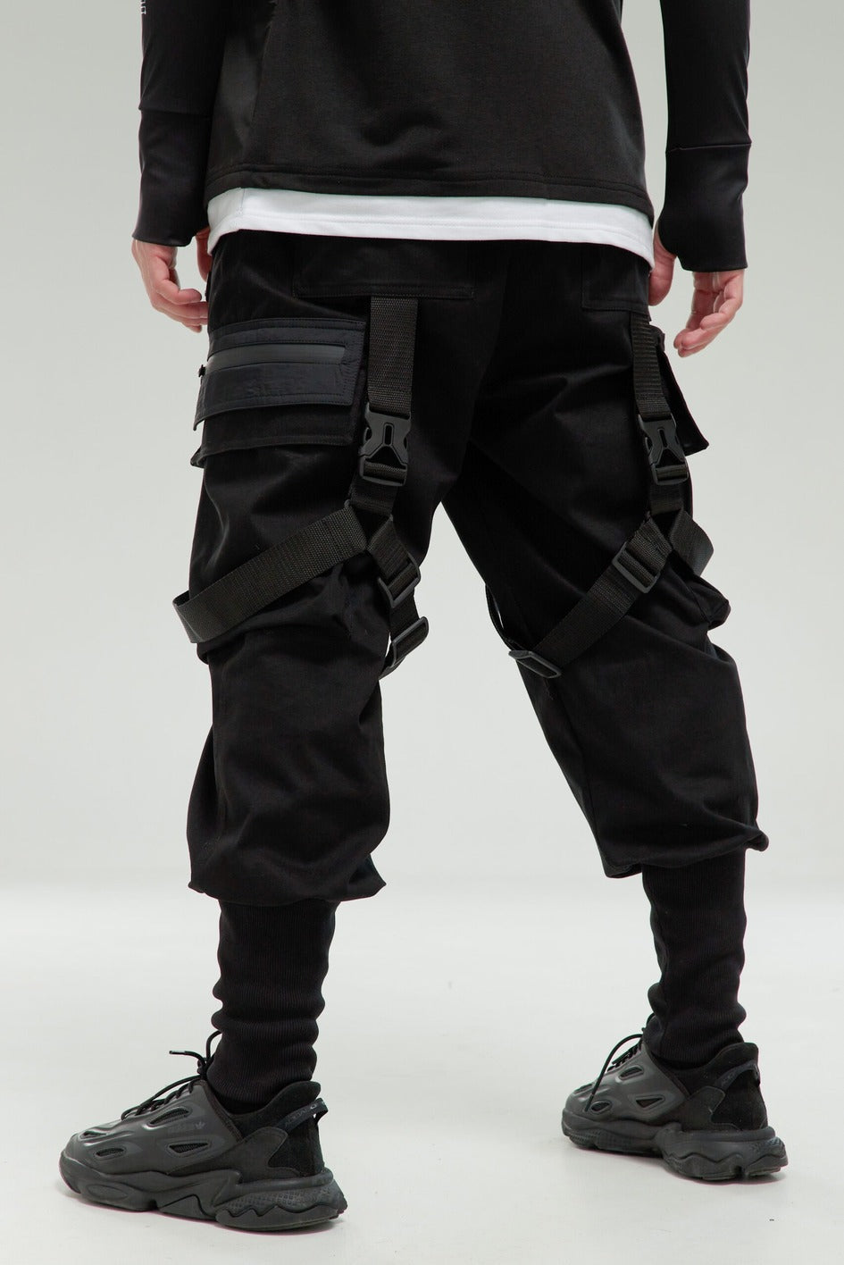 Loose-fit pants with tall cuffs, designed for those who value control, movement, and self-expression. The elastic waistband with an integrated strap, side-release buckle, and strap lock ensures a custom fit. Six pockets: two side-seam, two flap back pockets, and two voluminous cargo pockets. The left pocket is dual-layered: a rubberized zip wallet + large cargo pocket. The right side features sections for phone and earbuds.