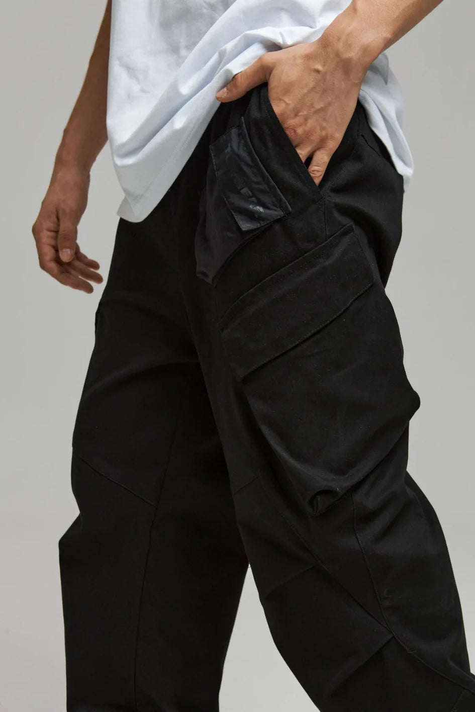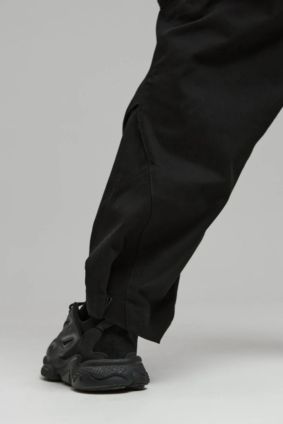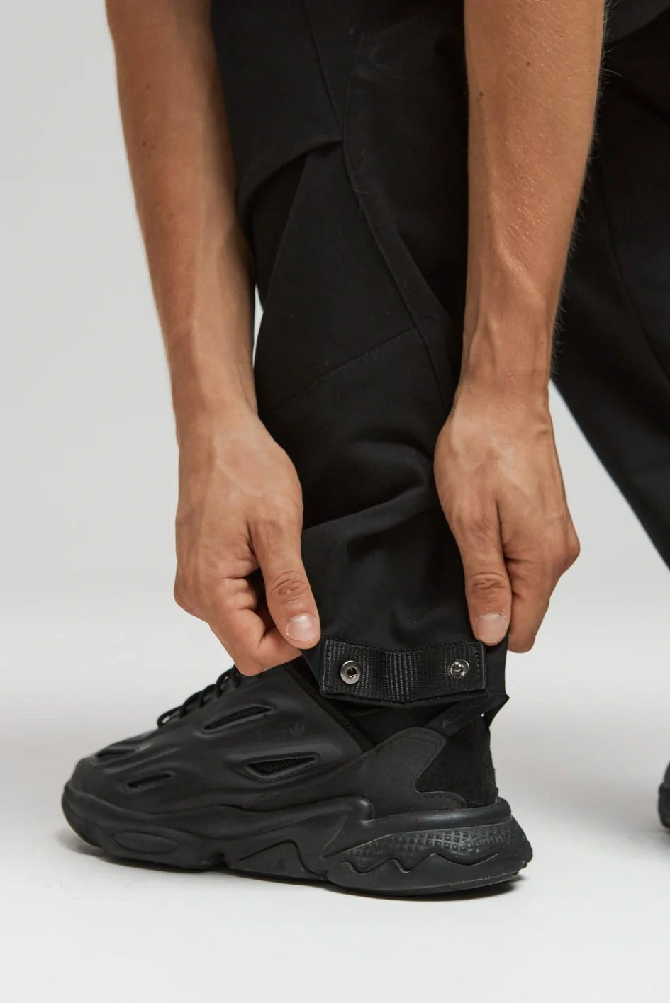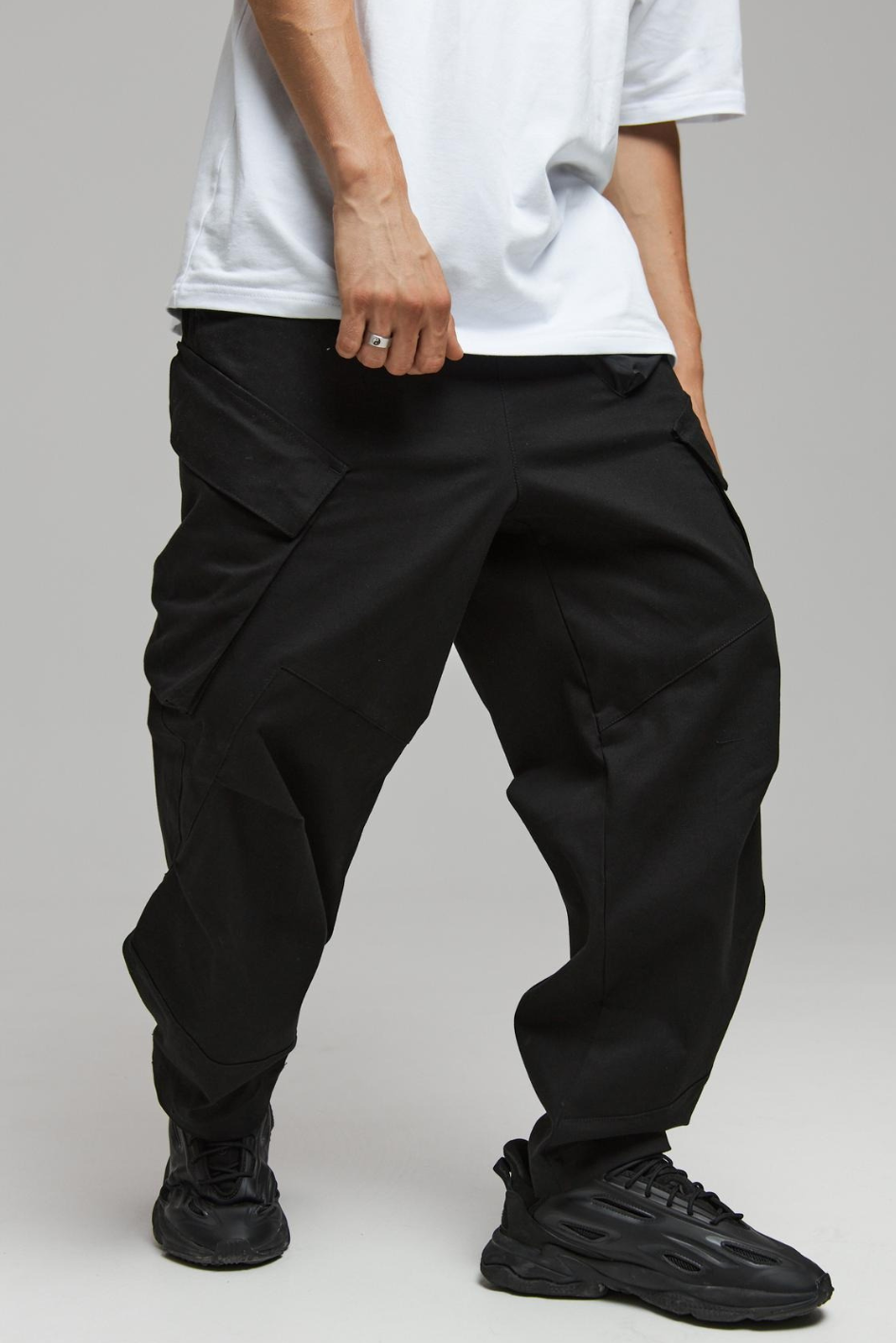 On the front left — a compact pocket with a flap and magnetic closure made of crinkled fabric, perfect for a wallet or small items. The flap is adorned with the TUR WEAR logo print. On the right, below the waistband — a belt strap with a semi-ring for securing keys or a Saifu wallet. The bottom width of the pants is adjustable with buttons — customize the fit to your rhythm.