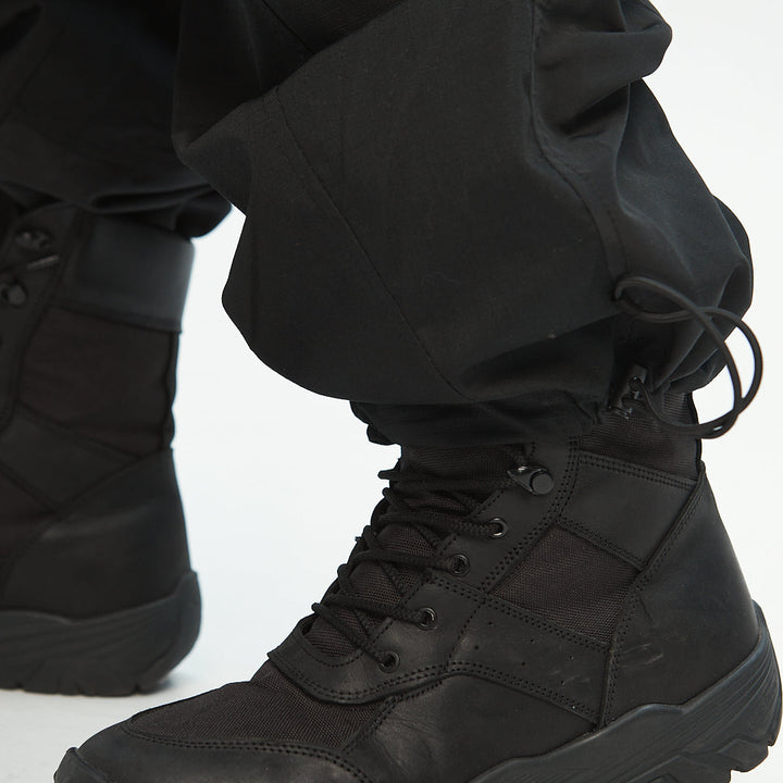 The pant cuffs feature adjustable drawcords with stoppers to fit over footwear or customize the silhouette.