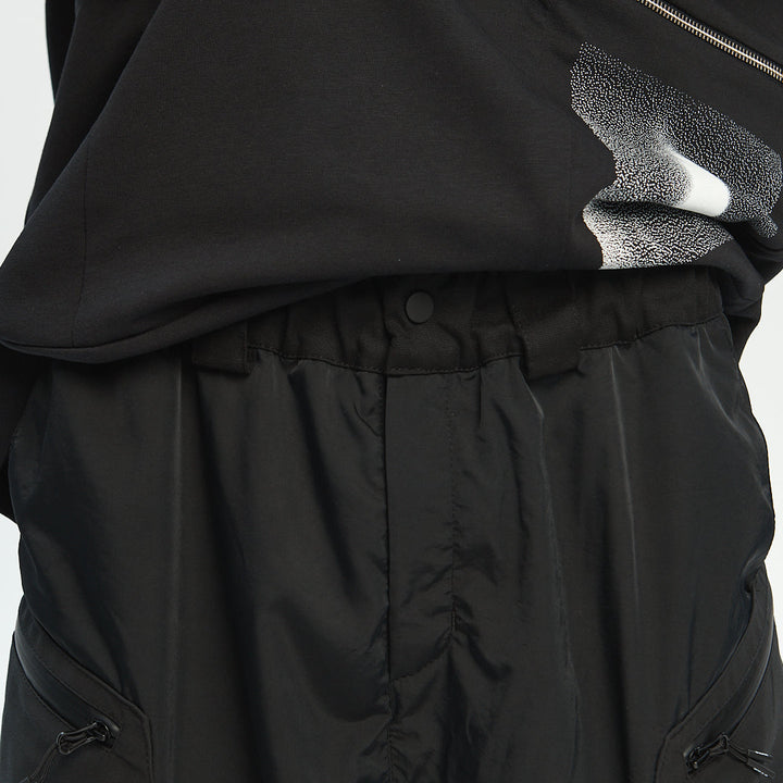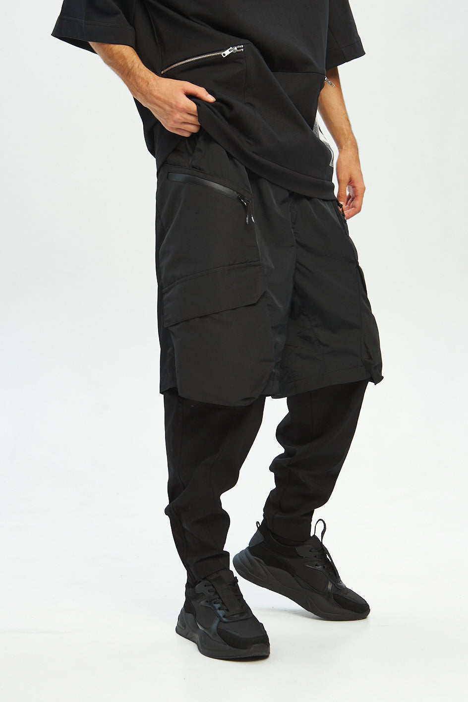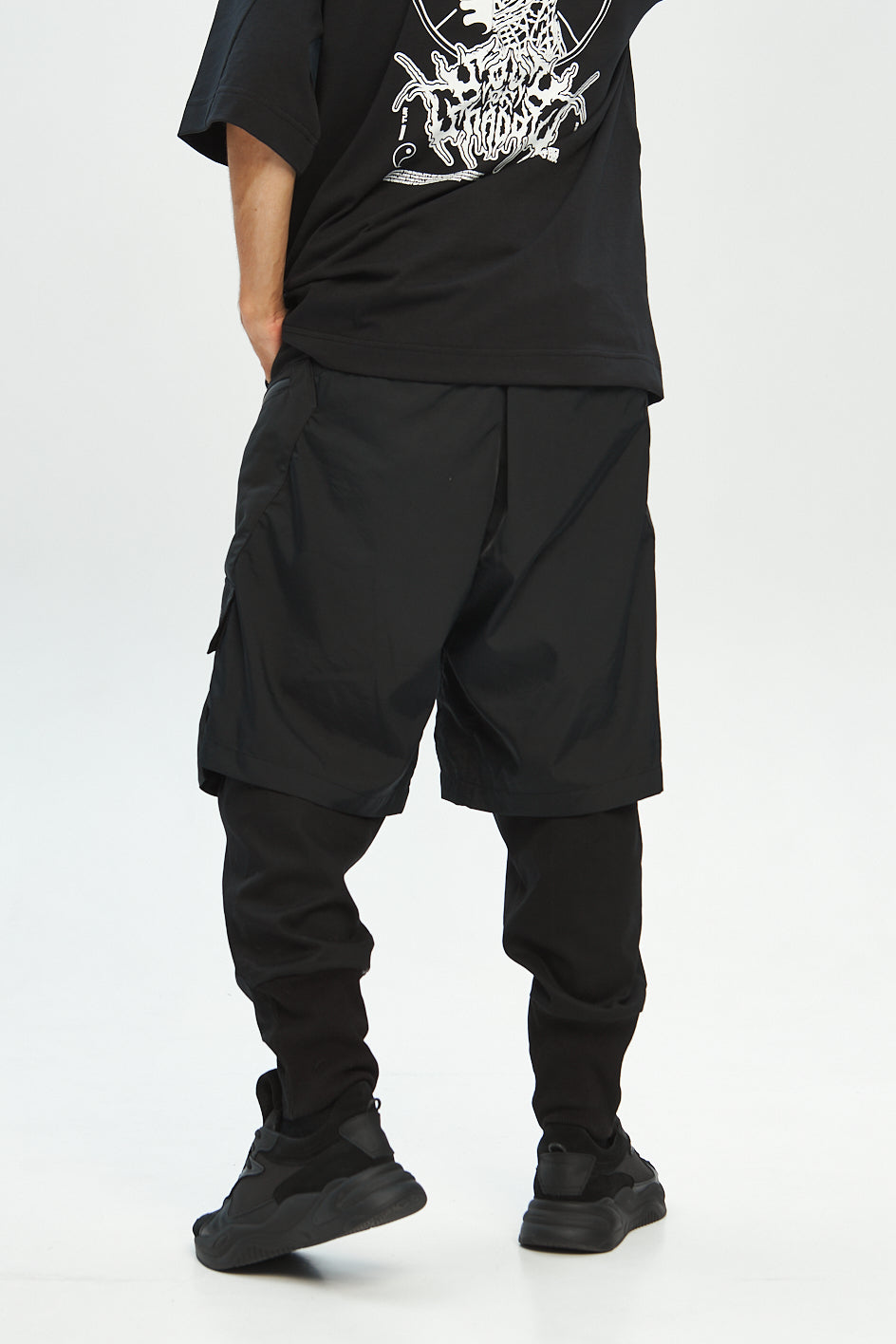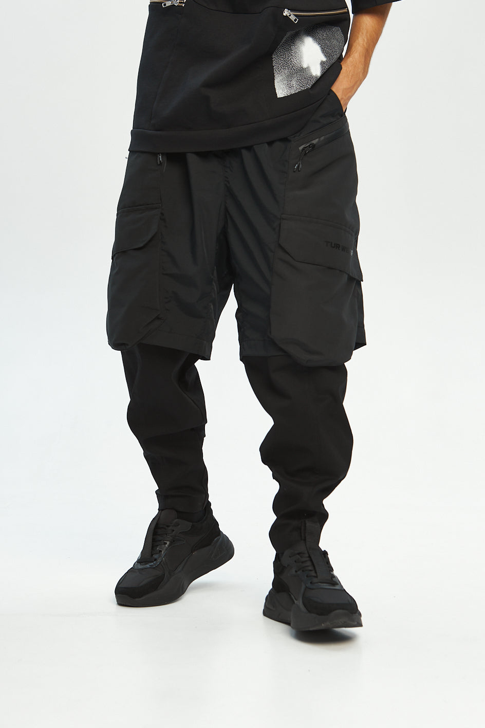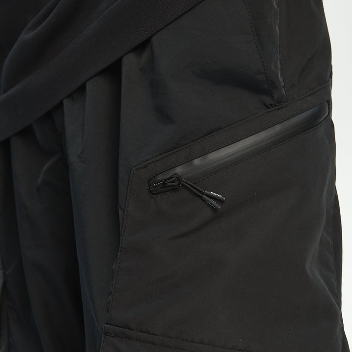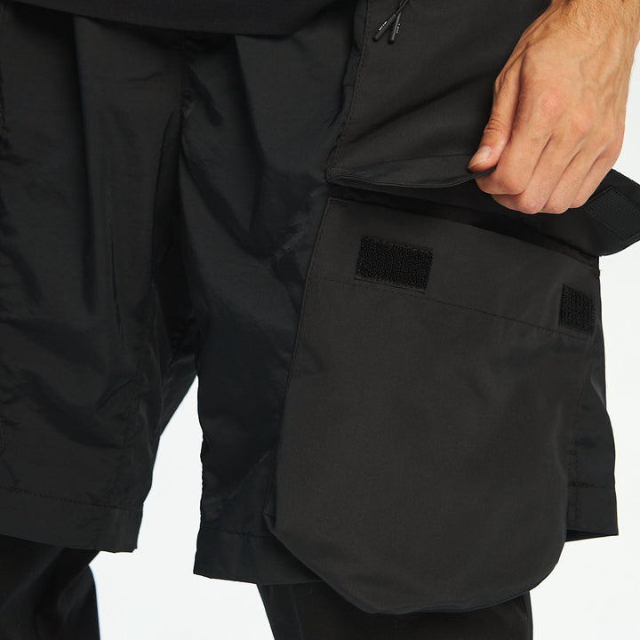 Loose-fit cargo pants made of two functional layers: the top resembles shorts made of crinkled shell fabric, while the bottom consists of pants made from stretch canvas. This layered construction adds volume and creates a unique, multi-dimensional silhouette.